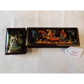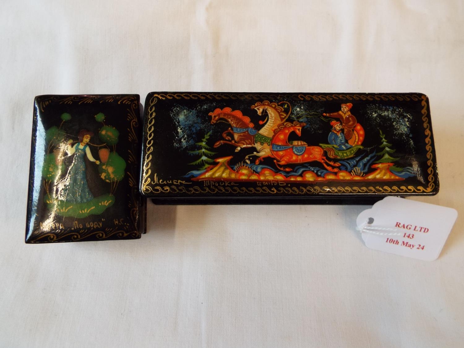 Two Russian black lacquered boxes with pictorial decoration