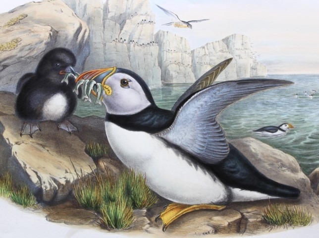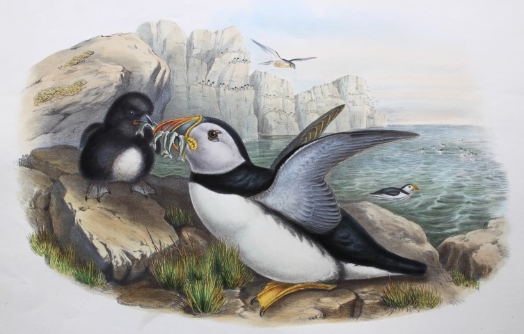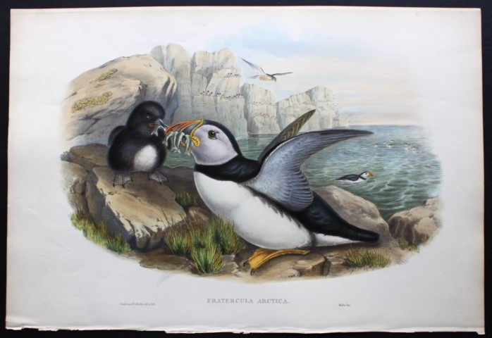 This original lithograph of the Puffin with chick (Fratercula Arctica) is from John Gould's Birds of Great Britain, issued in 25 parts between 1862 and 1873. This is plate 51 from volume 5 and was drawn and lithographed by John Gould & HC Richter.