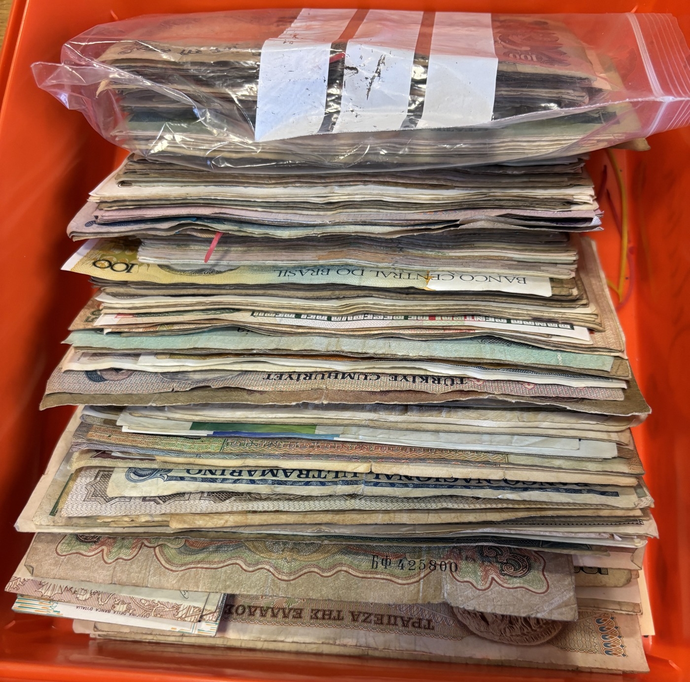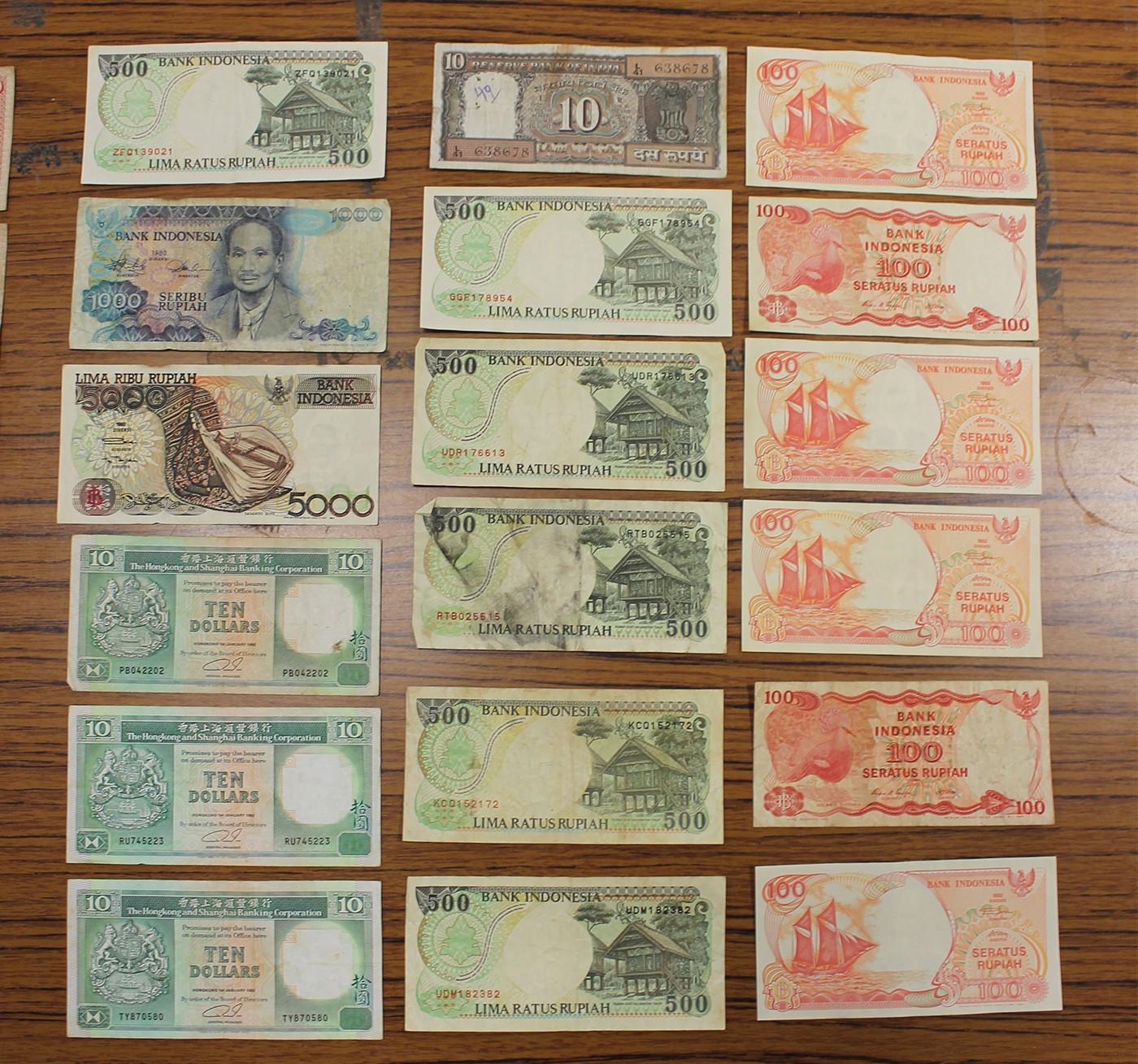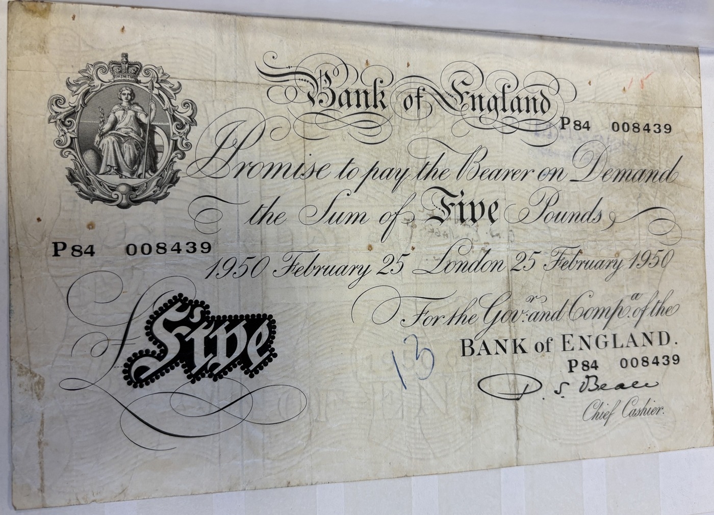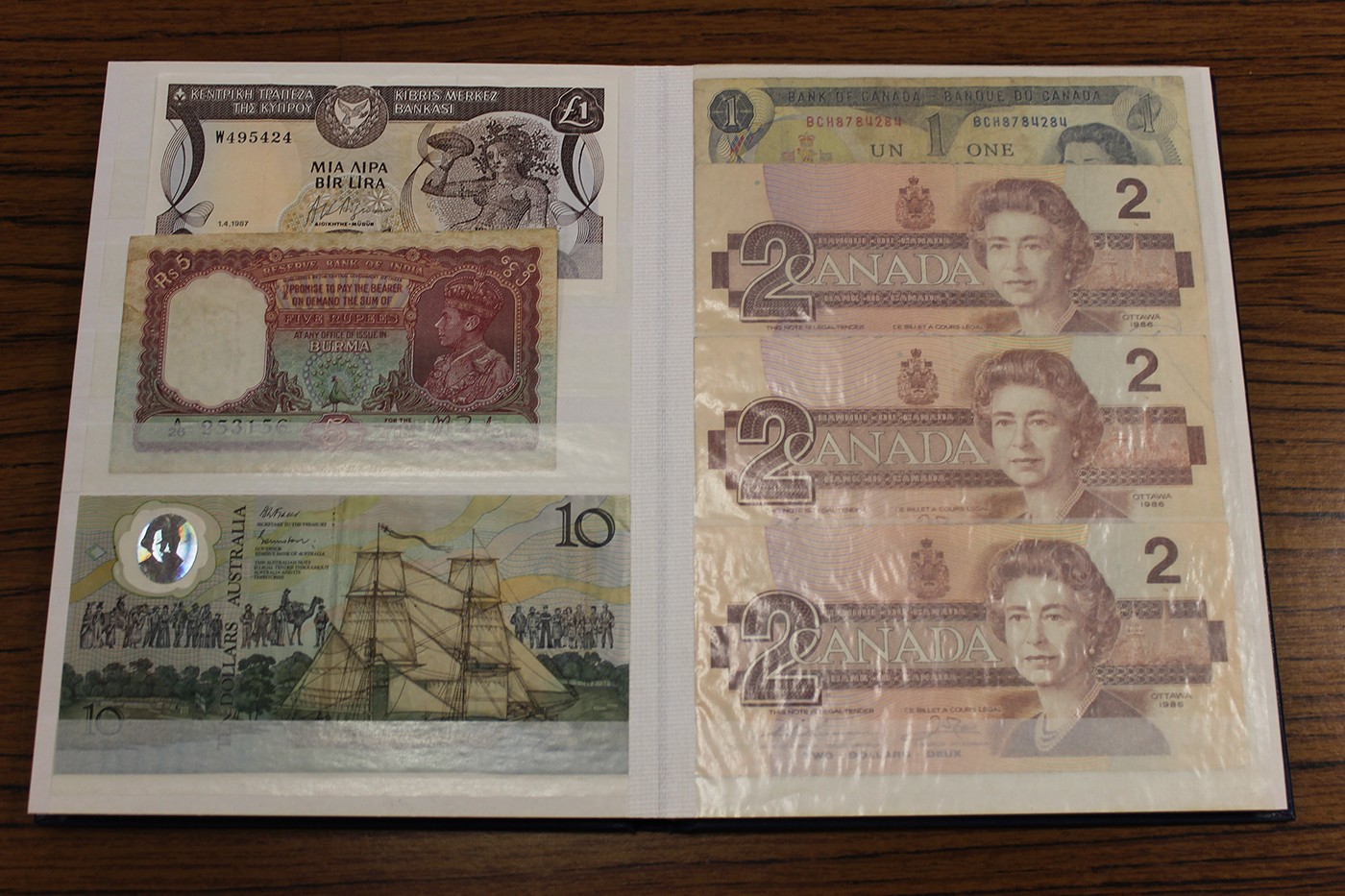 Collection of mostly commonwealth issues, generally very fine with some better in one album and loose in plastic tub, including Great Britain Beale 25th February 1950 £5 P84 008439 fine, O'Brien 21st February 1957 £5 A14 692861 fine, Gill 1st March 1988 £10 EZ44 686198 extremely fine, ranges of Canada, Eastern Caribbean Central Bank, Jamaica, Hong Kong, India and Greece. (½B)