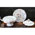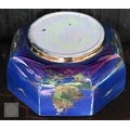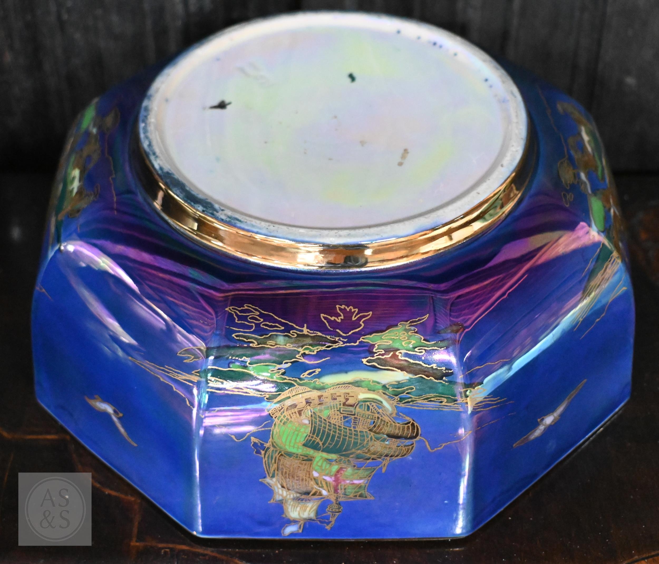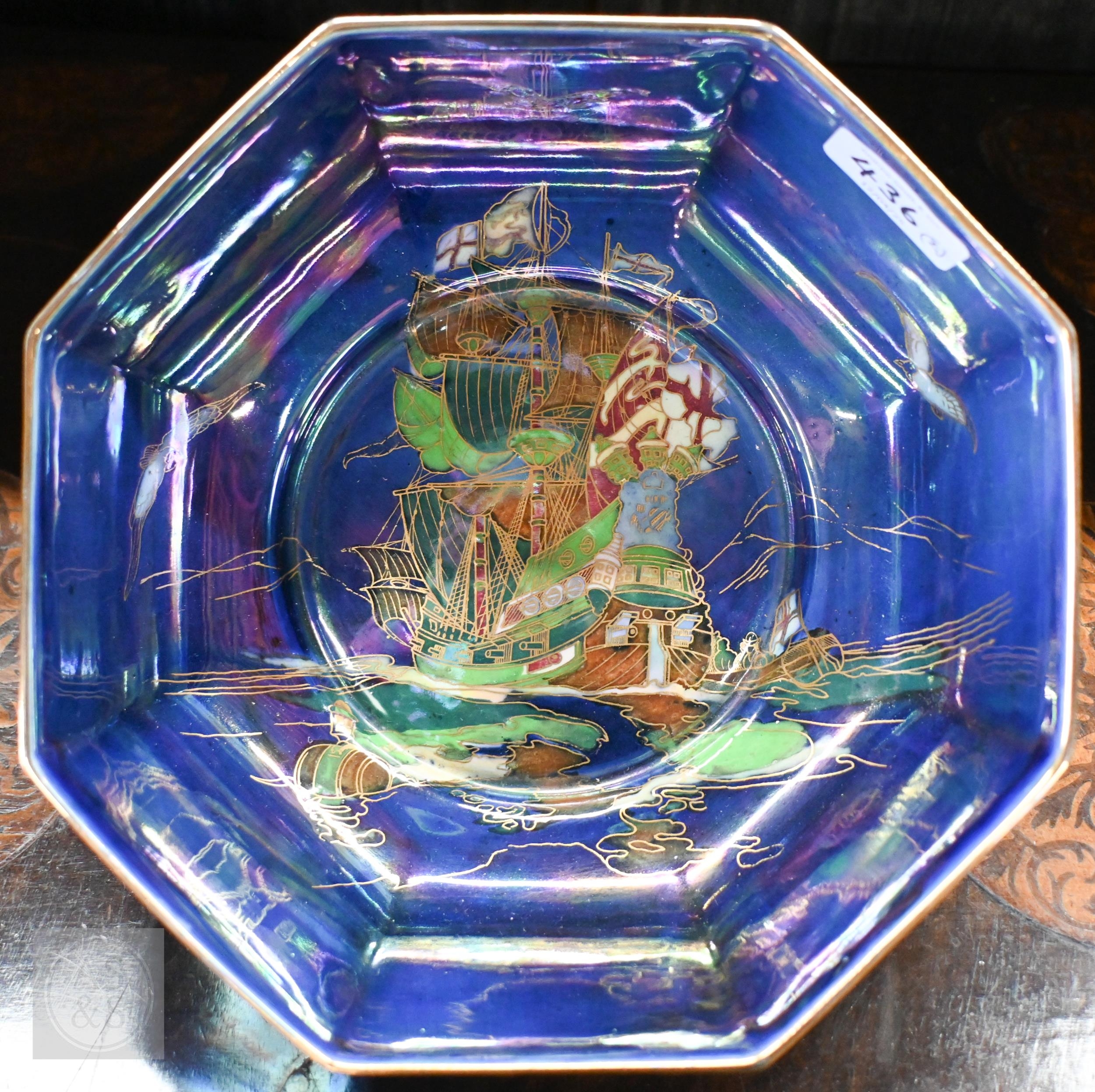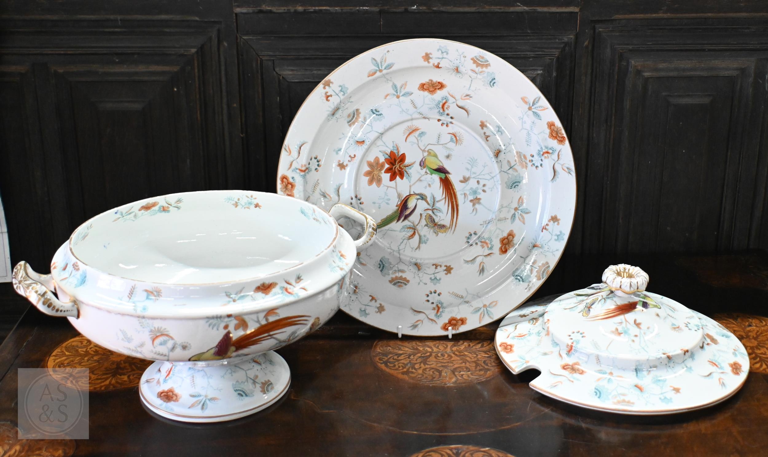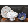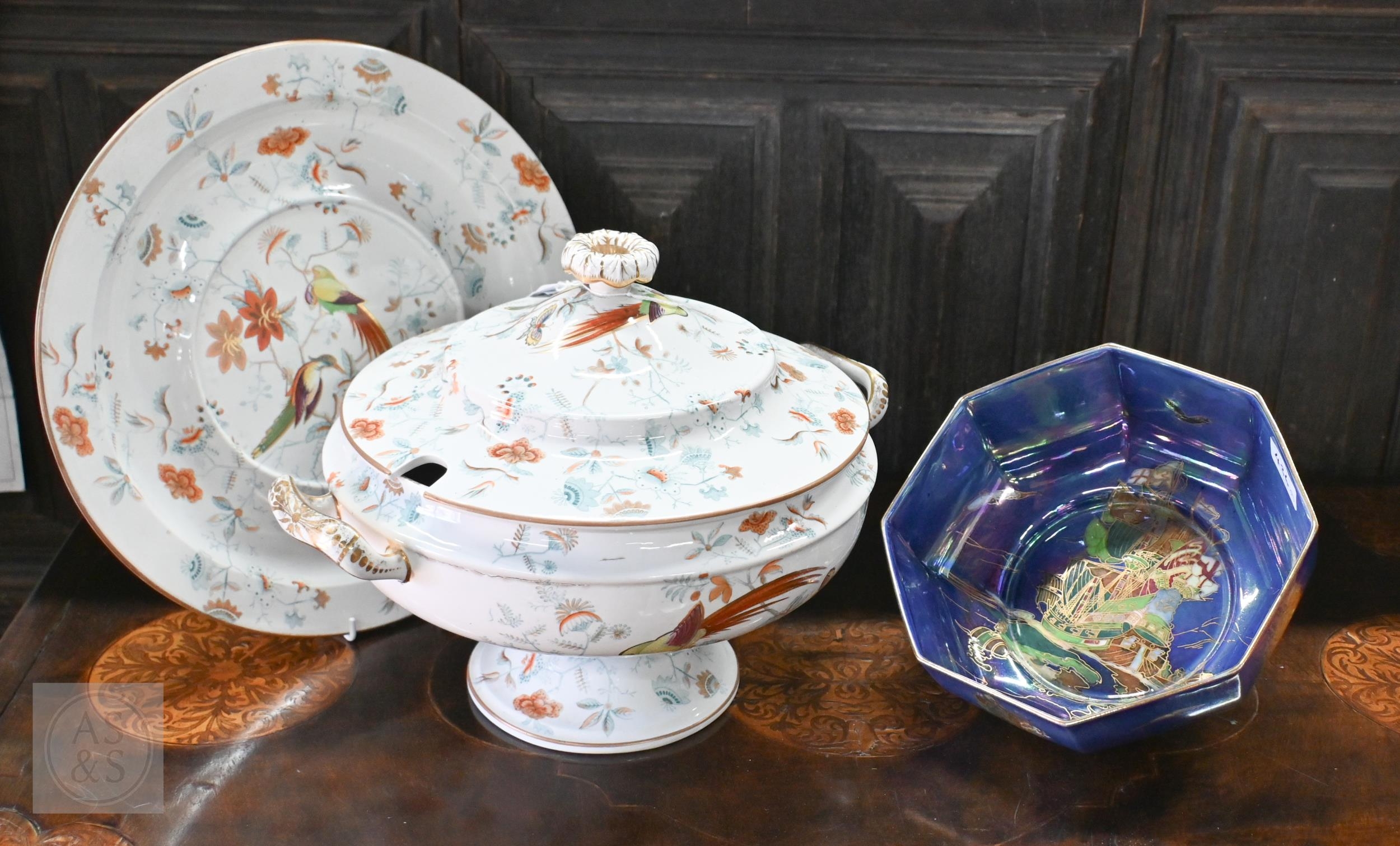 #A Victorian soup tureen and cover, printed with exotic birds and flowers, 26 cm high to/w a lustre-glazed octagonal fruit bowl, printed with galleons (2)