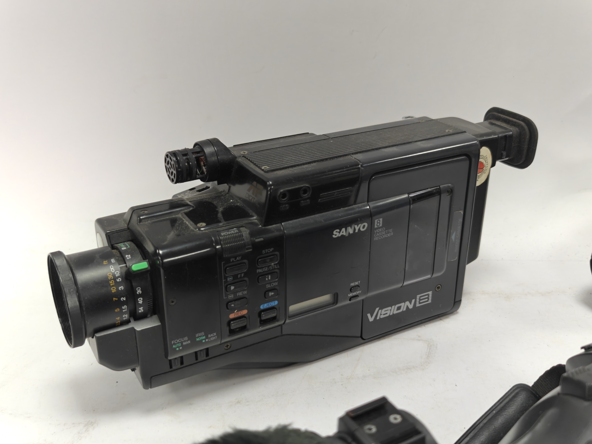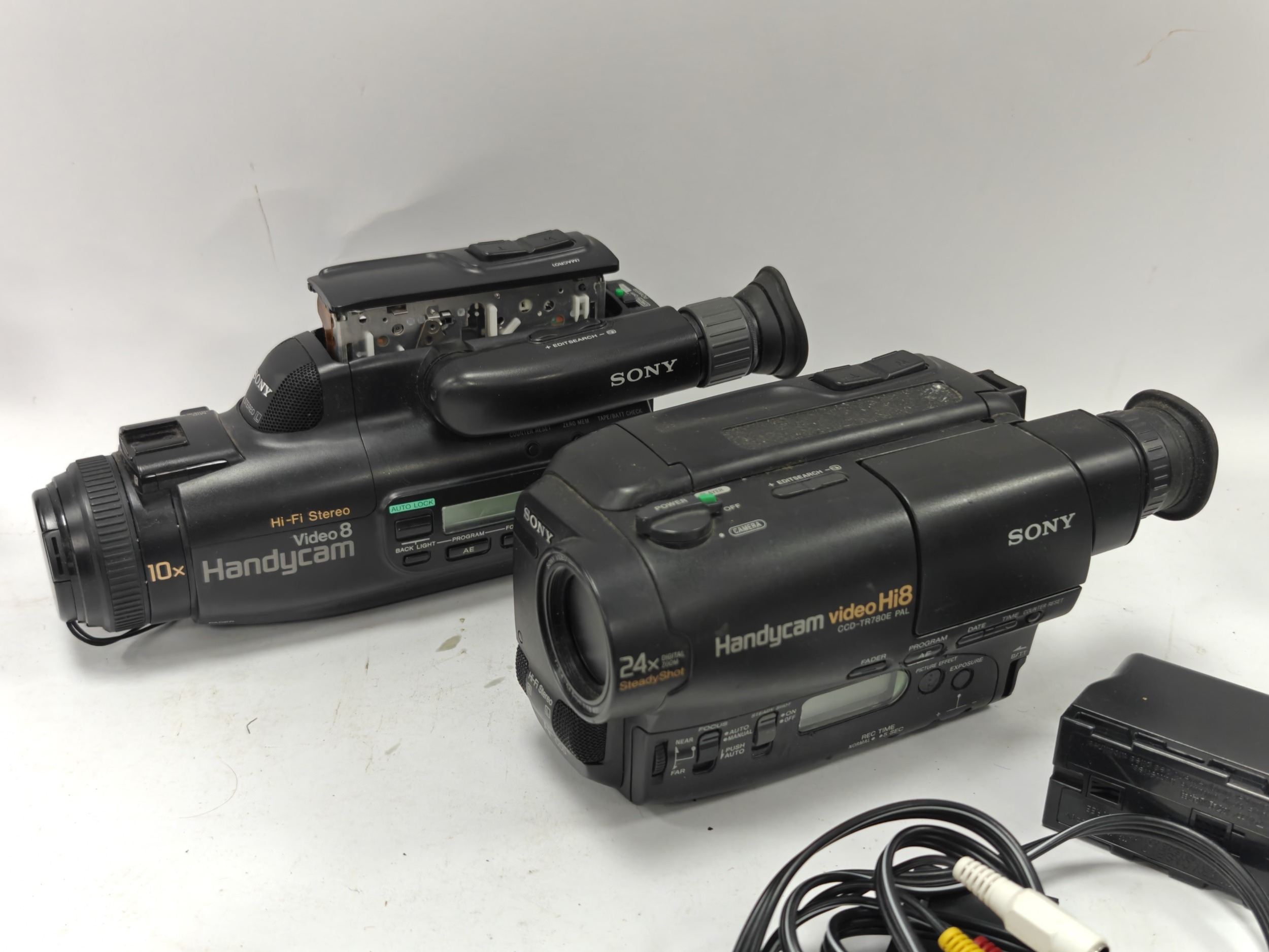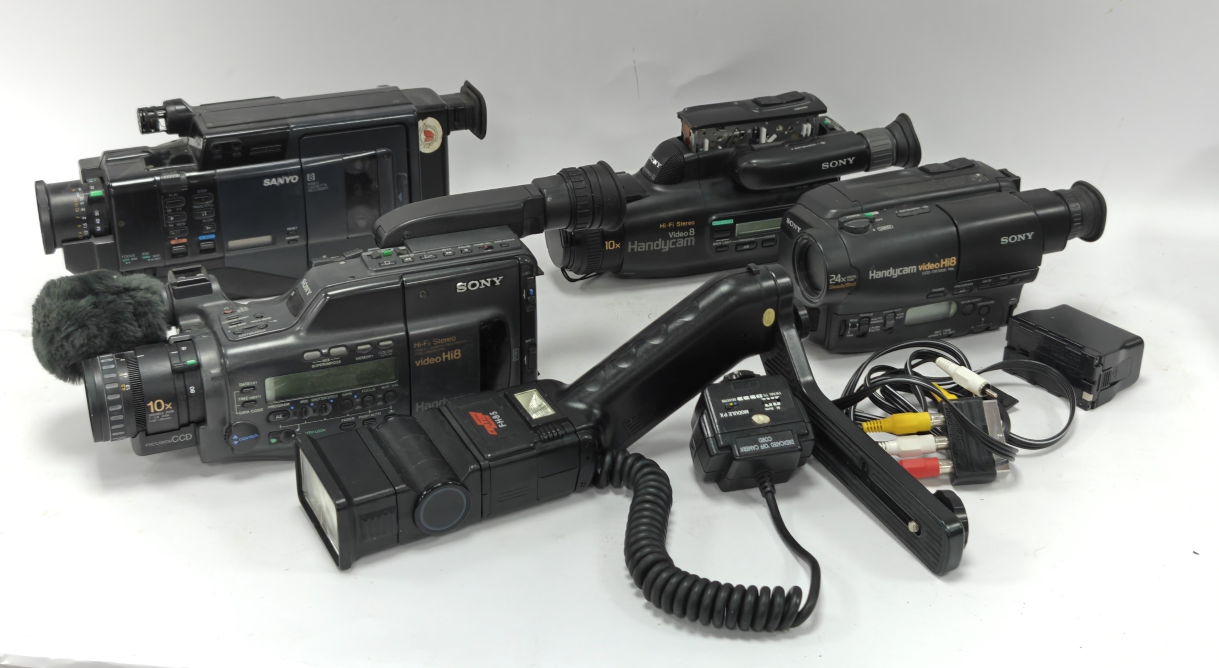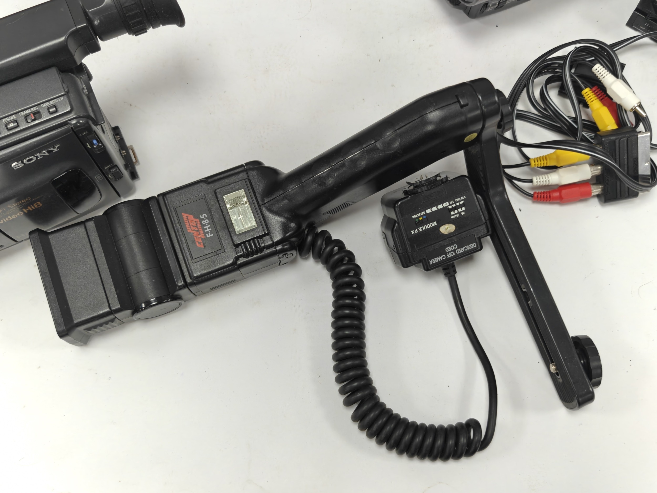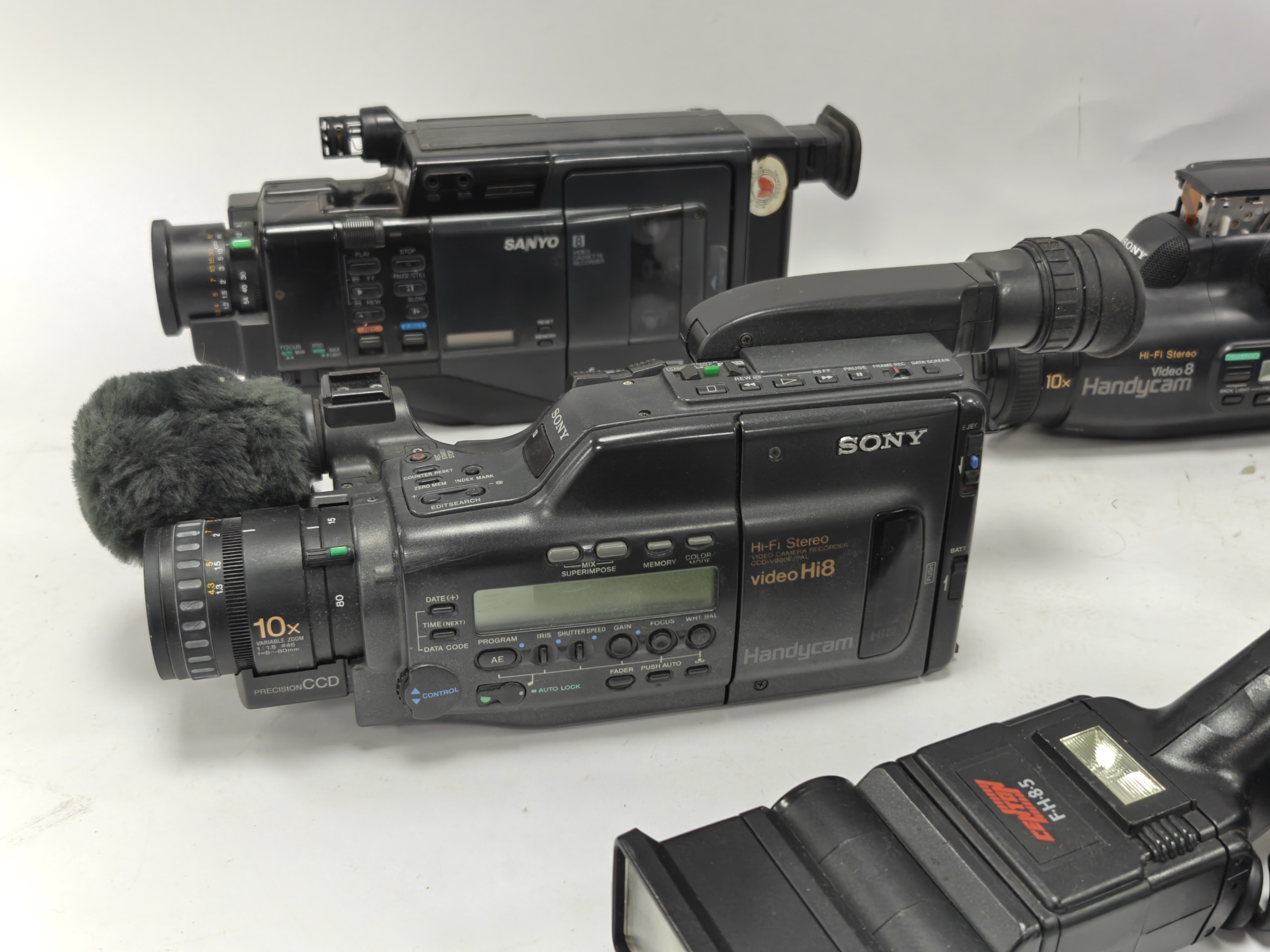 Video Camcorders to include Sony Video Hi8 Handycam CCD-V800E, Sony Handycam Video Hi8 CCD-TR780E PAL, Sony Handycam Video 8 CCD-FX500E, Sanyo 8 Video Cassette Recorder Vision 8 and a Centon F.H.8.5 Flash unit, Untested. One Box