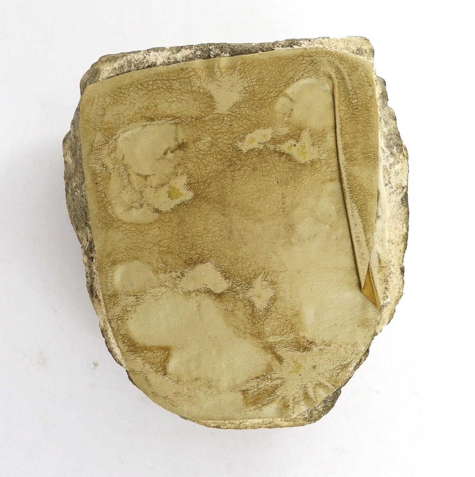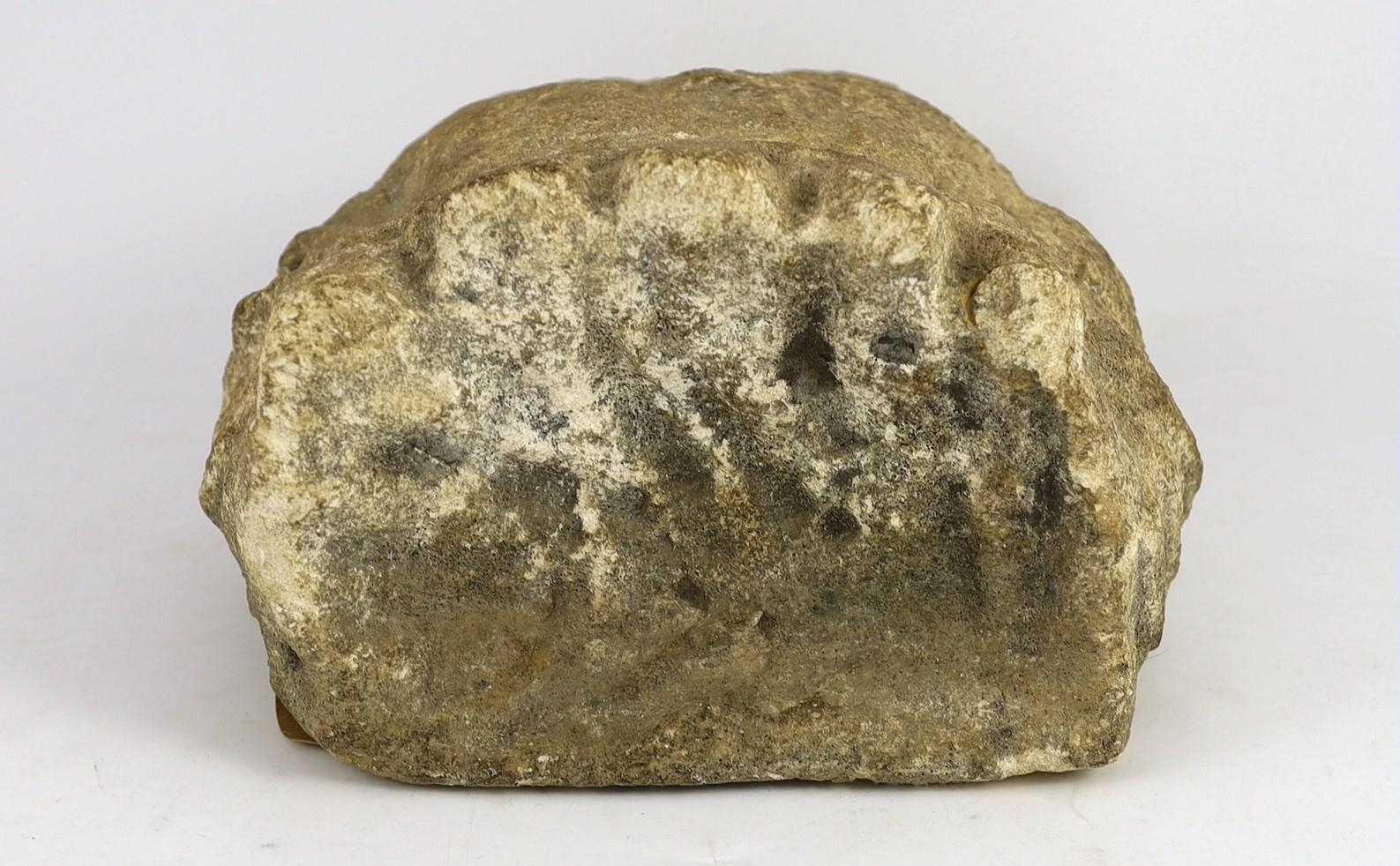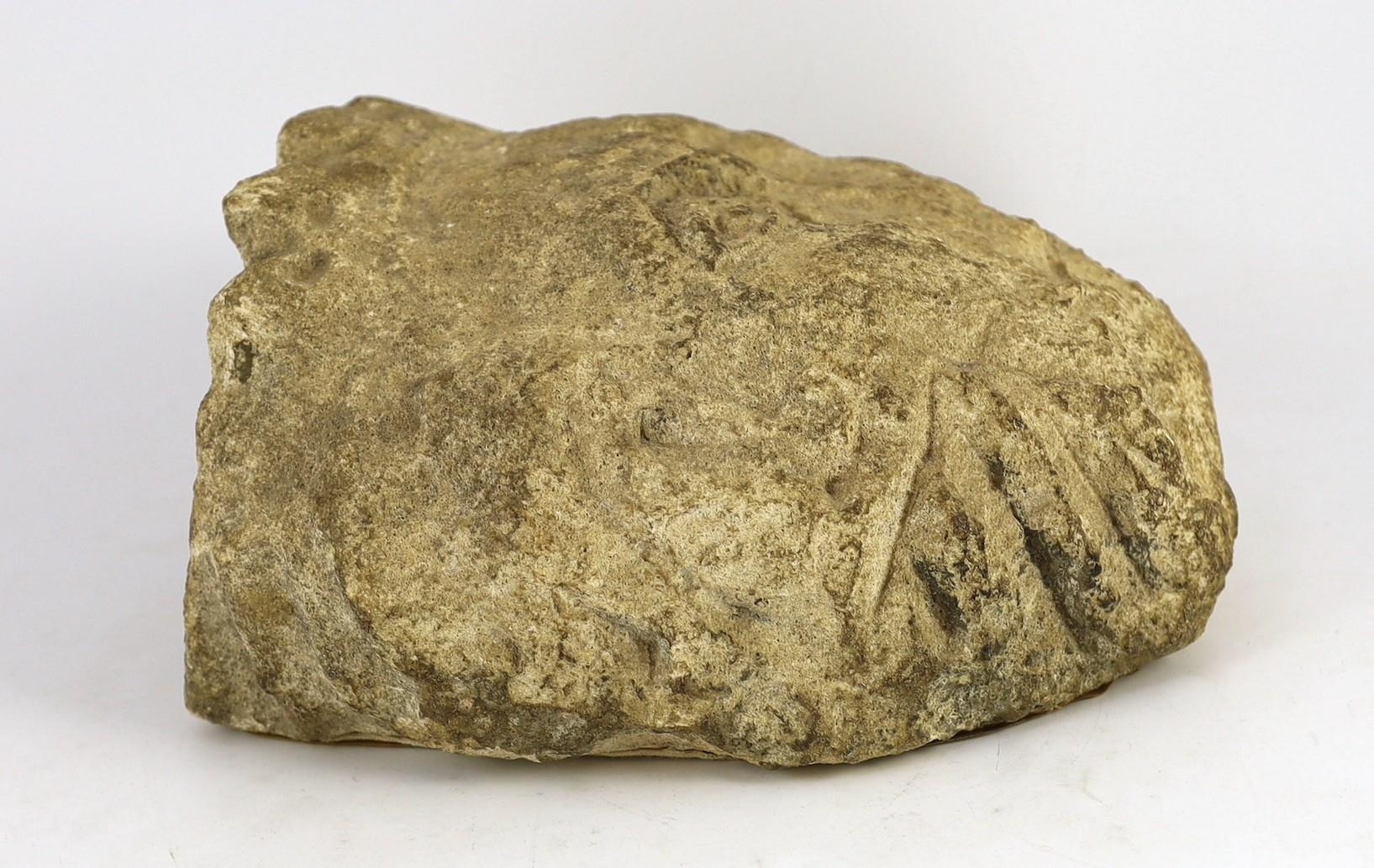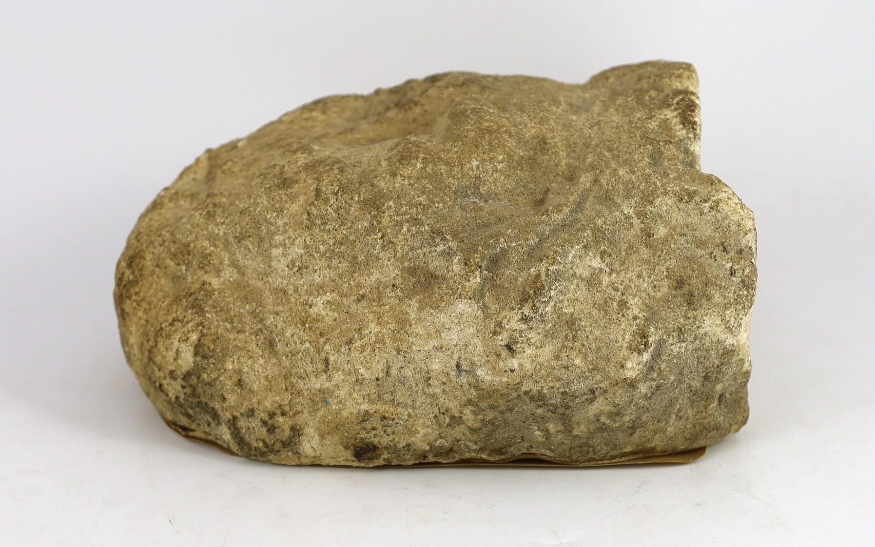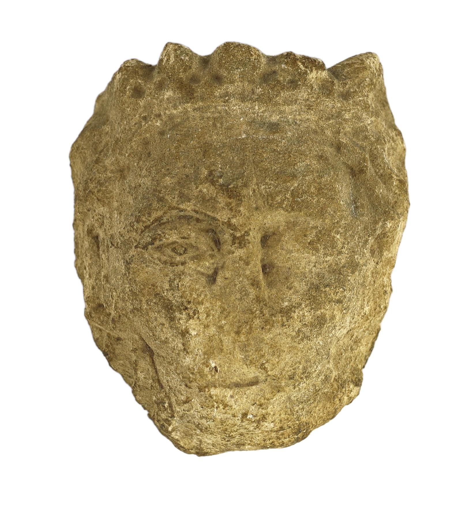 An English carved limestone head of a bearded king, possibly Anglo-Saxon, the weathered head wearing a crown, 25cm high 22.5cm wide