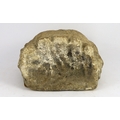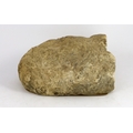 The head very weathered with his nose and much of the decoration of his left eye and mouth now worn away, some remnants of surface patina