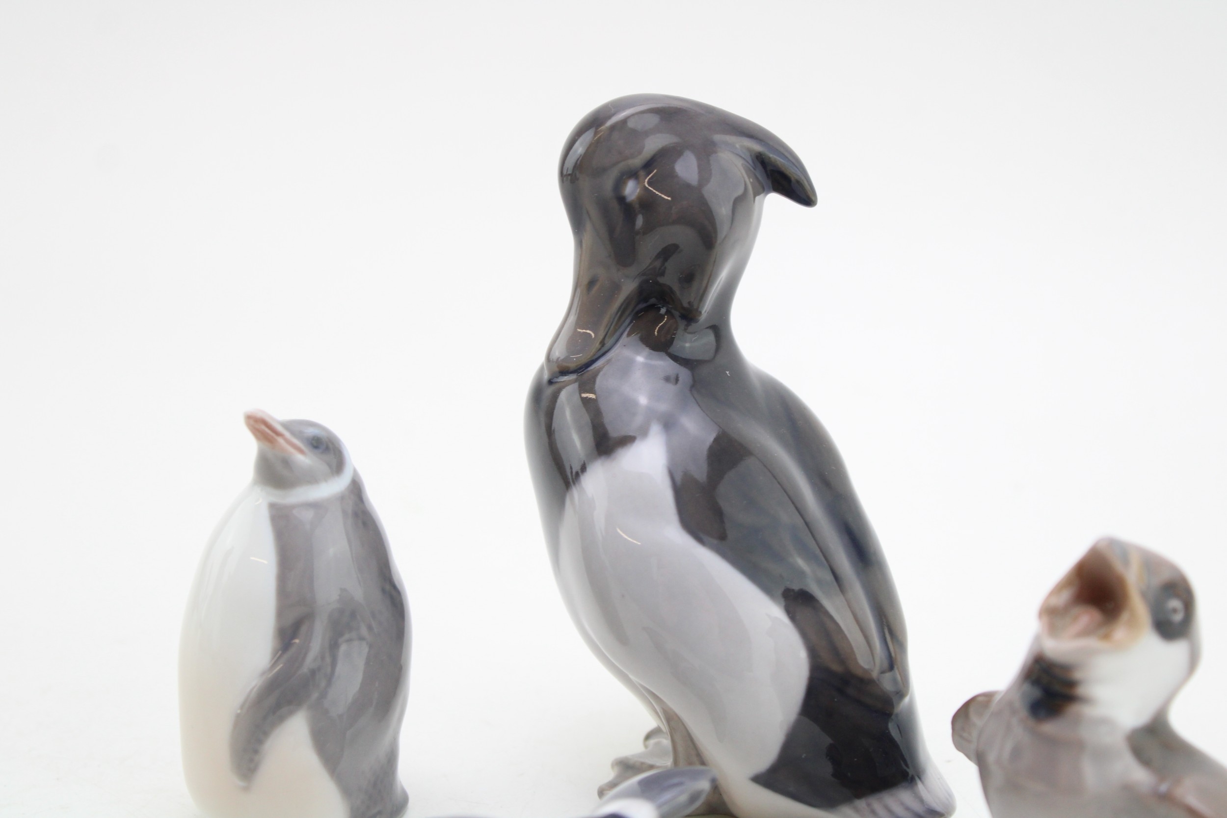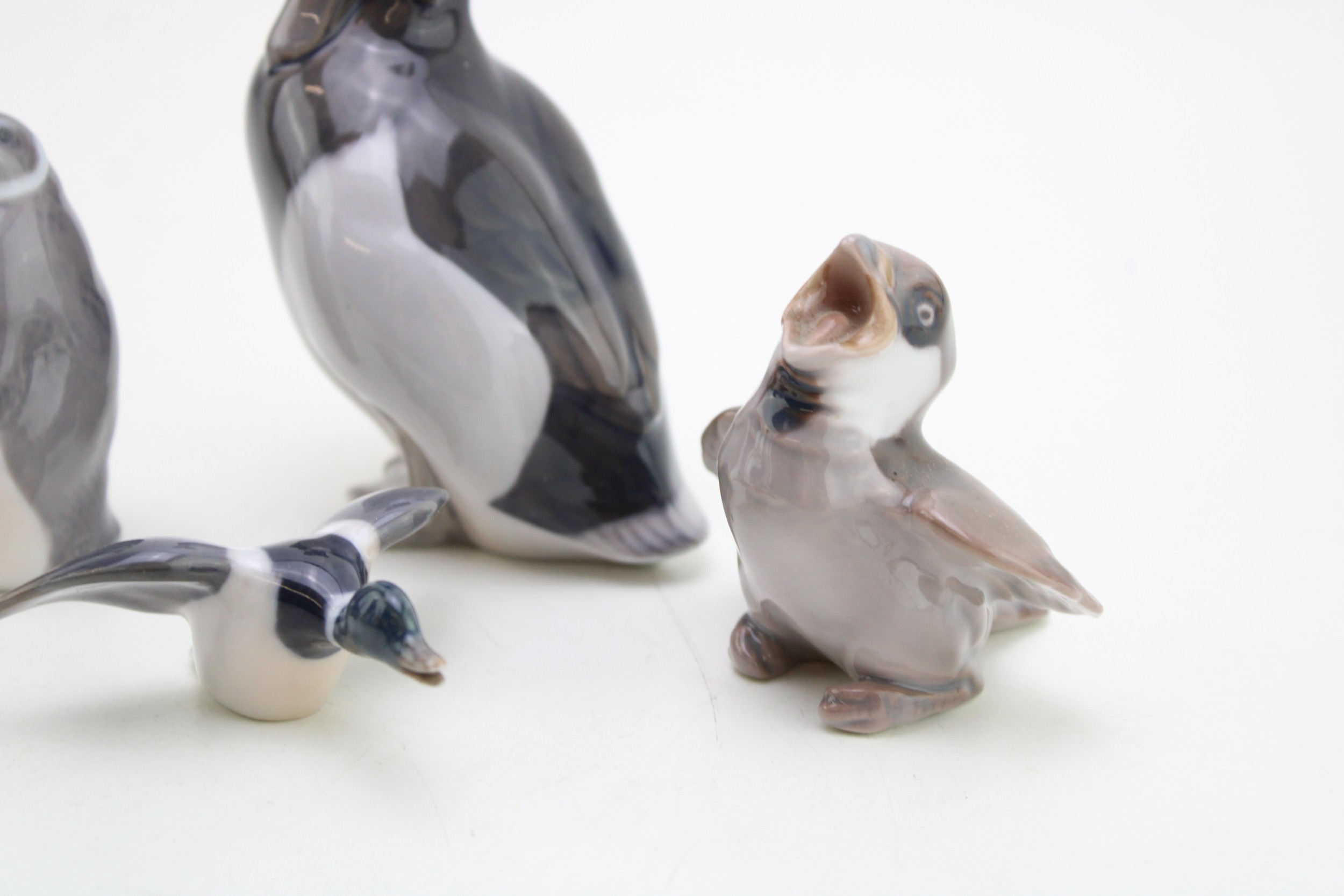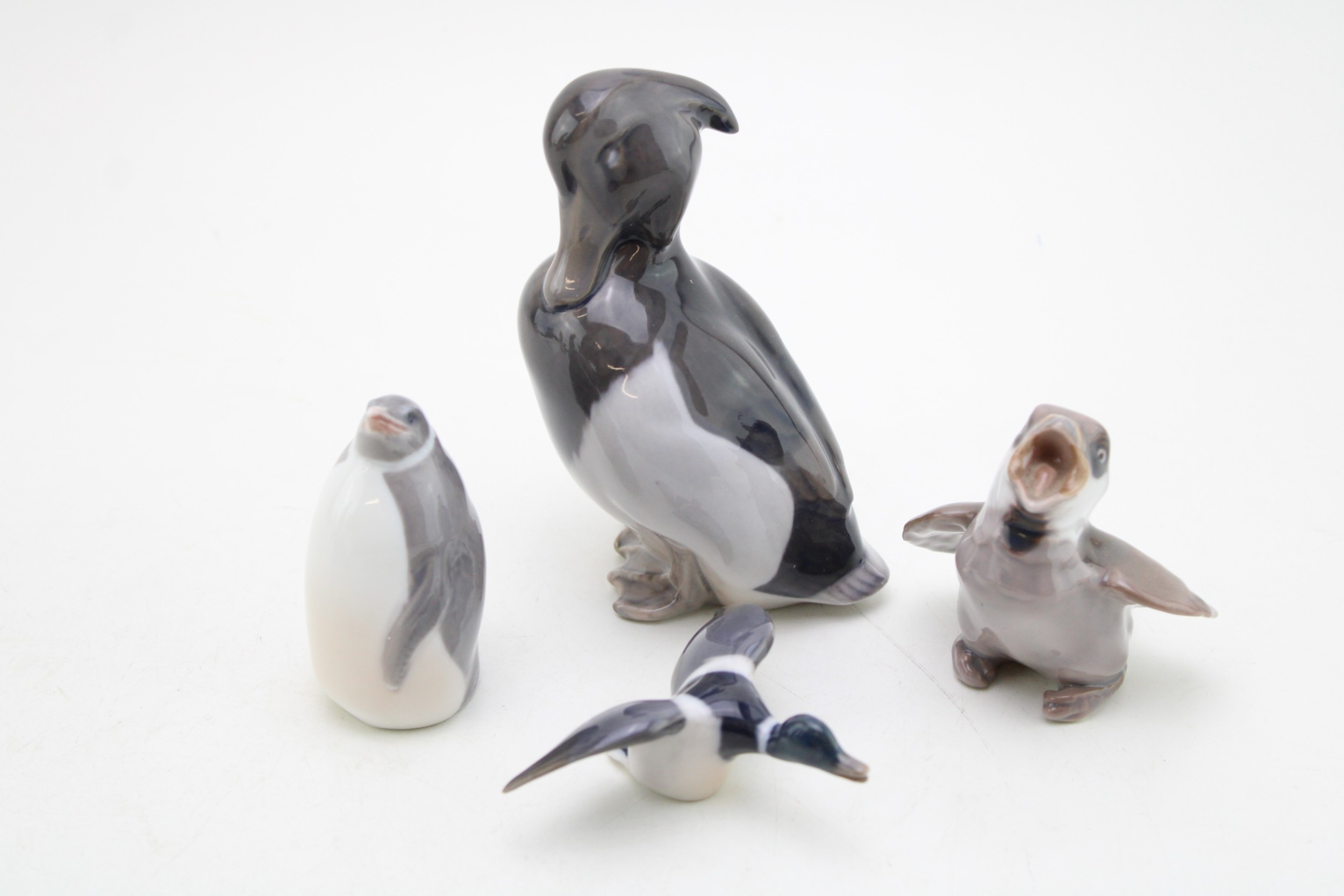 Royal Copenhagen figures to include a standing duck 1941, a penguin 3003, a settling mallard and a B&G chirping bird (4).