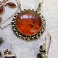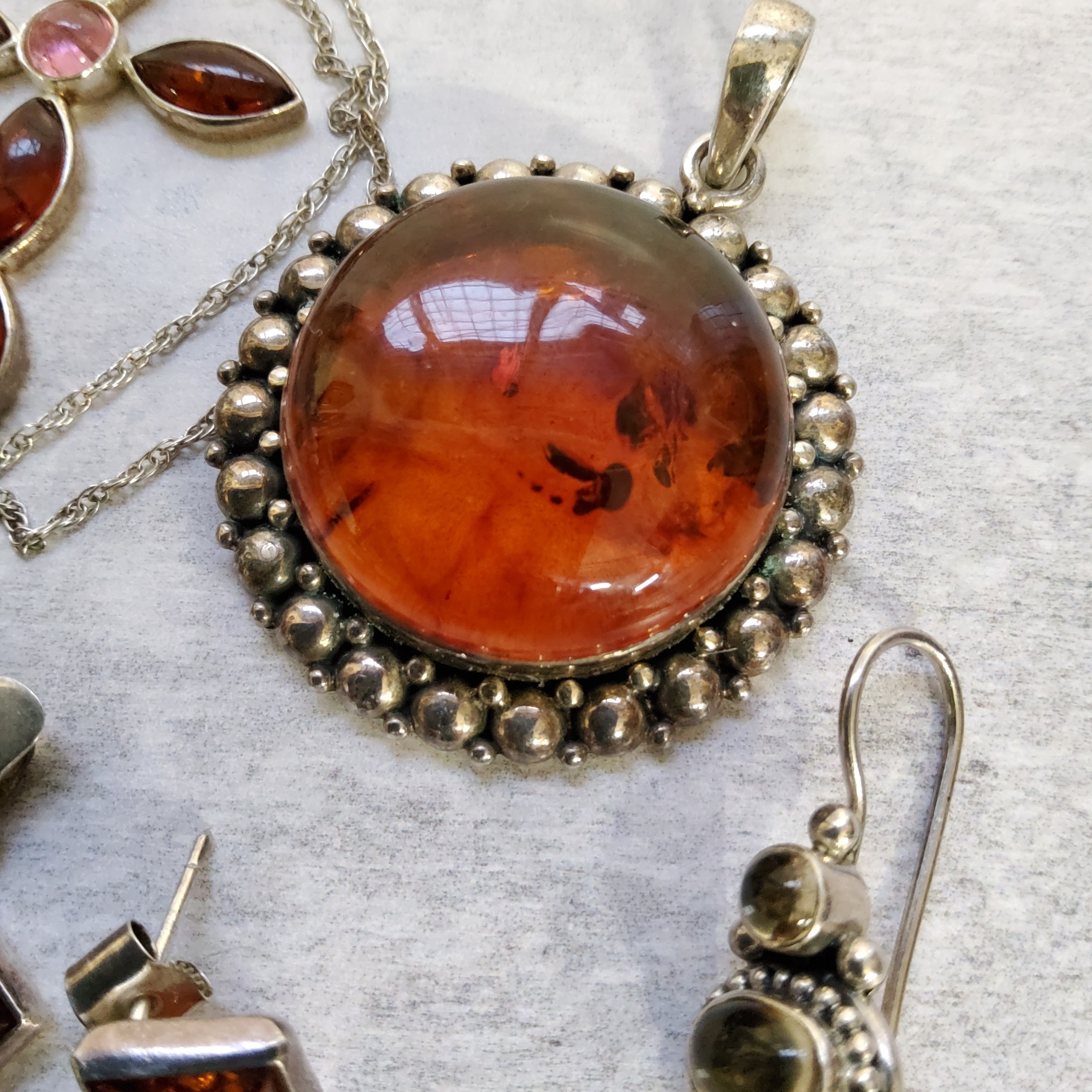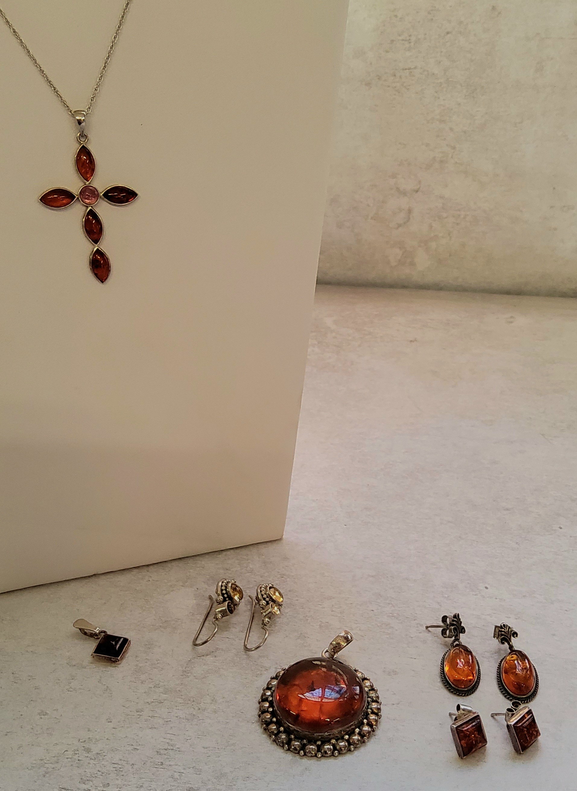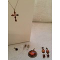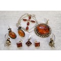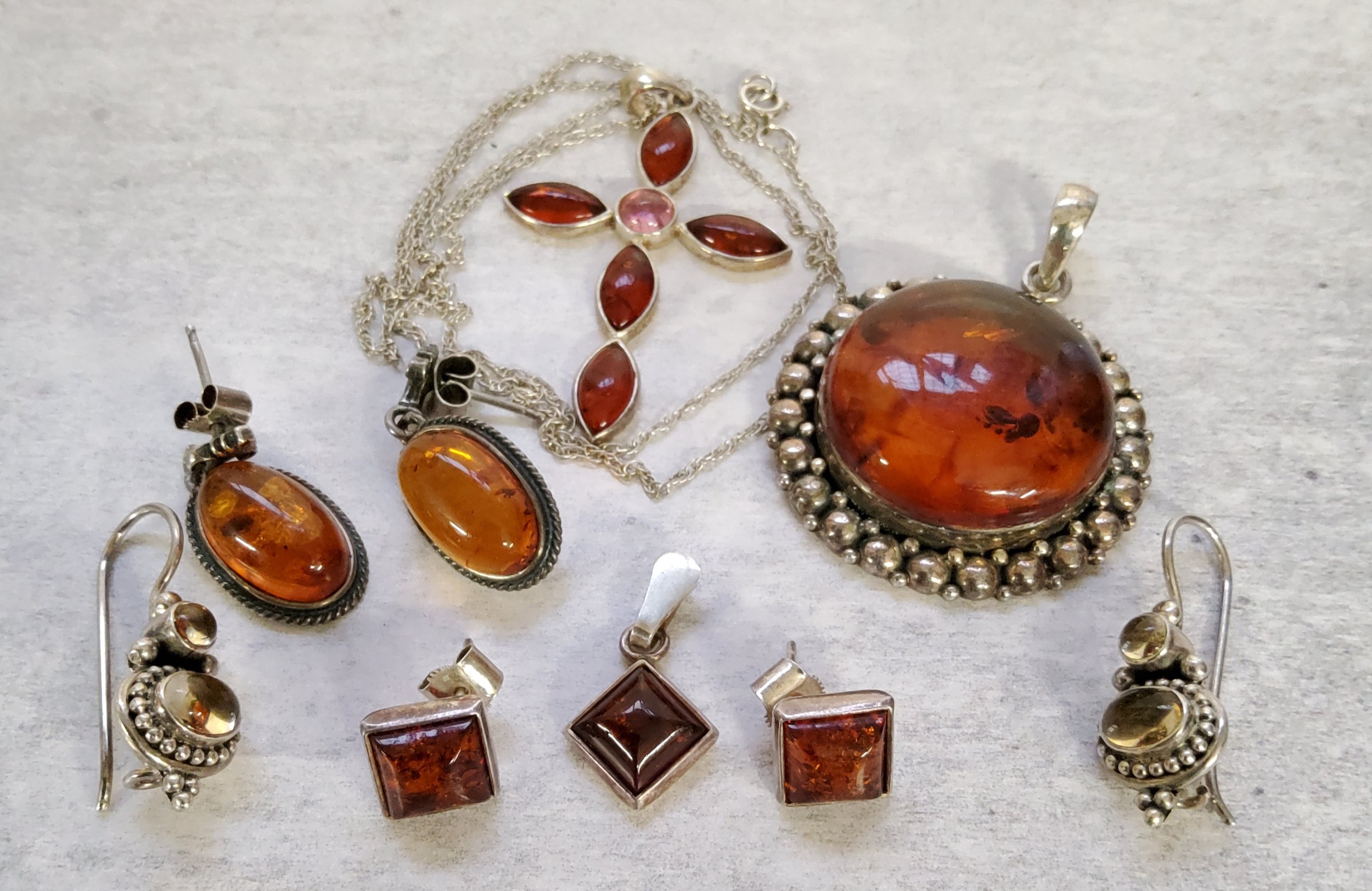 An Indian 925 silver circular pendant set with a central amber cabochon (2.5cms); a pair of oval silver & amber earrings; a silver & Baltic amber earring & pendant set; a silver necklace & cross set with Baltic amber; an Indian 925 silver earrings;