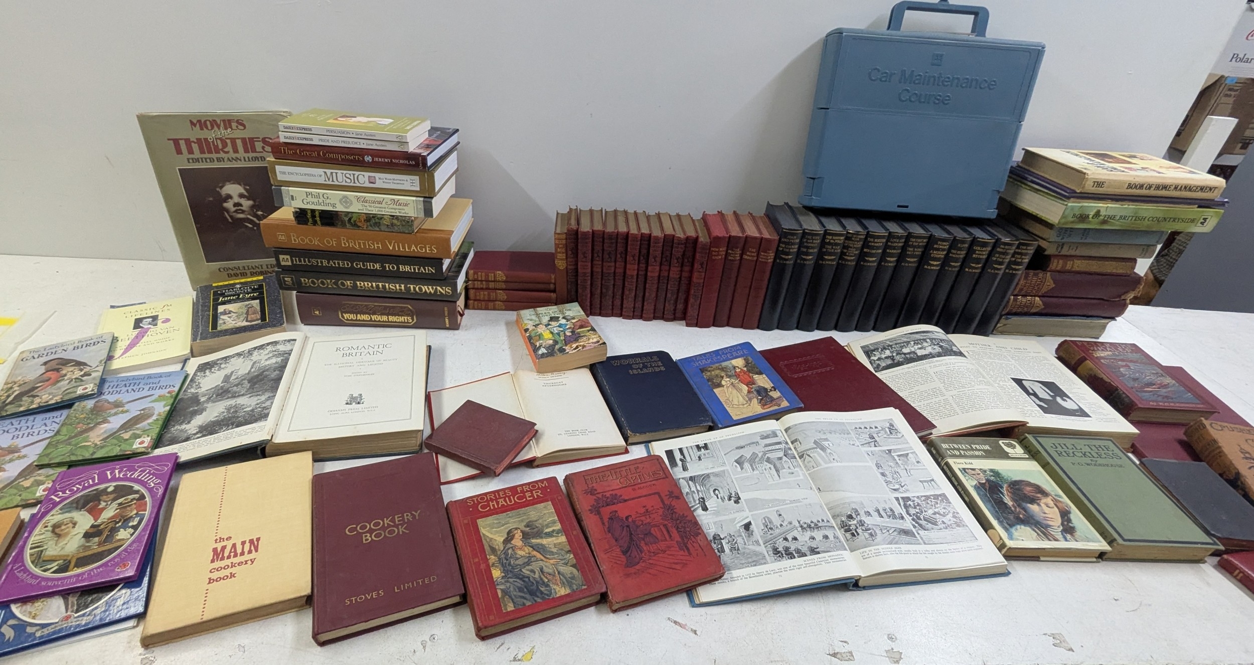 A quantity of books to include Lady bird book of garden birds, AA books 12 volumes by H G Wells, children's books, household books and others