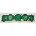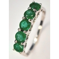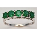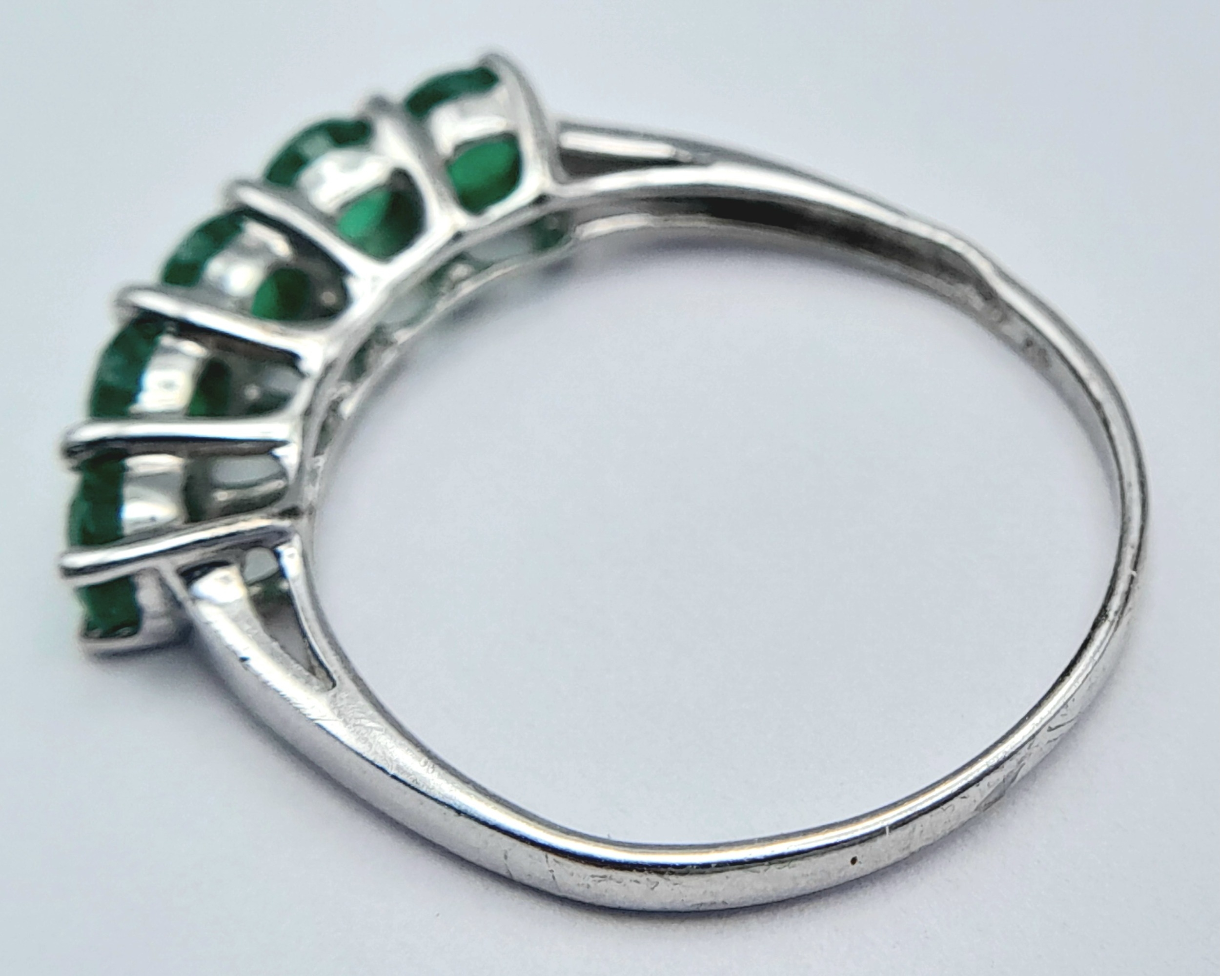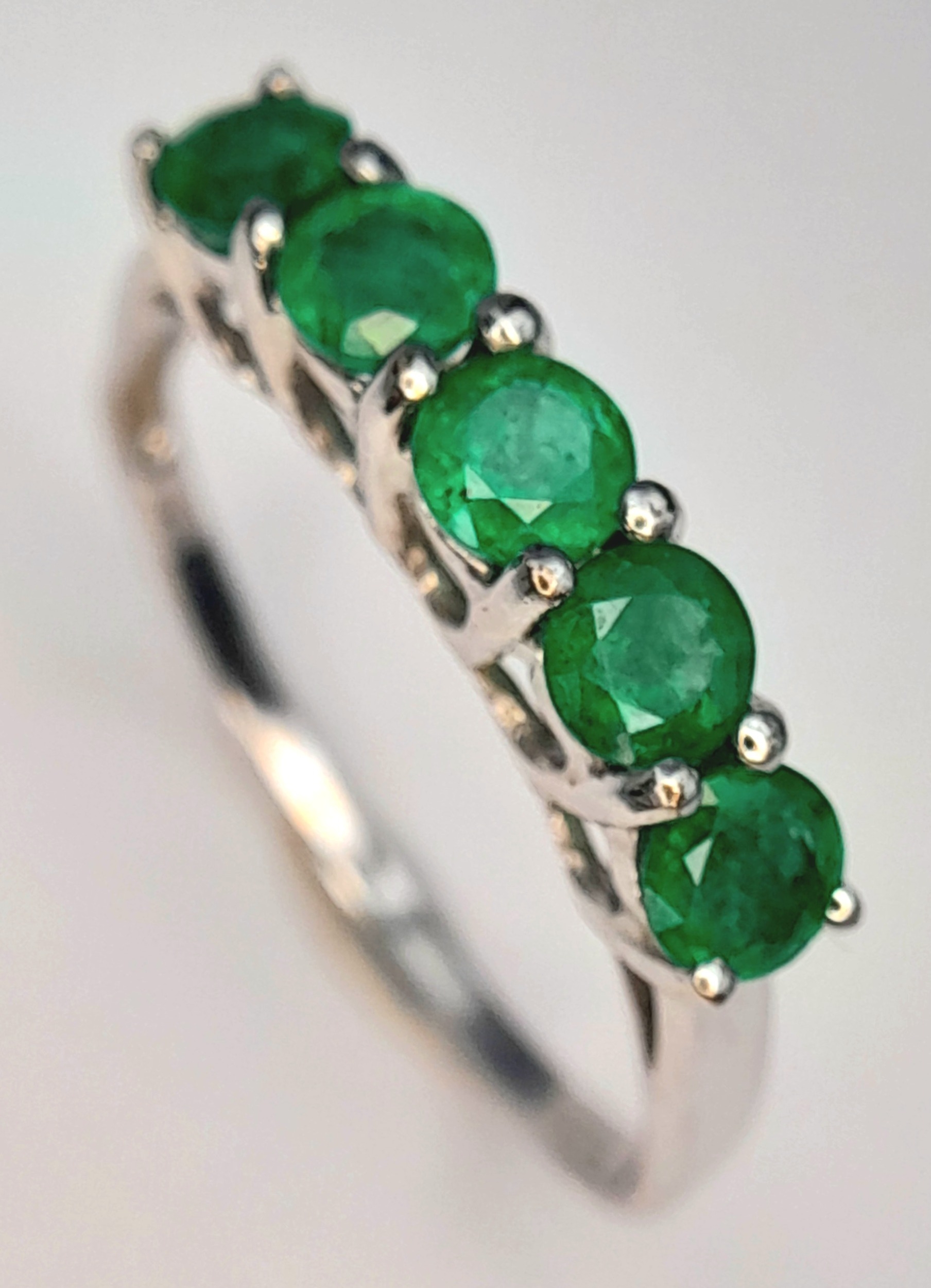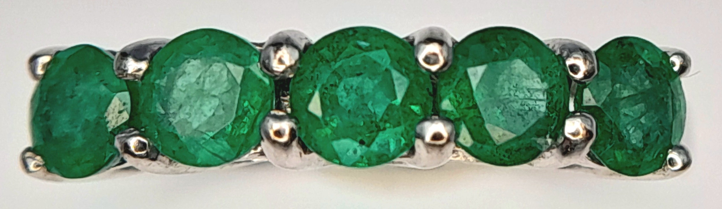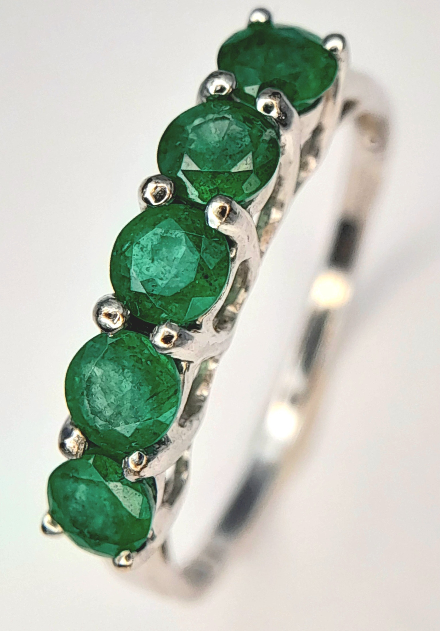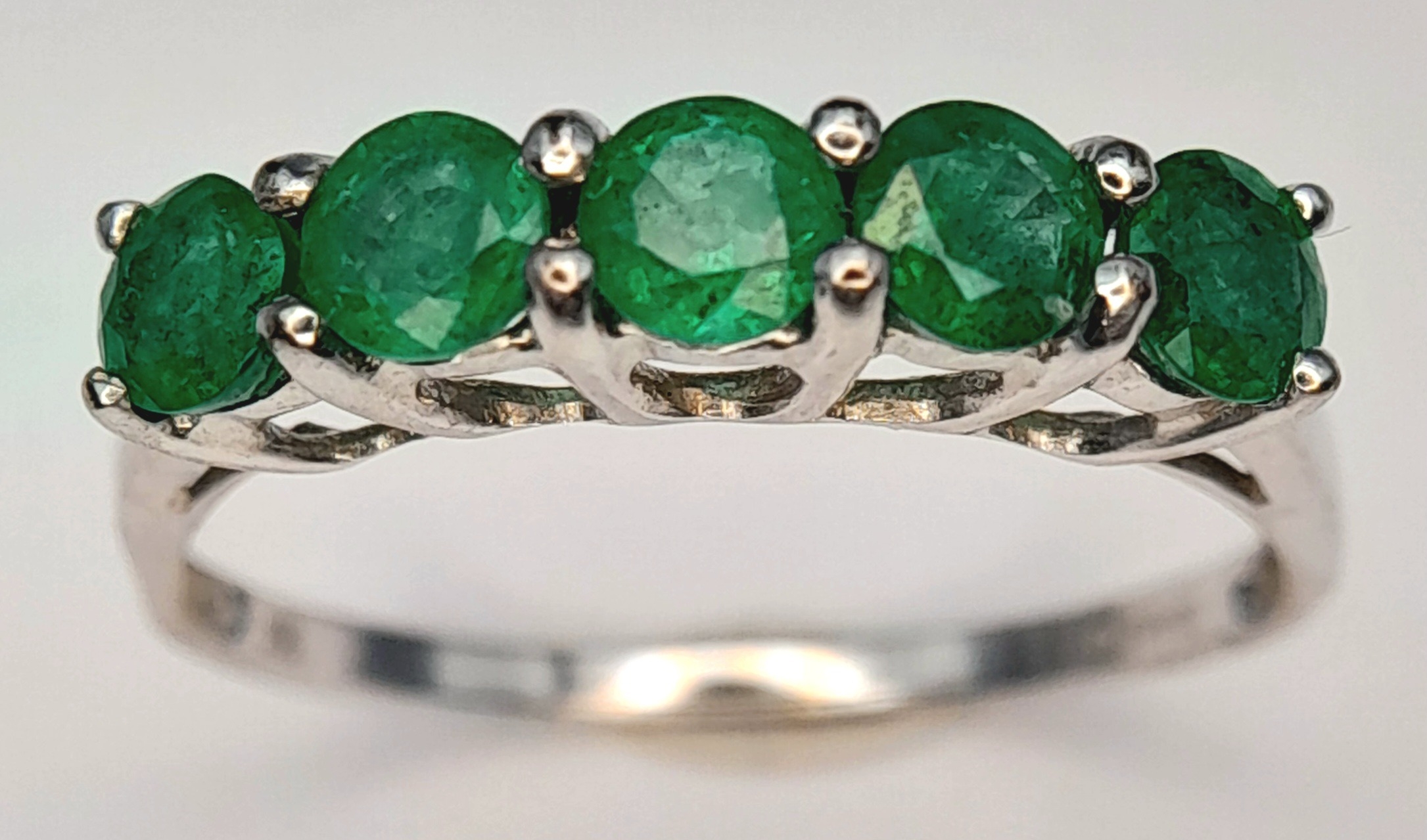 A Stylish 9 Carat White Gold and Five Emerald Set Ring Size N. Set with Five 4mm Quality Round Cut Emeralds, approximately 1.25 Carat Total. The Ring has a gross weight of 1.58 Grams