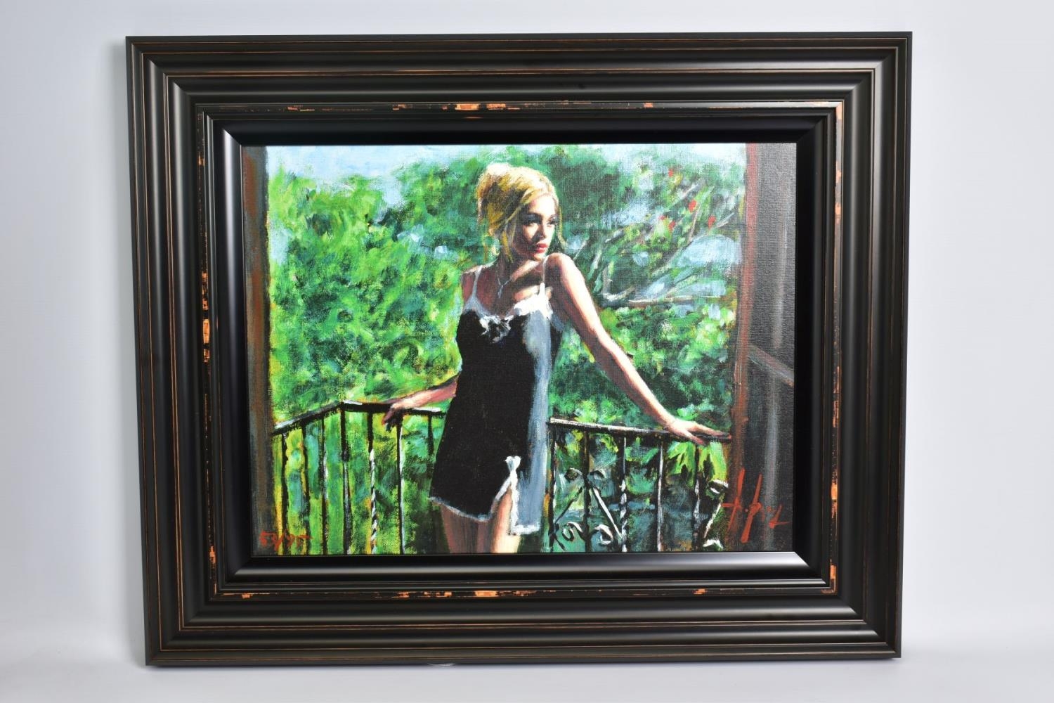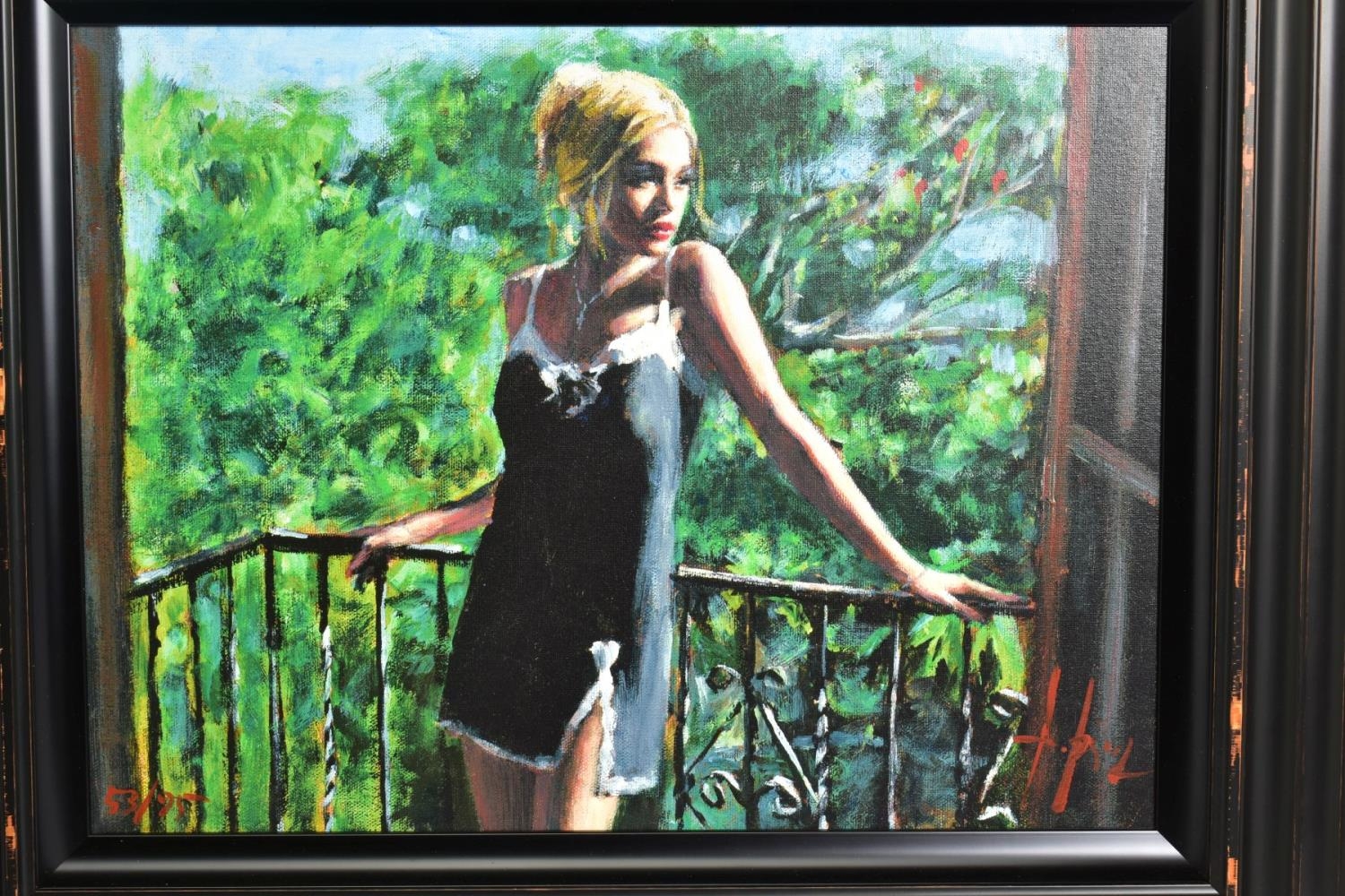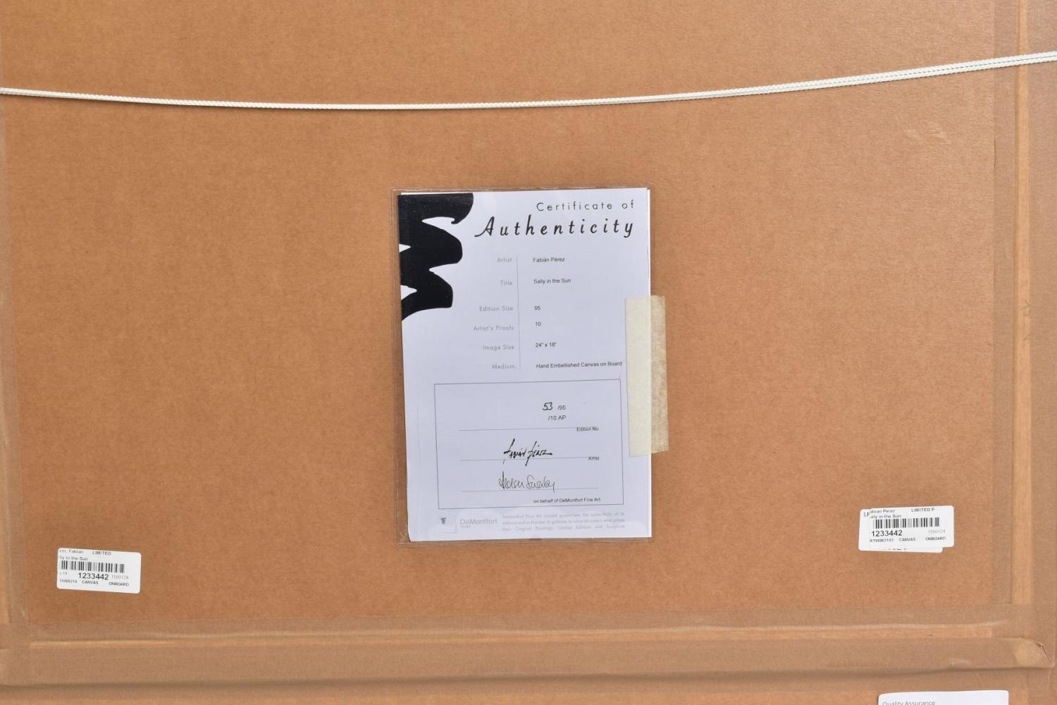 FABIAN PEREZ (ARGENTINA 1967) 'SALLY IN THE SUN', a limited edition print of a female figure on a balcony, 53/95, signed bottom right, with certificate, framed, approximate sizes: image 45cm x 60cm, frame 67cm x 82cm (condition: print in good condition, small dent to one corner of the frame)