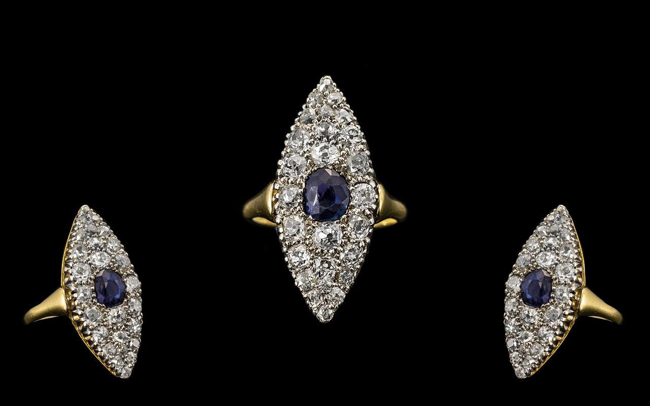 Art Deco Period Stunning 18ct Gold Diamond and Sapphire Set Dress Ring - marked 18ct to interior of shank. The diamond of excellent sparkle, colour and clarity. Estimated diamond weight 3.00 cts. Ring size S. Wonderful period ring. All aspects of condition excellent including setting and shank. Low estimate.