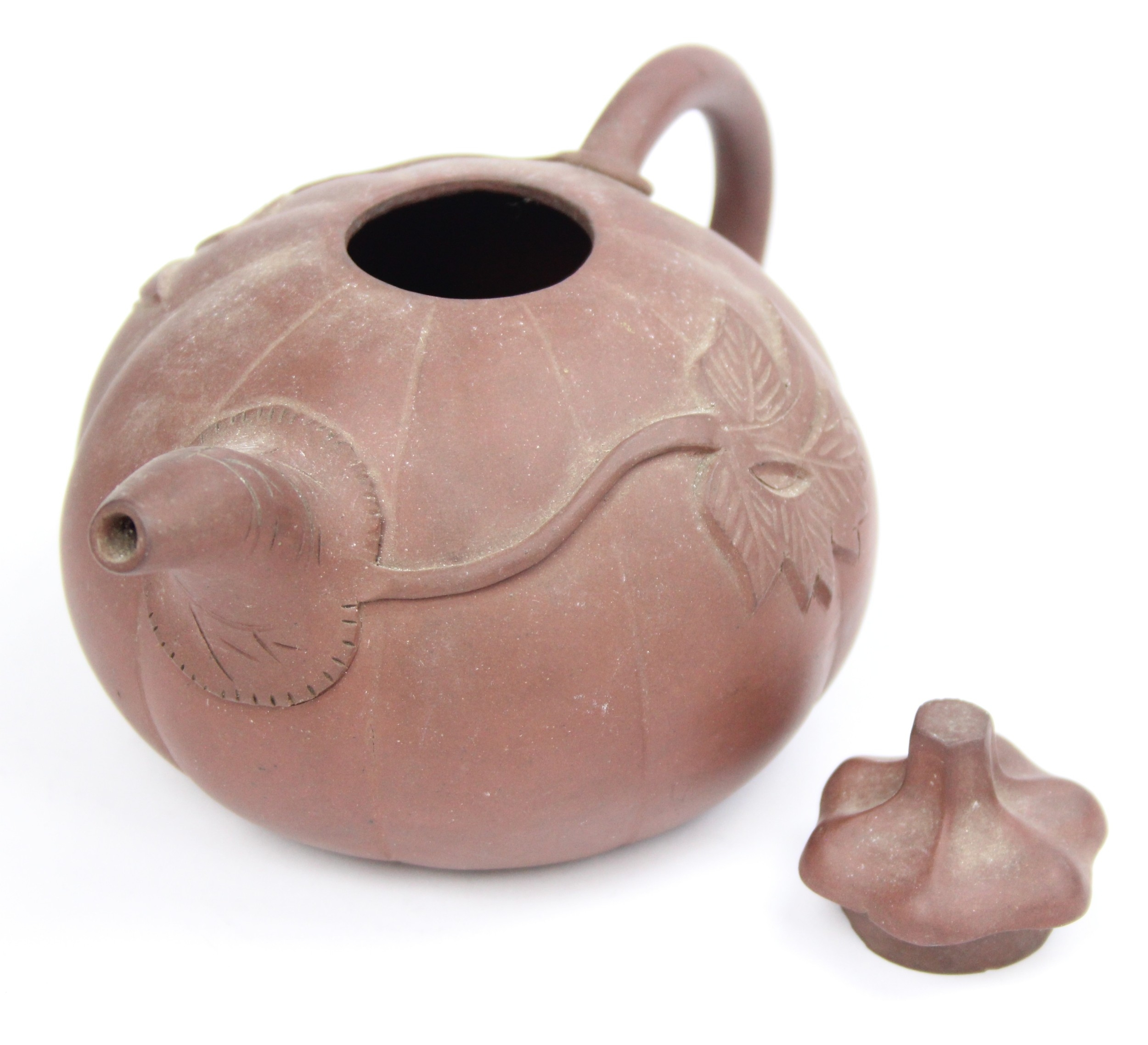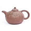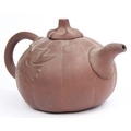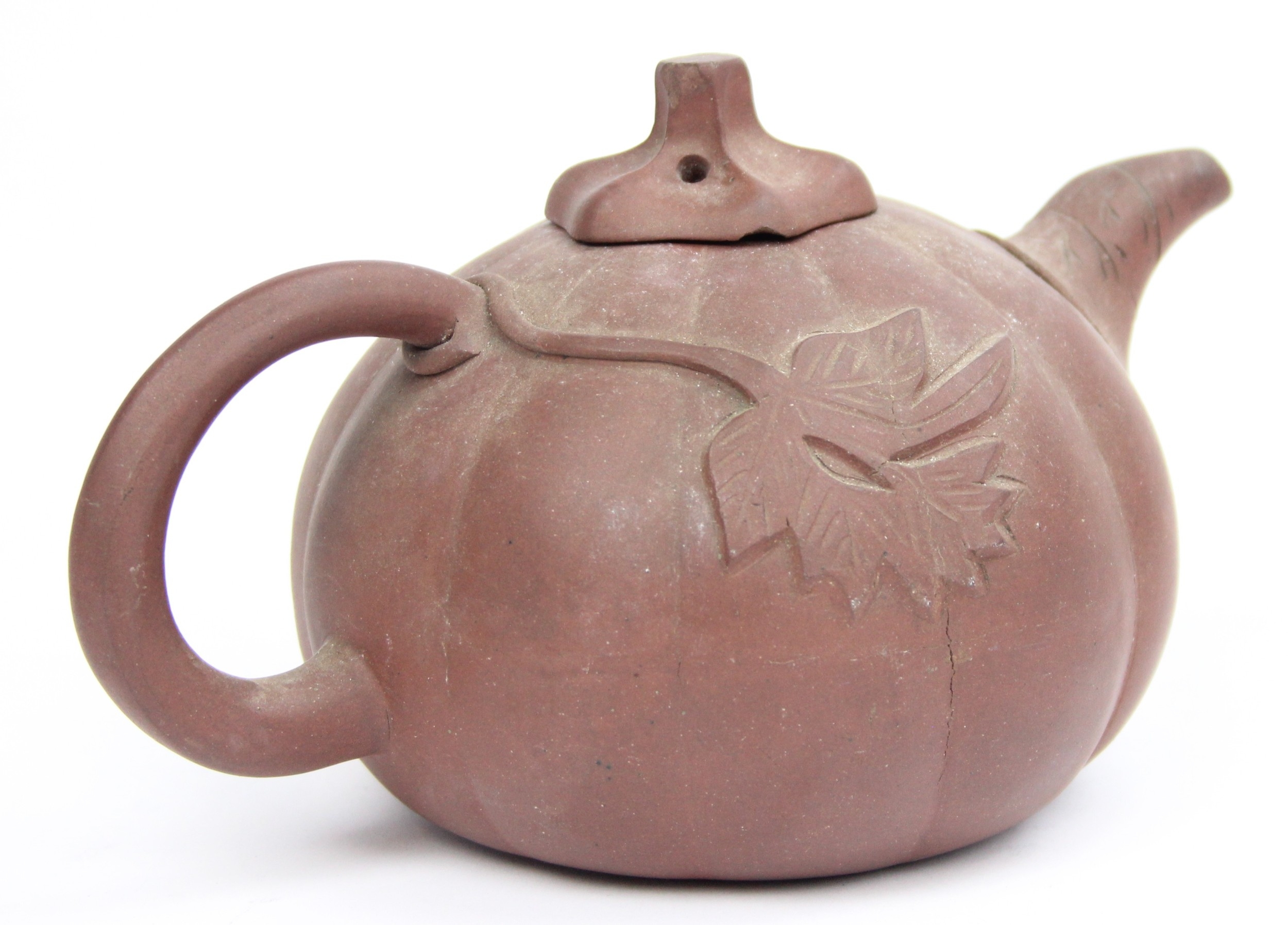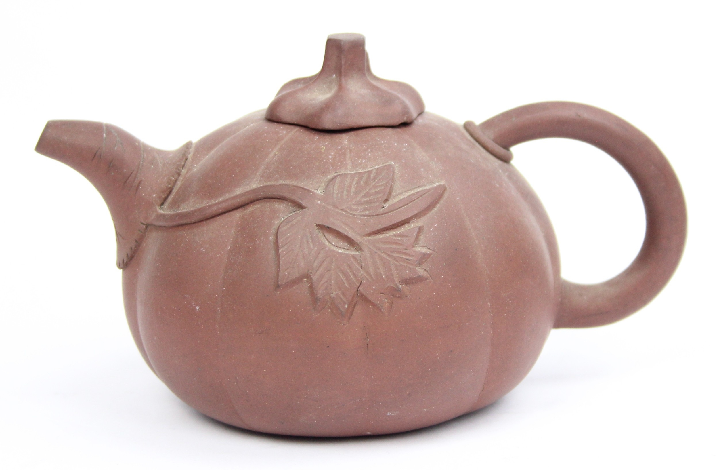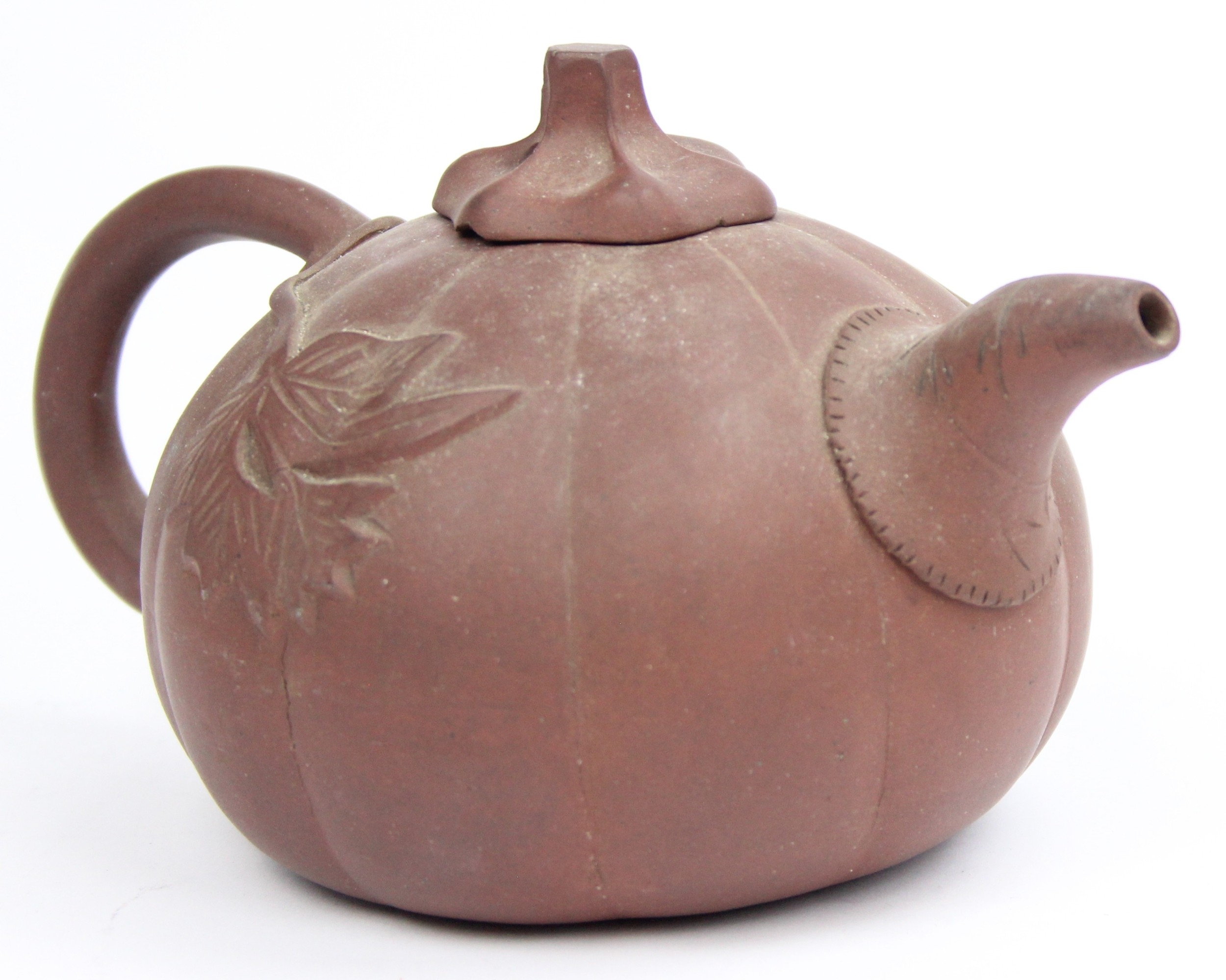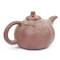 A Chinese Yixing pottery teapot and cover, modelled as a pumpkin with vine leaf decoration, seemingly unsigned, 19cm wide