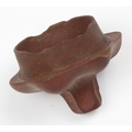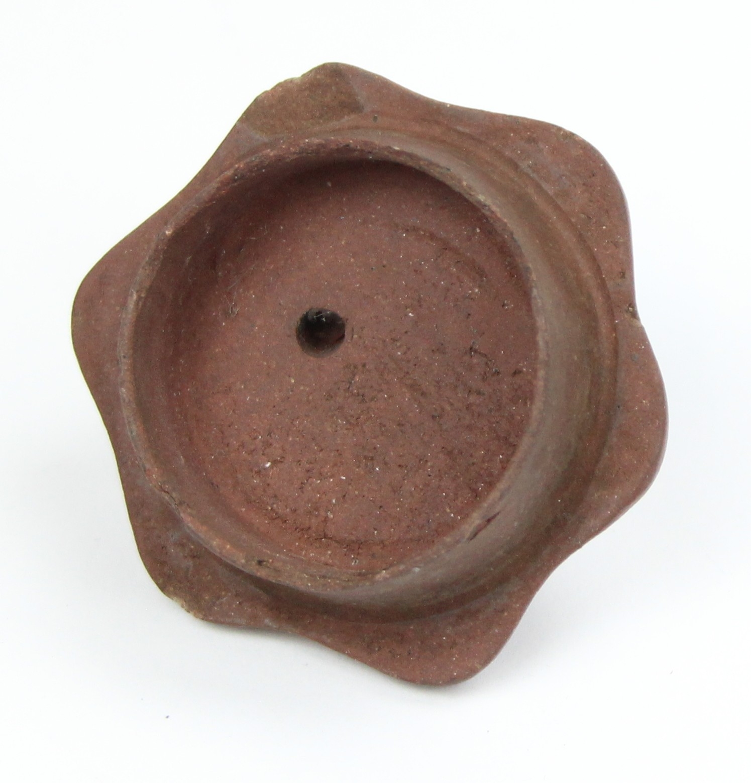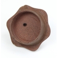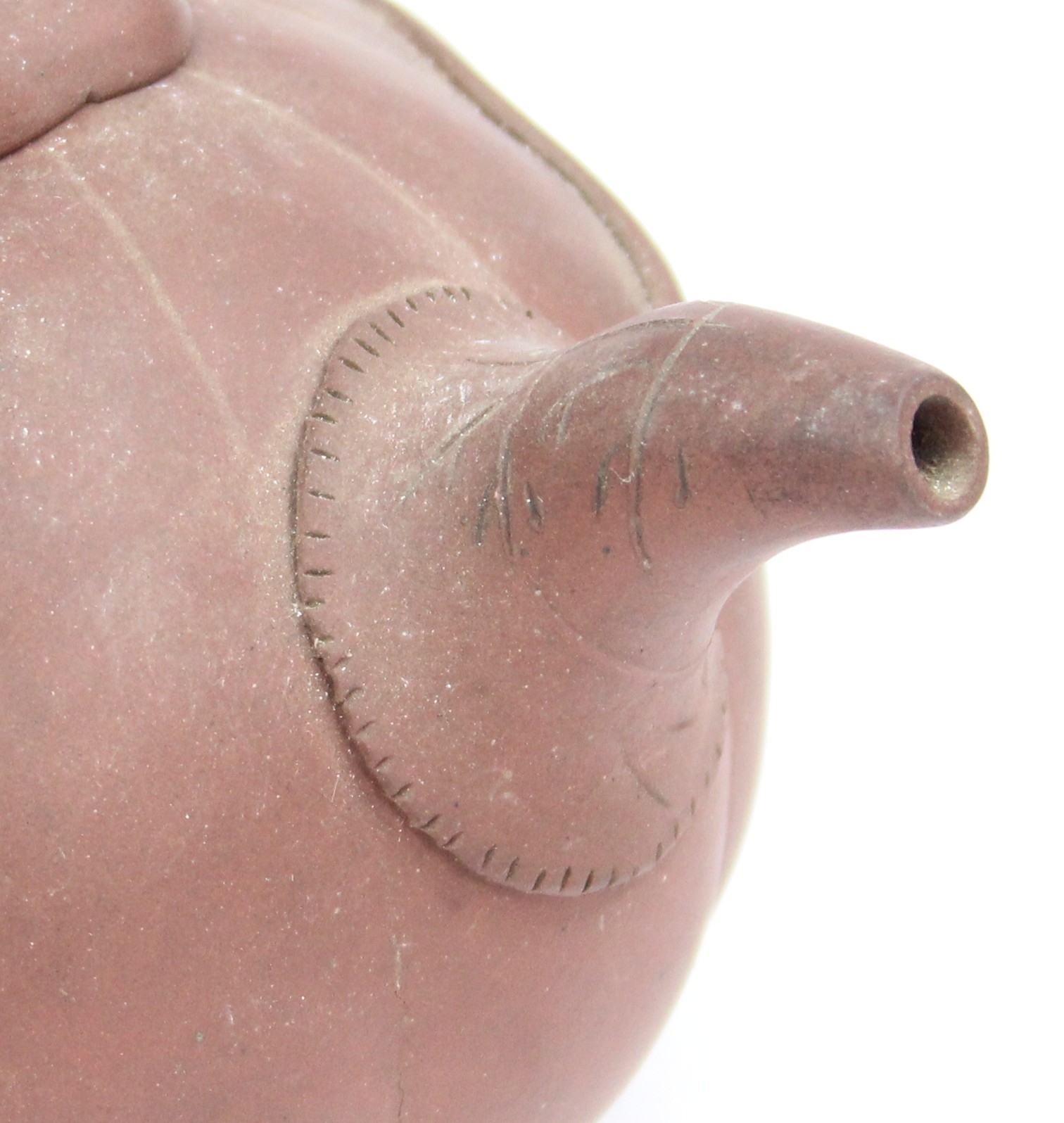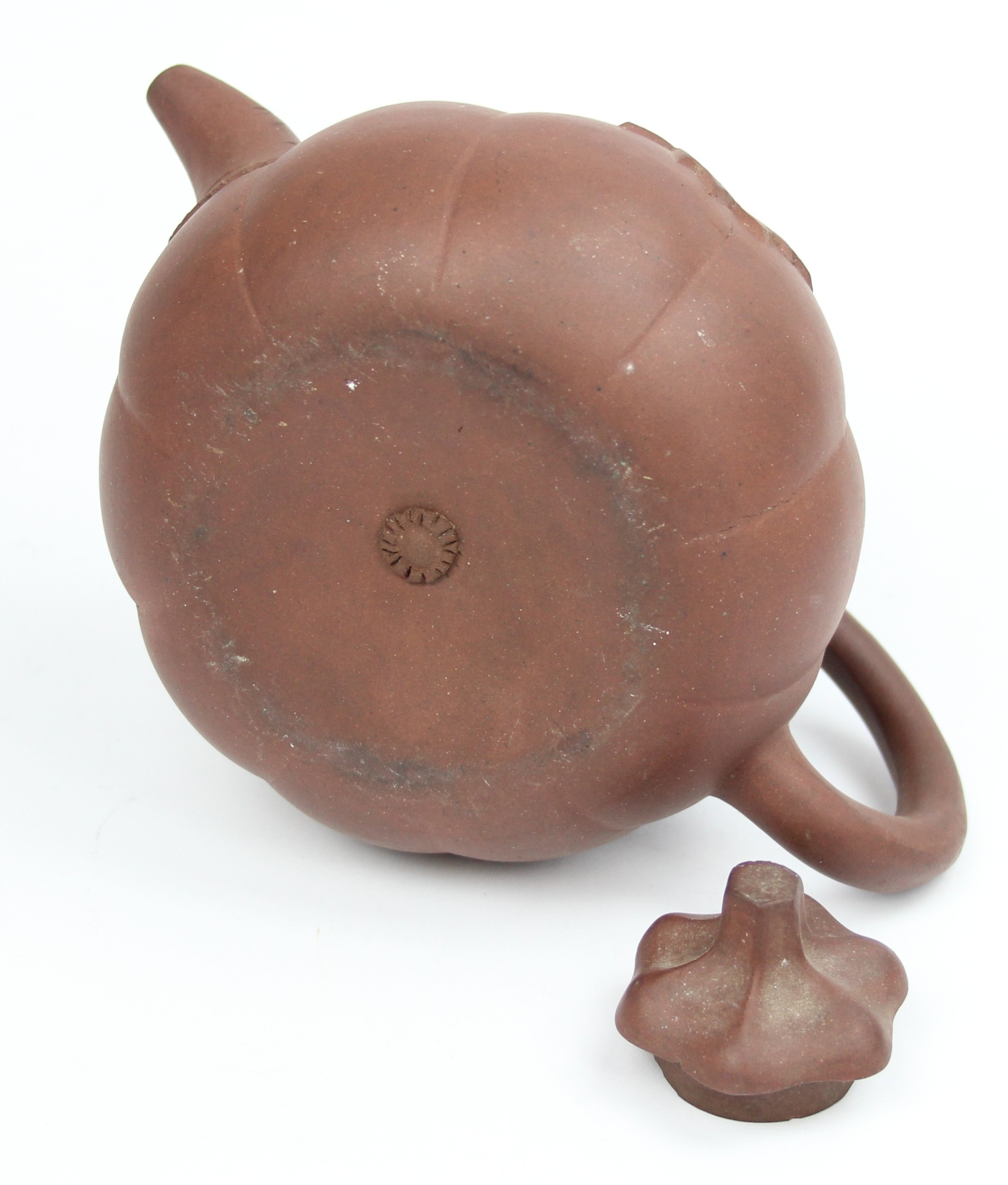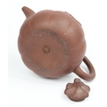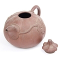 A Chinese Yixing pottery teapot and cover, modelled as a pumpkin with vine leaf decoration, seemingly unsigned, 19cm wide