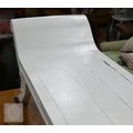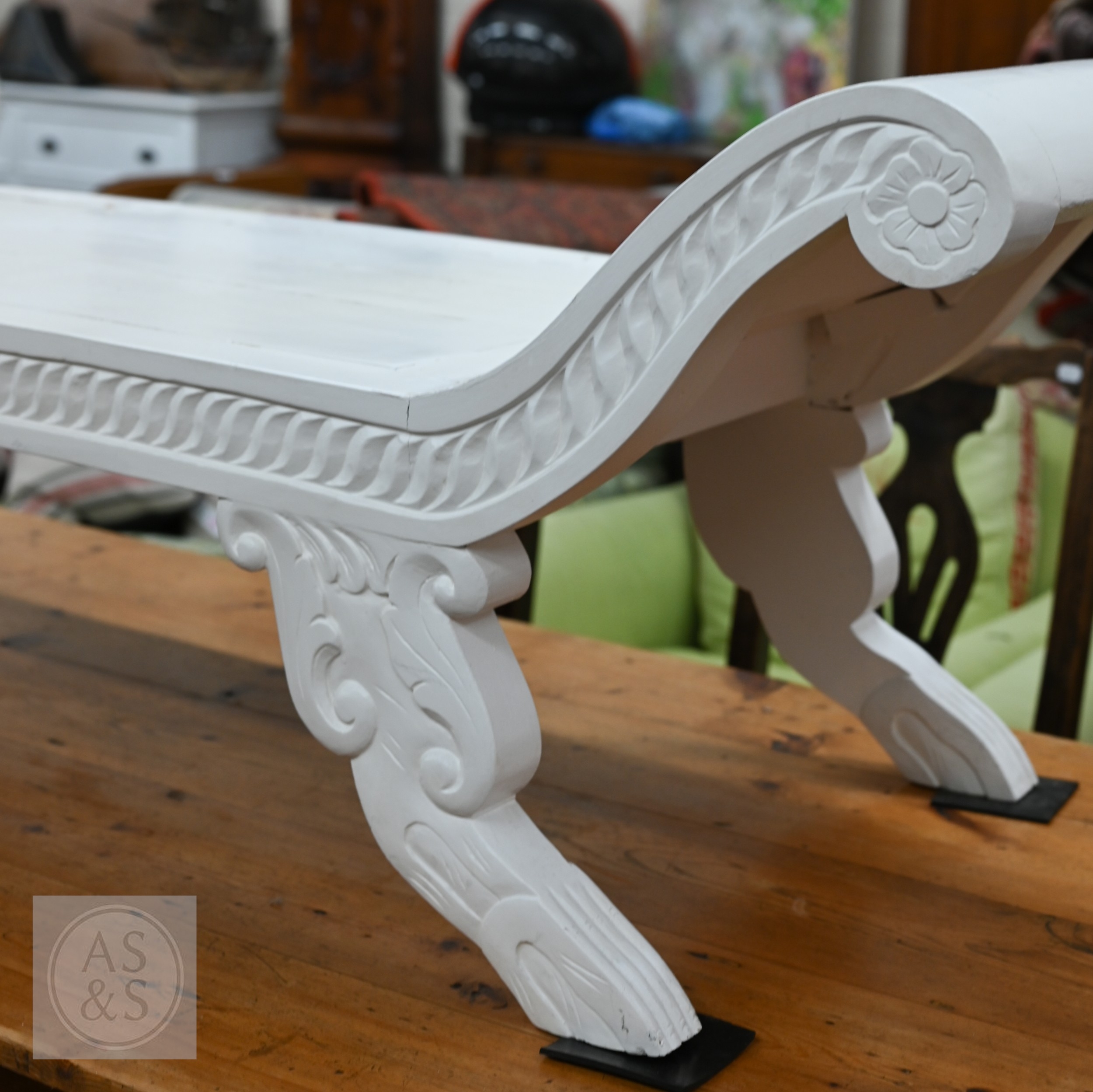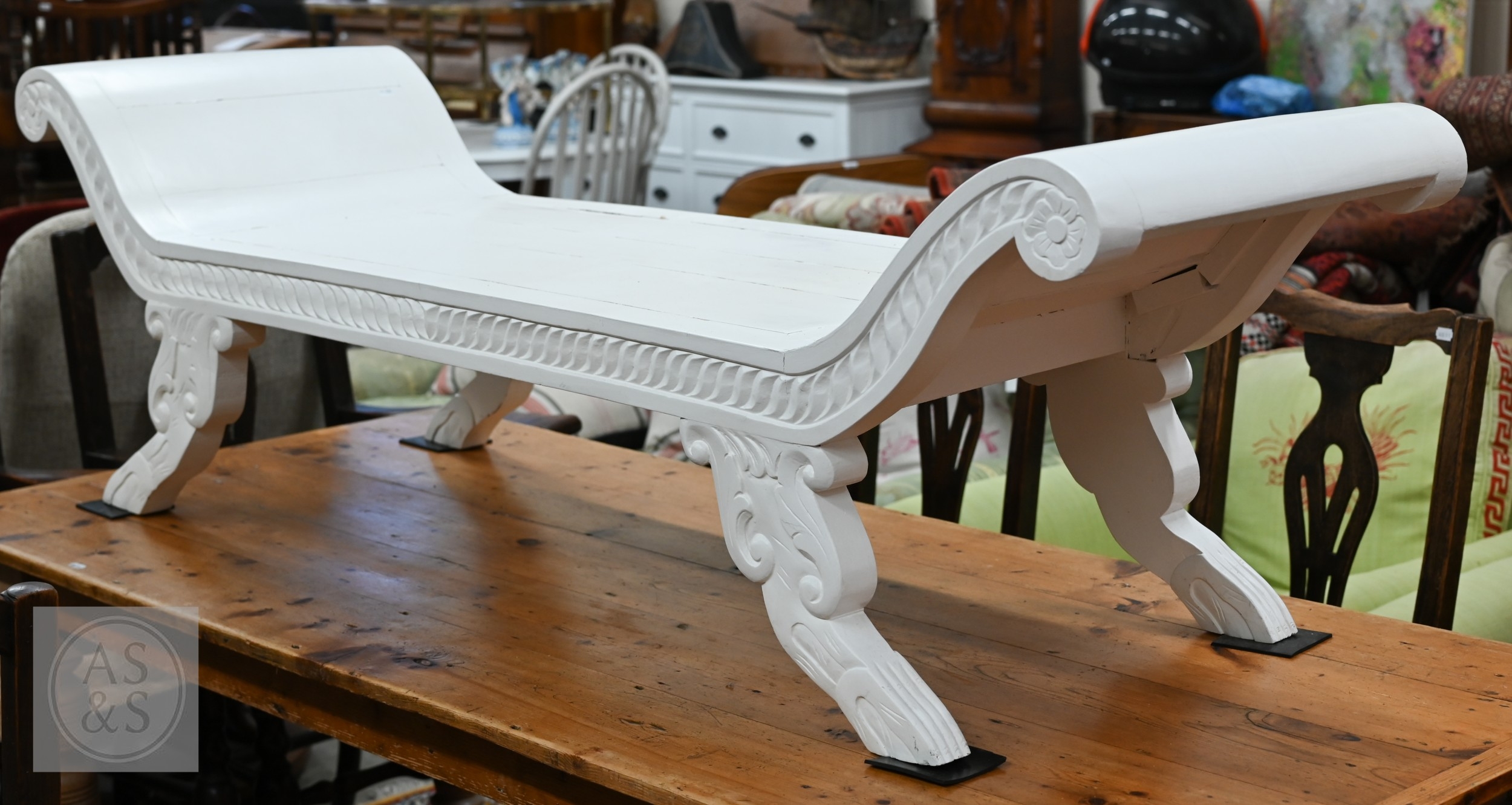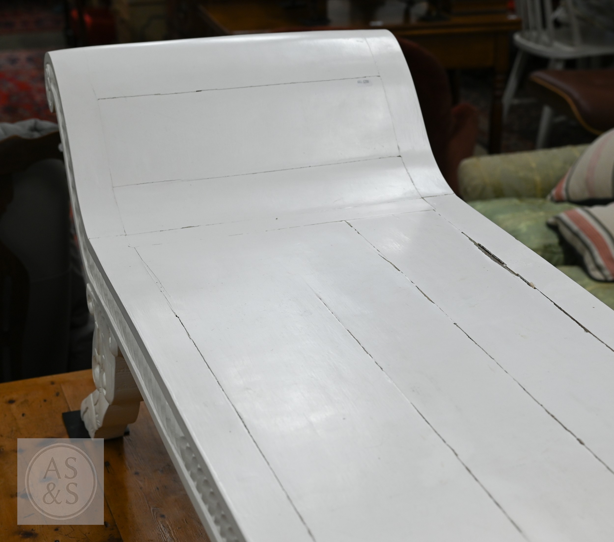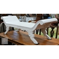 A cream painted Récamier style daybed with floral carved scroll-ends and carved hooved legs, 170 x 50 x 50 cm h