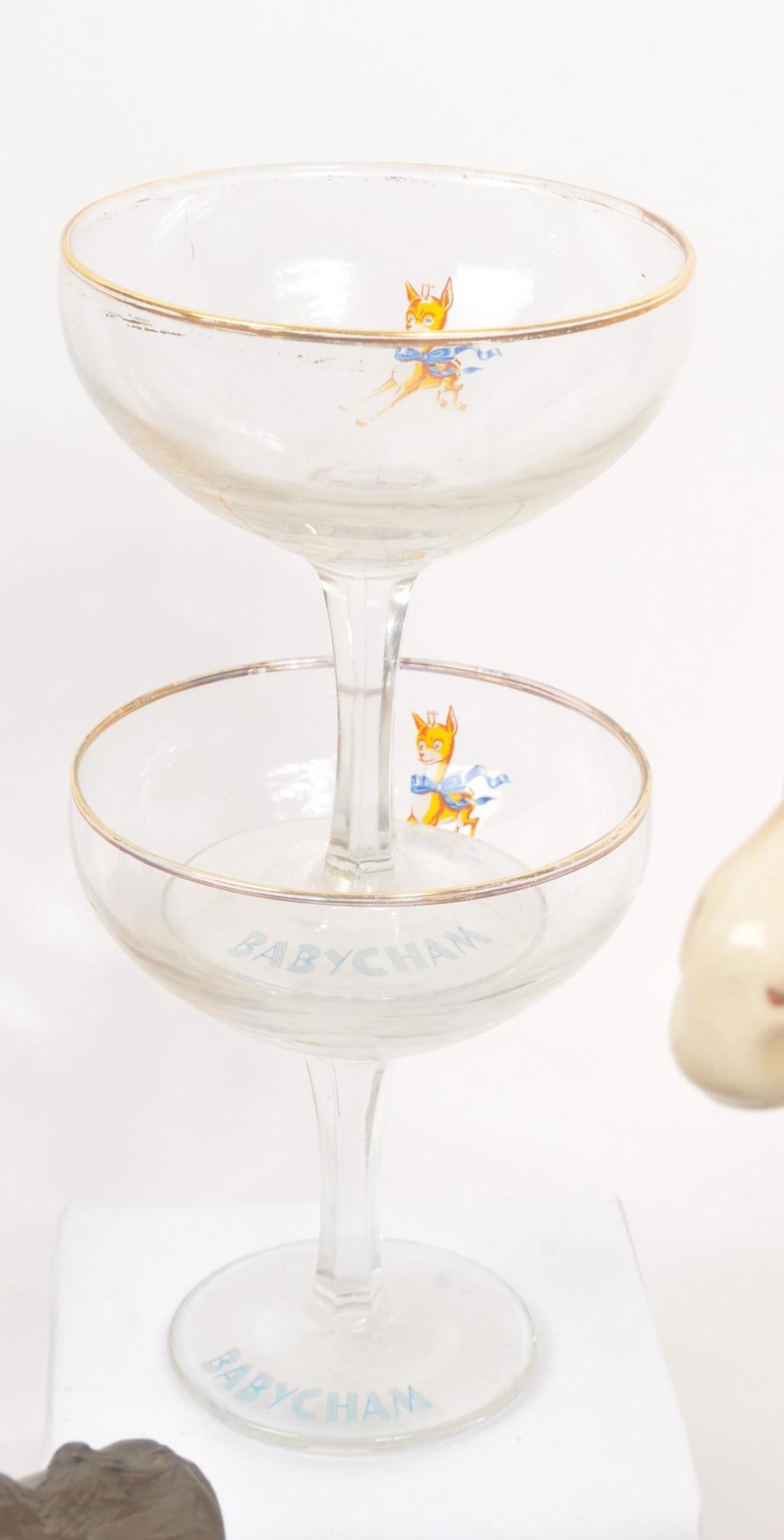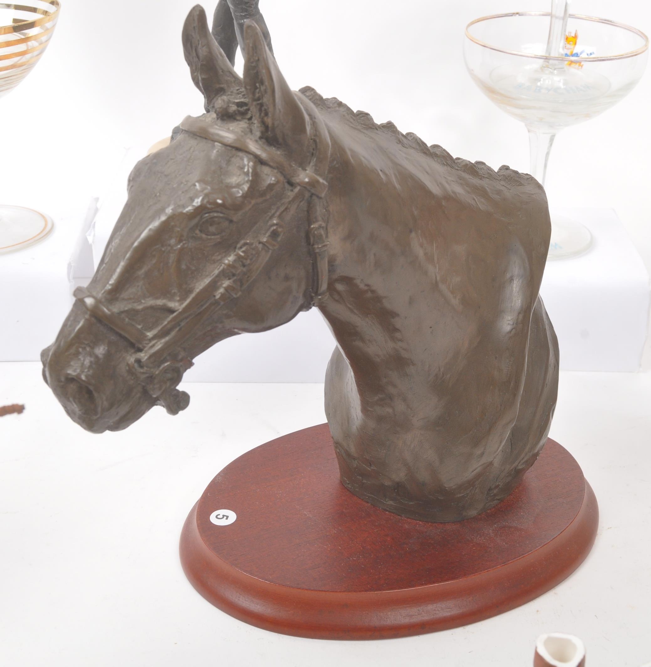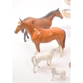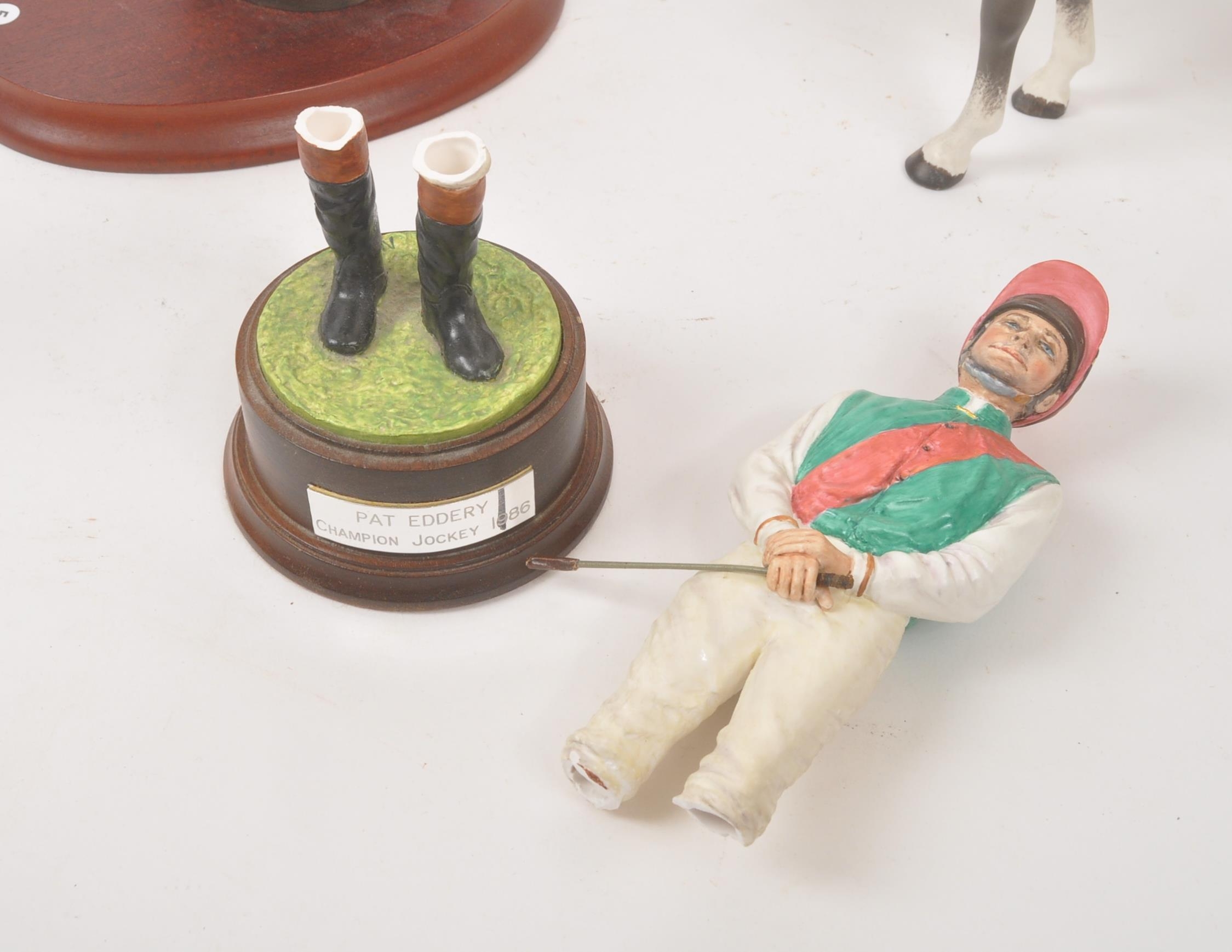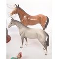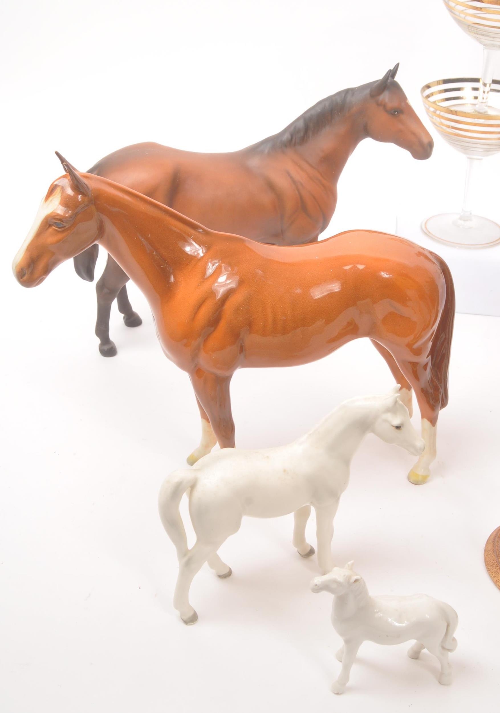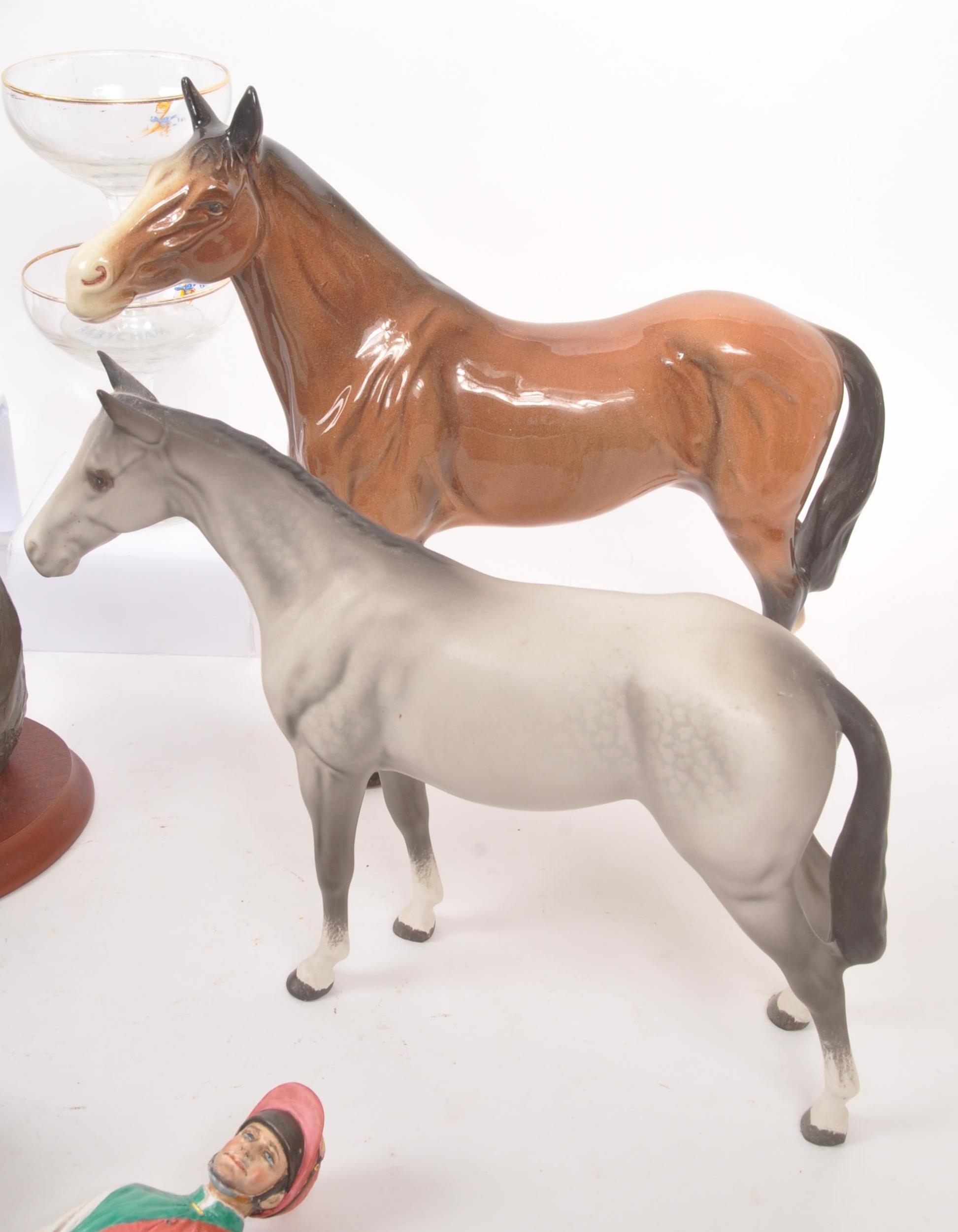 Beswick - Collection of porcelain china horse statues / figurines. Together with jockey statues (af), horse head signed bust on wooden plinth base, smaller examples of horse figures and Babycham retro glass. Two horses stamped Beswick. Tallest measures approx. 27cm tall.