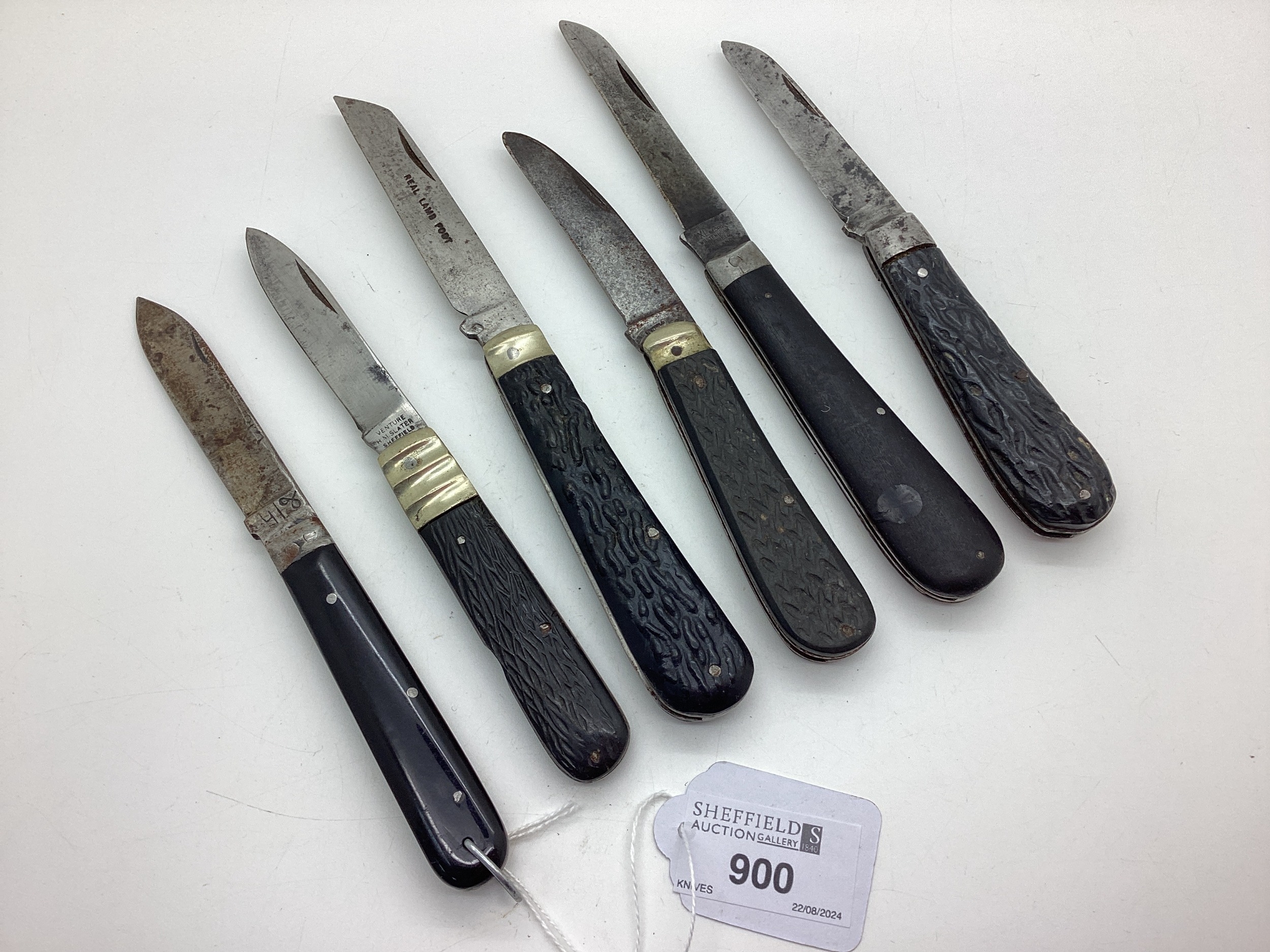 Single Blade Folding Knives, including Real Lamb Foot, H.M. Slater, I.XL George Wostenholm, etc (9cm-10.6cm closed) (rust). (6)