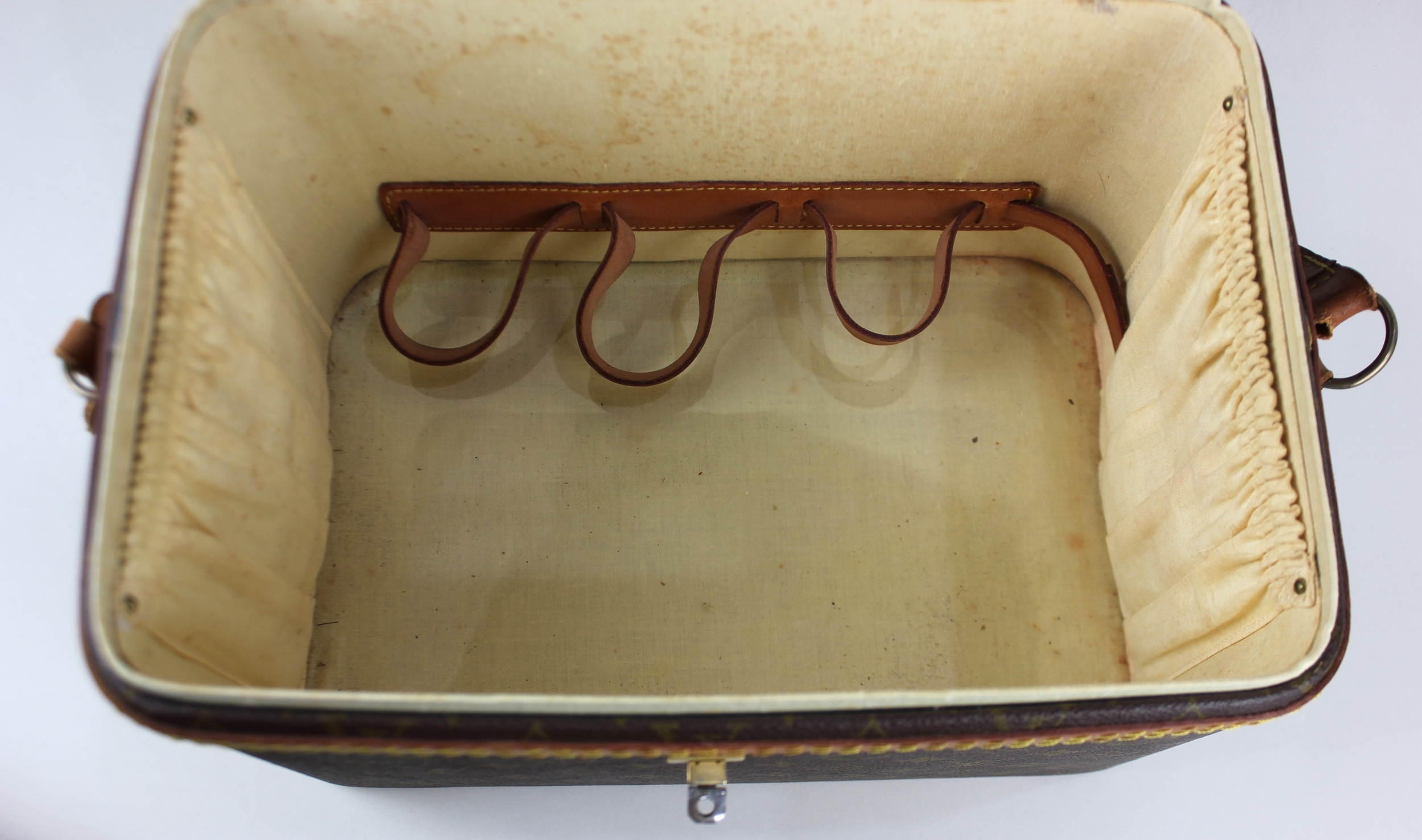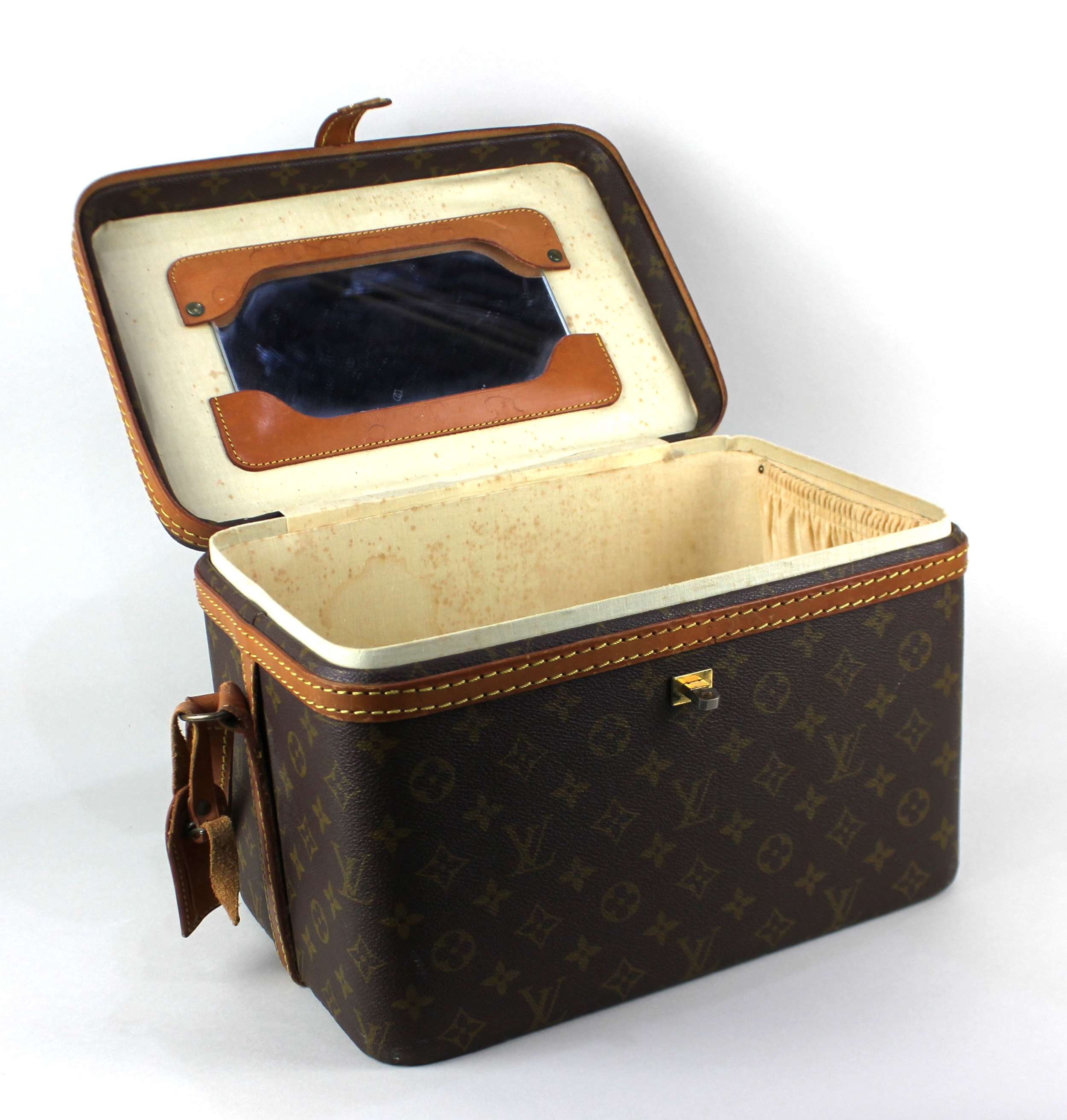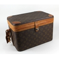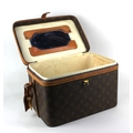 A Louis Vuitton vanity case with leather trim and strap case 22cm high by 32cm wide by 21.5cm deep