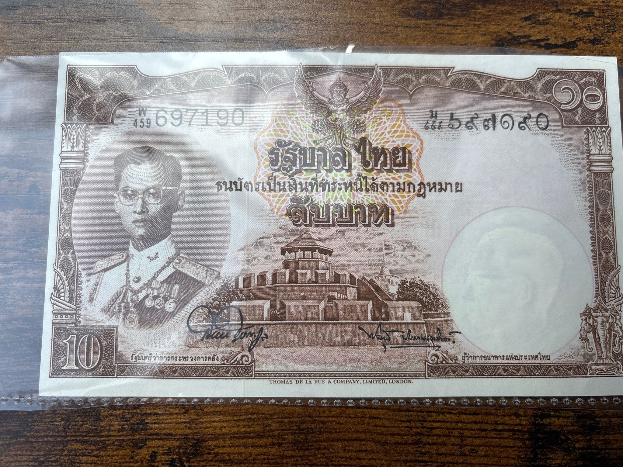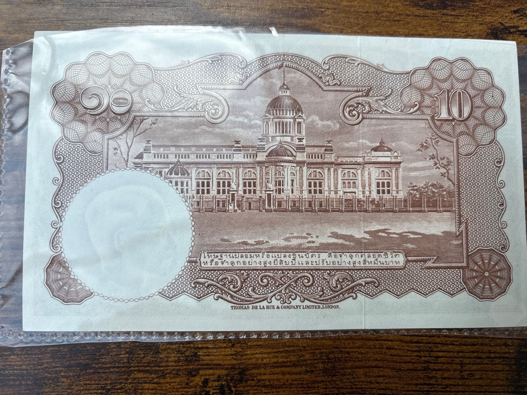 Thailand 10 Baht Banknote – King Bhumibol Adulyadej (Rama IX) Vintage Thai 10 Baht banknote featuring King Bhumibol Adulyadej with detailed architectural design to the centre and reverse. A classic mid-century issue with strong traditional engraving and symmetry.