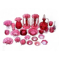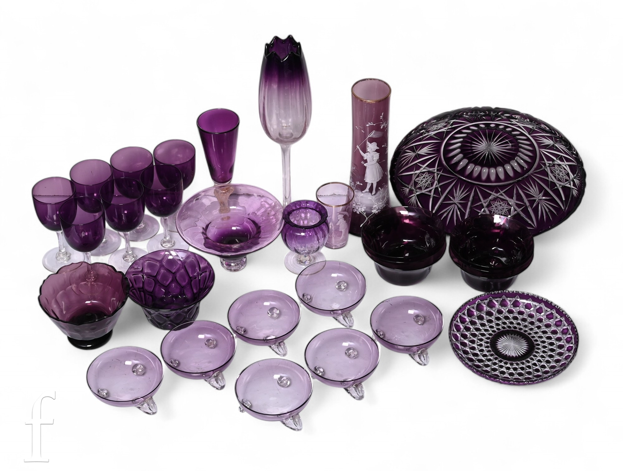 A collection of 19th and 20th Century Amethyst glass, including stem ware, finger bowls, a set of mid Century Maisonnette Marguerite coffee cups, a Czechoslovakian amethyst over clear glass bowl, star and mitre cut over slice cut band and star cut base, diameter 28cm, and a Mary Gregory style enamelled glass vase, tapered sleeve form, height 24cm. (qty)