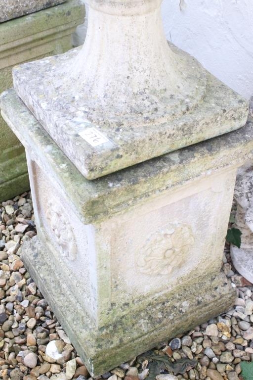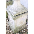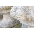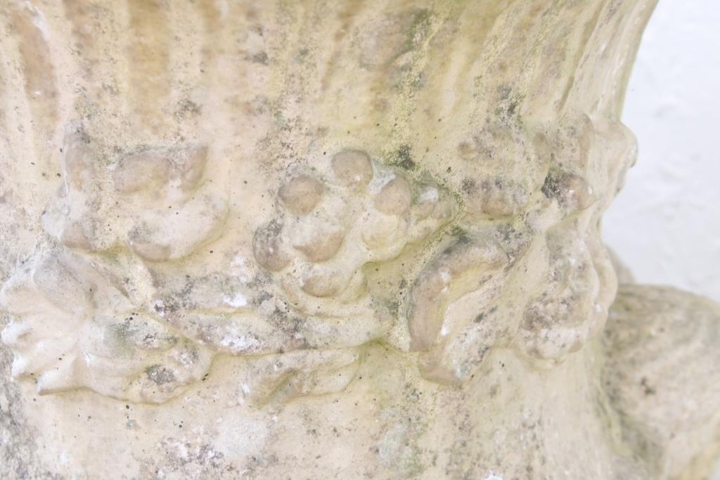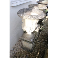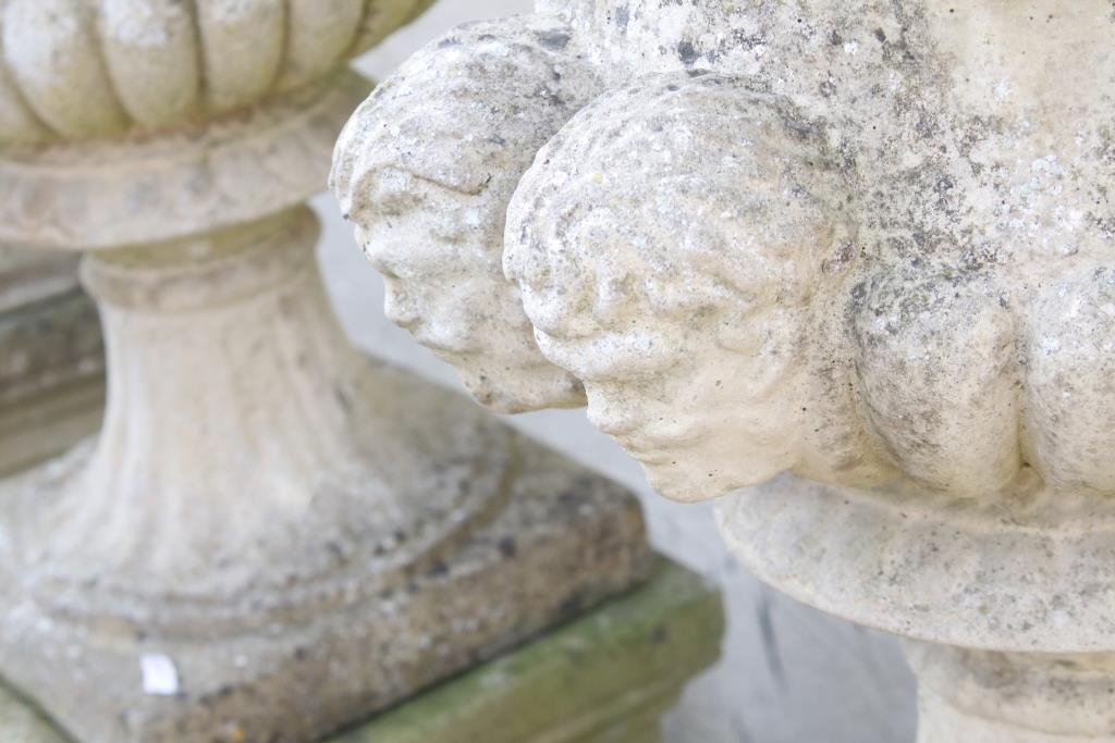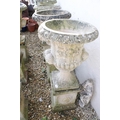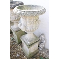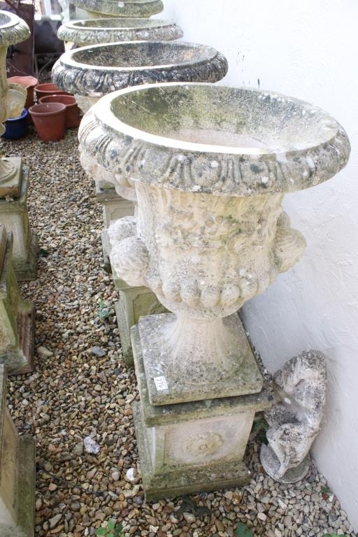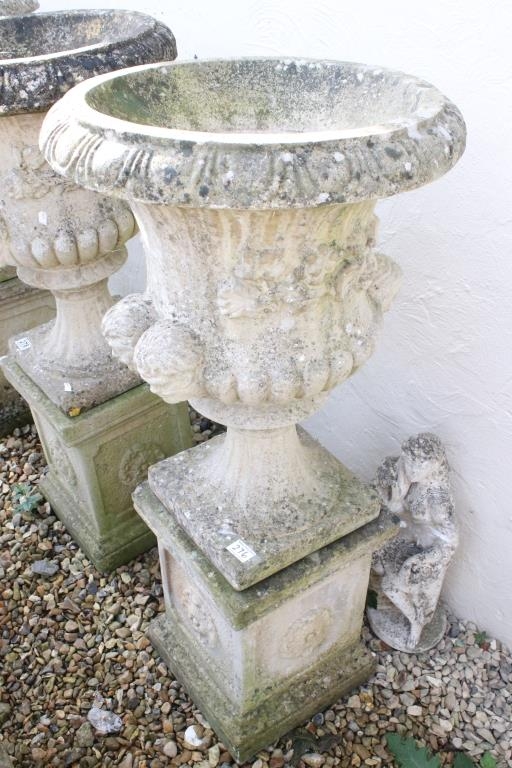 Pair of reconstituted stone garden urns of campana form, with relief facial mask decoration and gadrooned lower sections, raised on square pedestal bases. (Measure approx 107cm high)