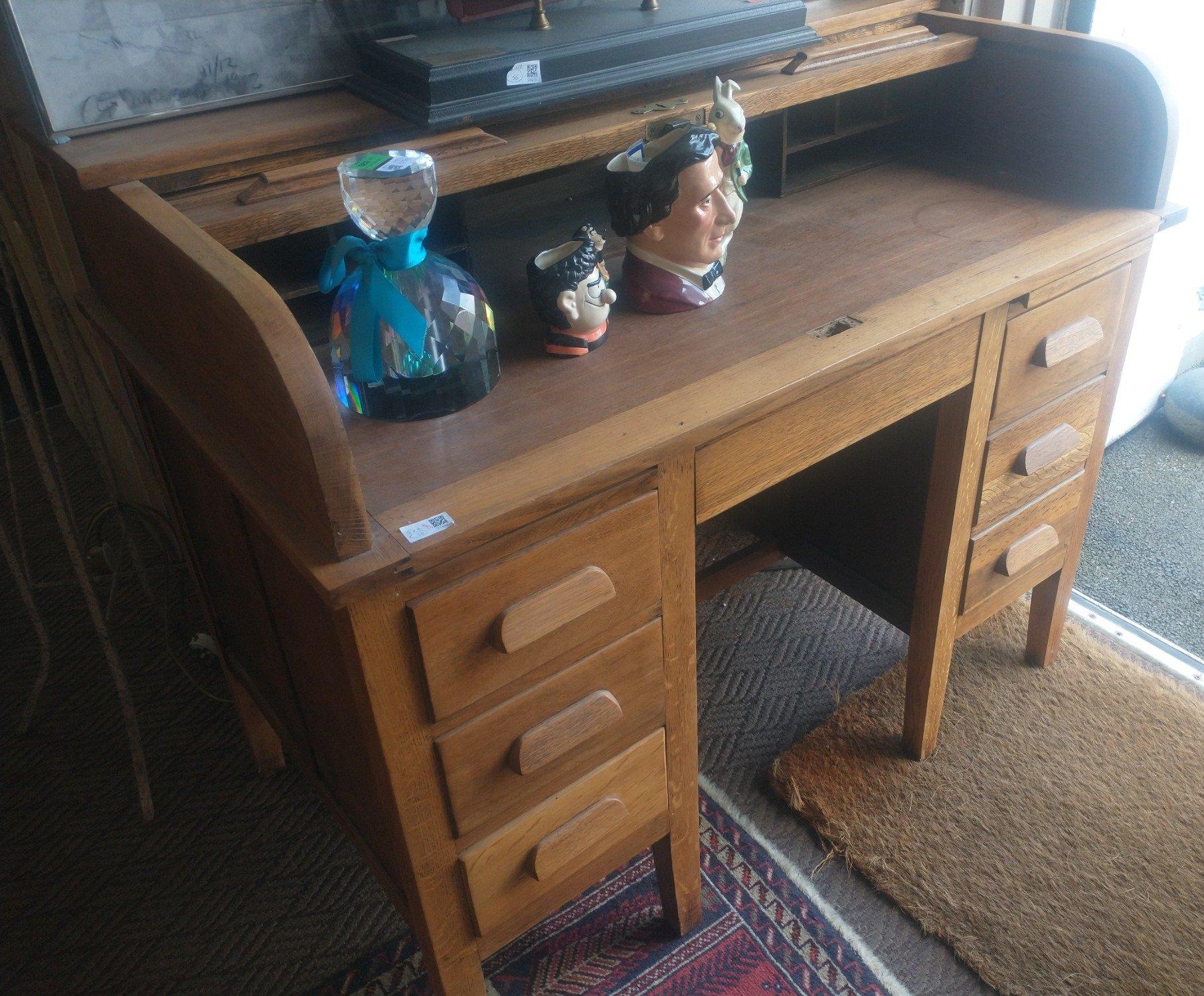 ANTIQUE - A SUBSTANTIAL light oak roll-top knee-hole desk with 6 drawers - the roller top is in good condition