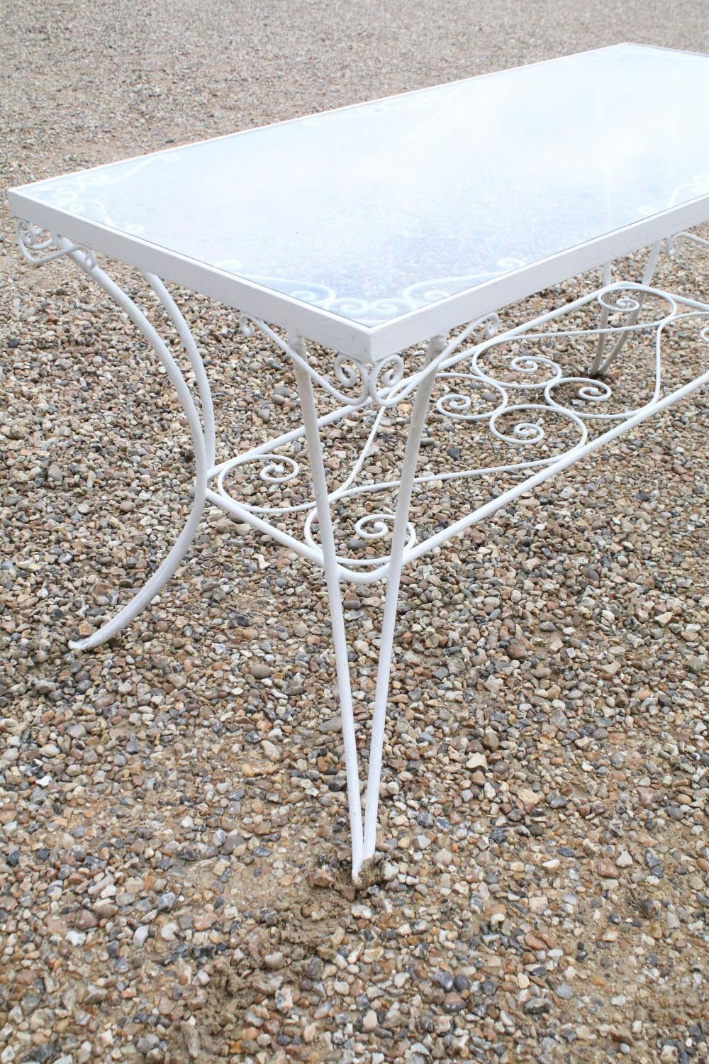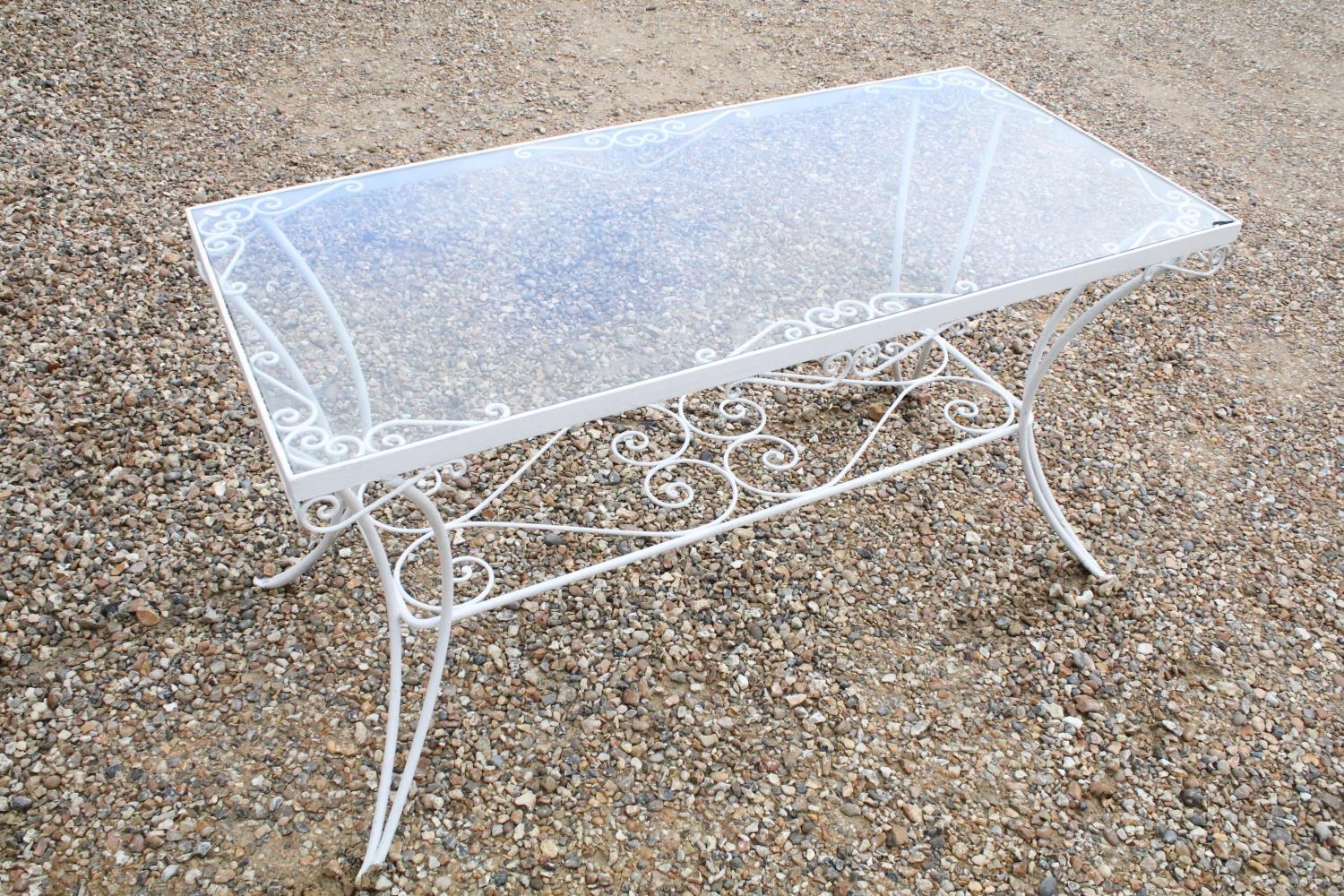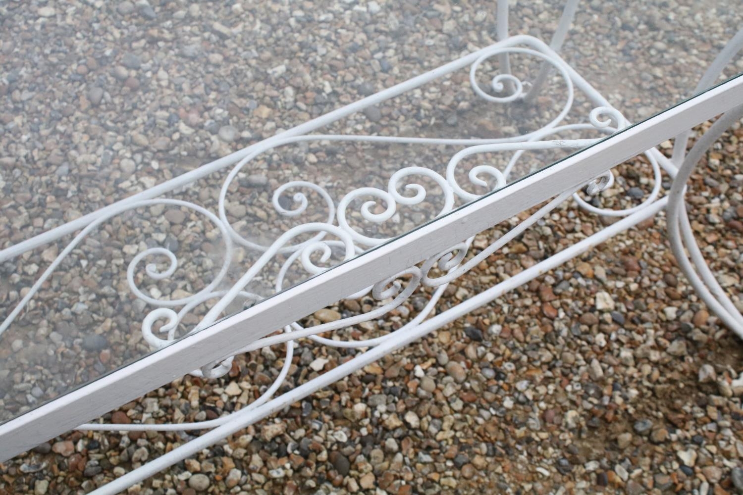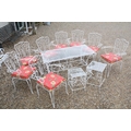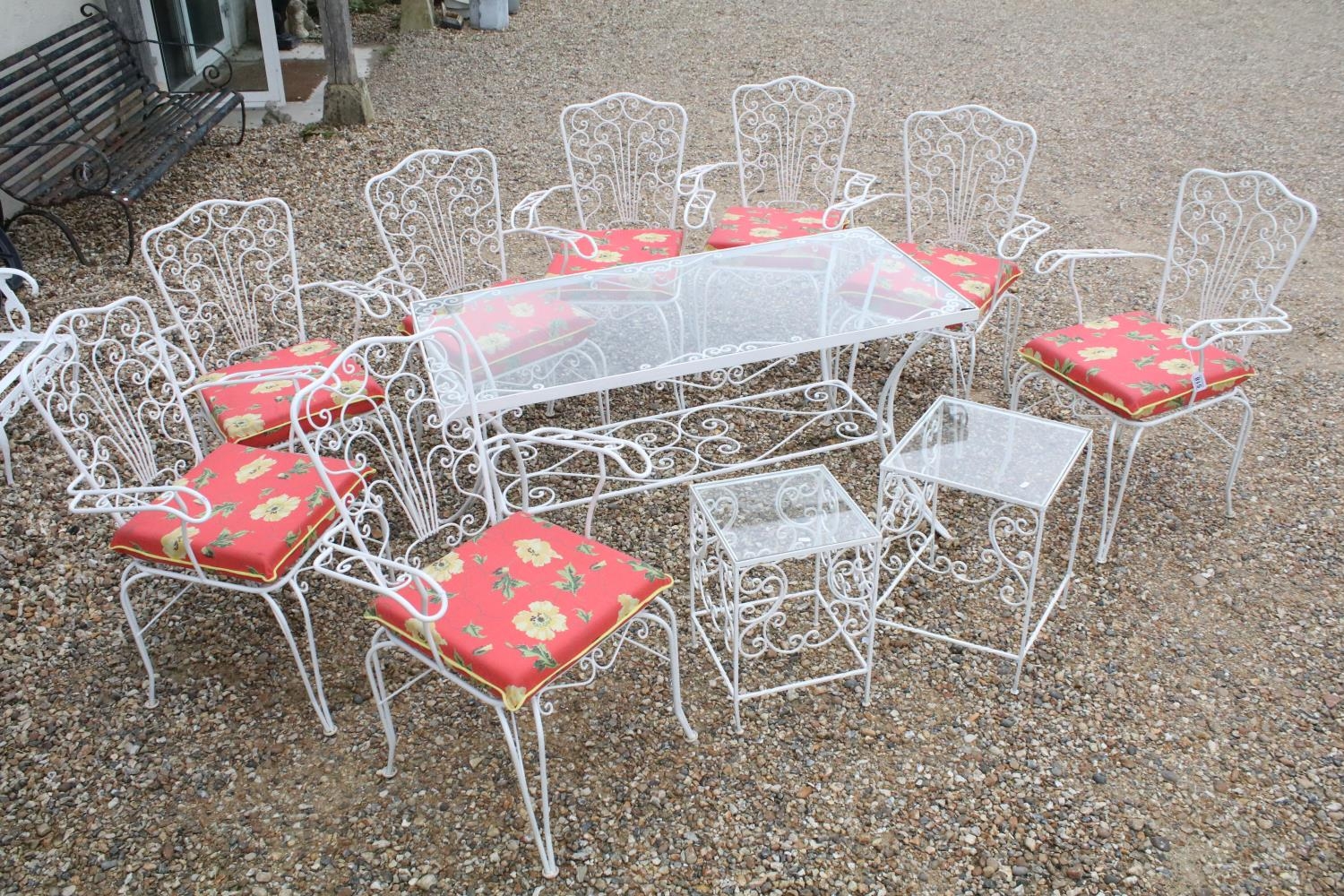 White painted metal patio table set comprising a glass topped table with eight chairs and two glass topped drinks tables, the set of scrolled design. (Table measures approx 131cm long x 61cm wide)