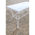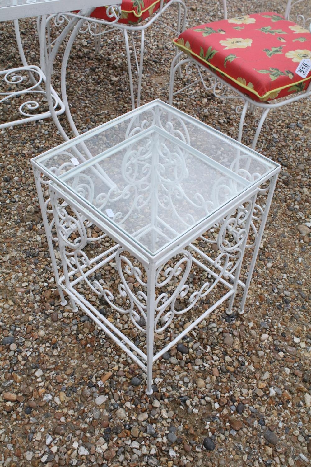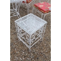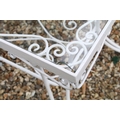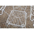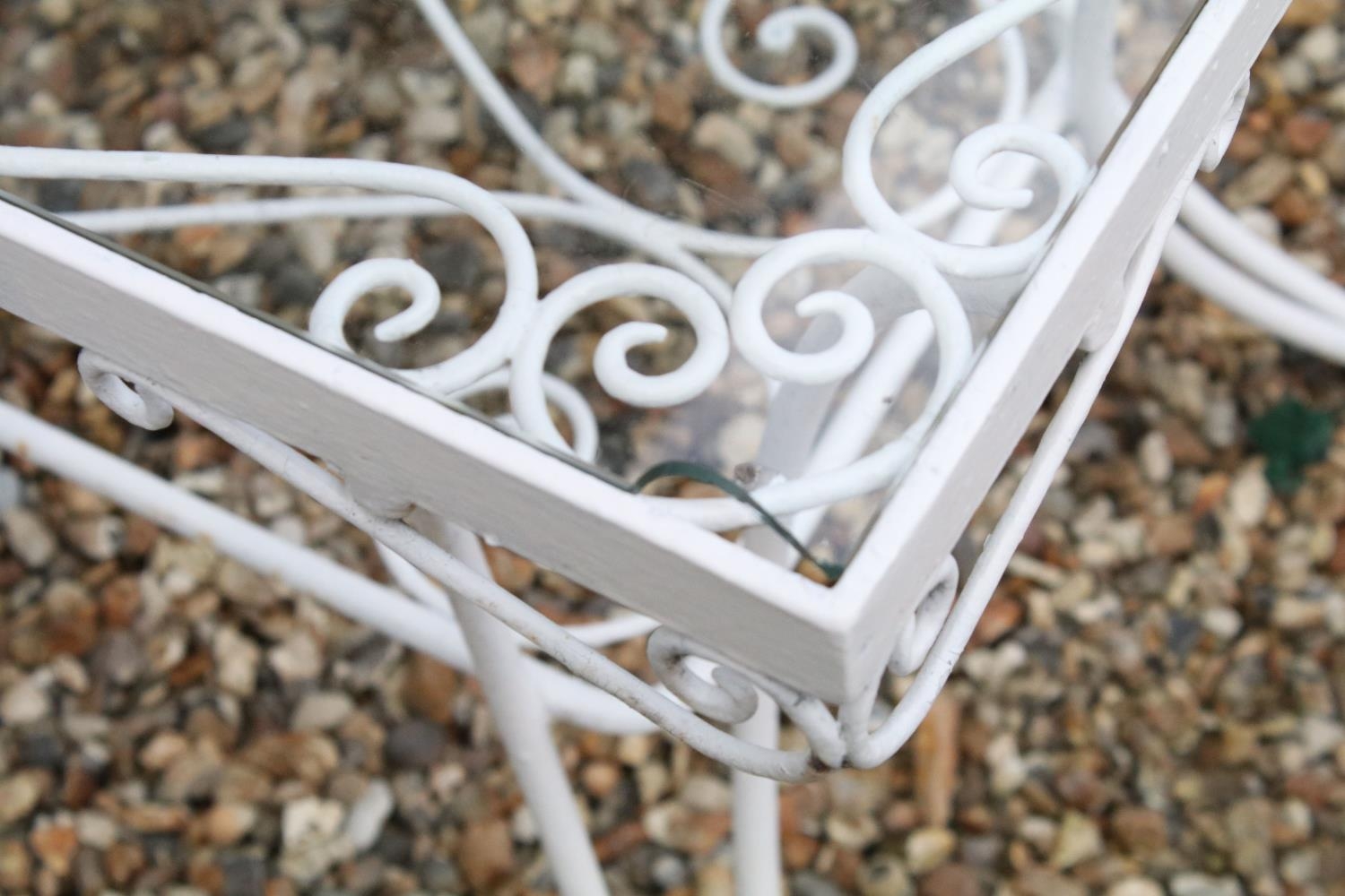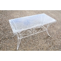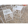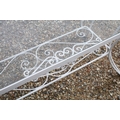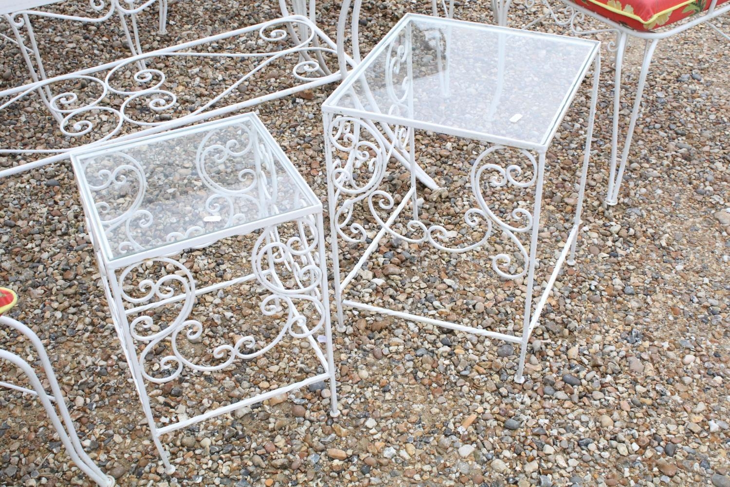 White painted metal patio table set comprising a glass topped table with eight chairs and two glass topped drinks tables, the set of scrolled design. (Table measures approx 131cm long x 61cm wide)