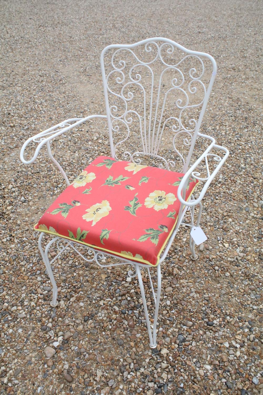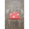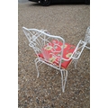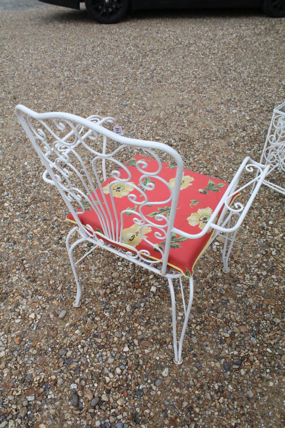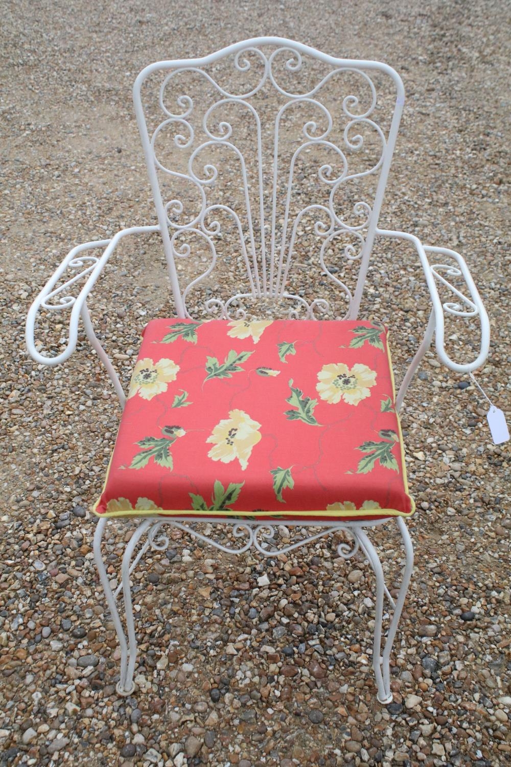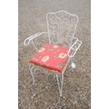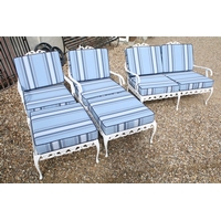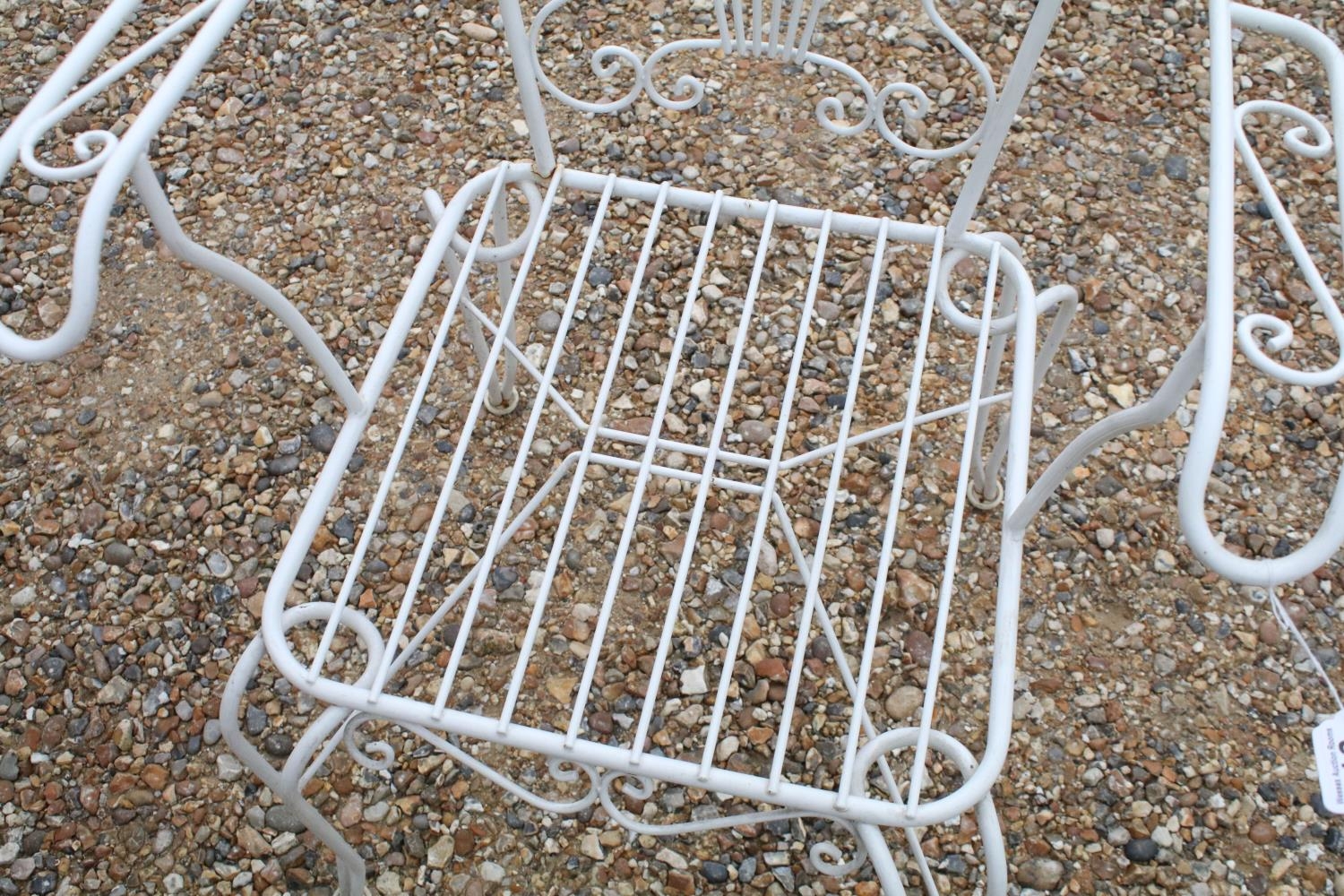 White painted metal patio table set comprising a glass topped table with eight chairs and two glass topped drinks tables, the set of scrolled design. (Table measures approx 131cm long x 61cm wide)