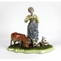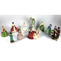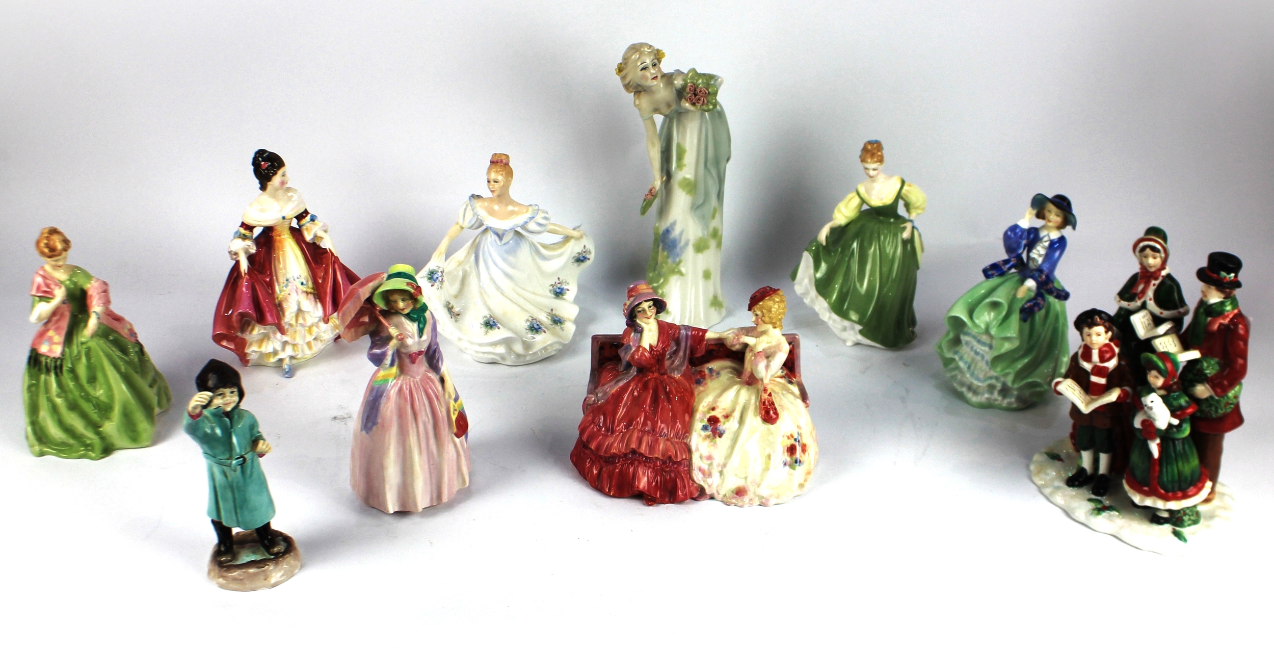A Royal Doulton 'Reflections - Summer Darling' figurine, HN3091, together with seven further Royal Doulton figures, including; 'Miss Demure', 'The Gossips' hand numbered and signed 'HN1429' (AF), 'Fair Lady' HN2193, 'Southern Belle' HN2299, 'Kathy' HN3305, 'Top 'O The Hill' HN1832 (blue/ green), two Royal Worcester figurines 'February' 3454 and 'First Dance' 3629, and an unmarked figure group of carol singers, the first height 29cm (10)