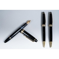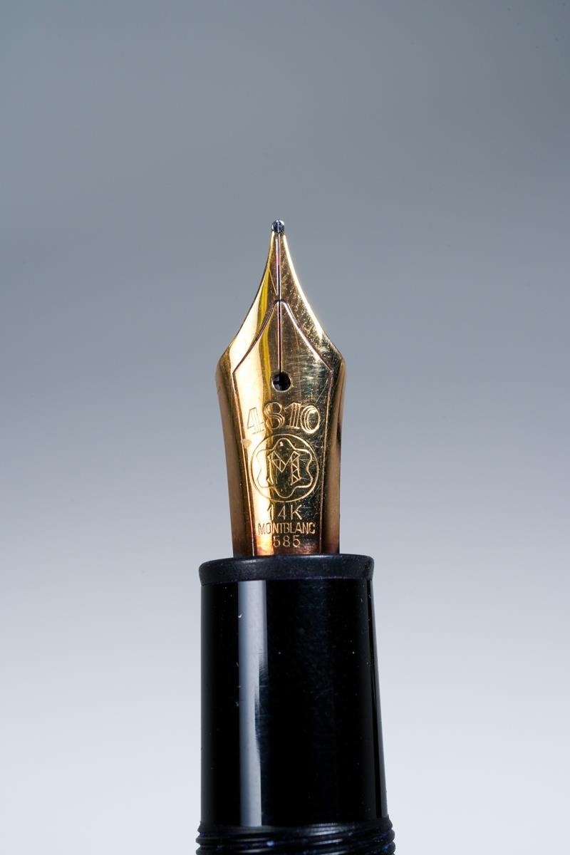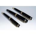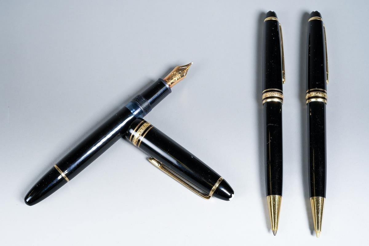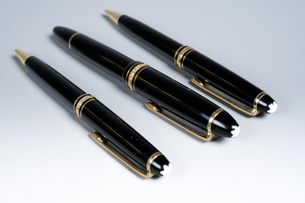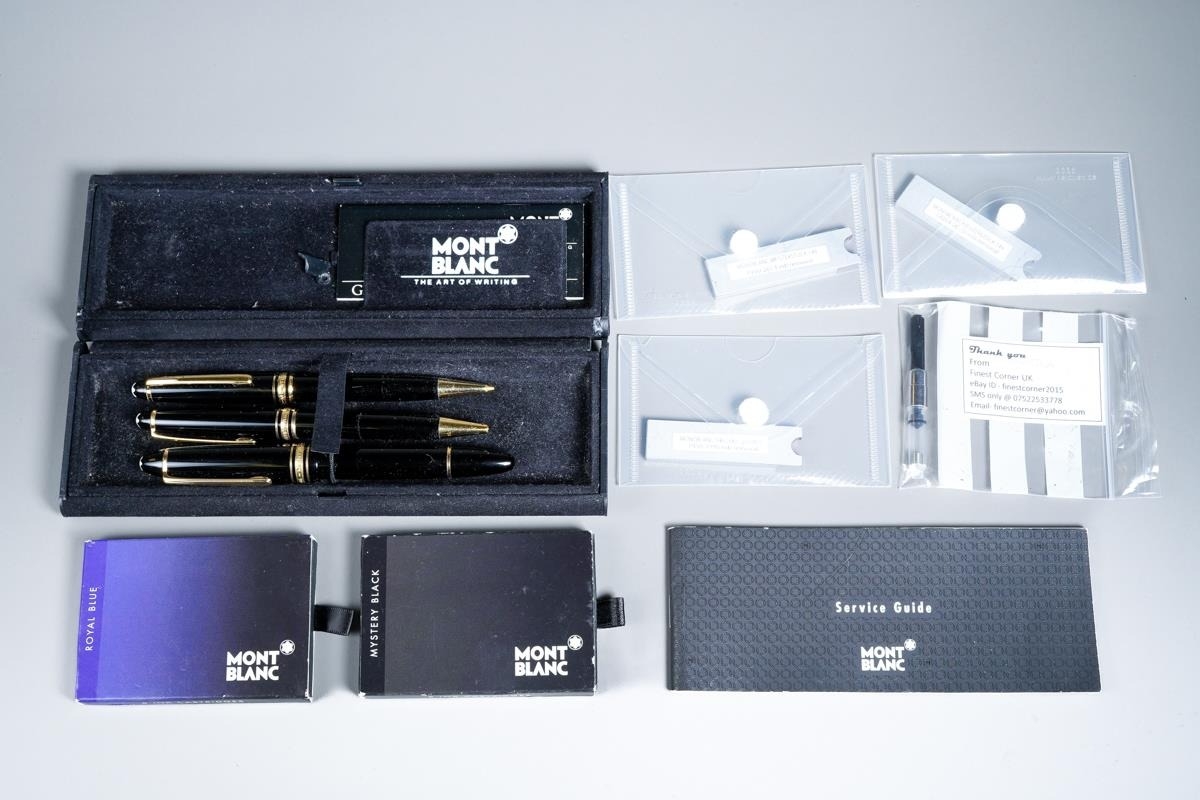 A Montblanc Meisterstuck Trio to include a black and gilt Fountain Pen, 14k gold nib stamped 4810, the clip mounted etched W GERMANY, a ball point pen, serial no: HB260359 and pencil holder, the clip etched W GERMANY, in fitted case [3]