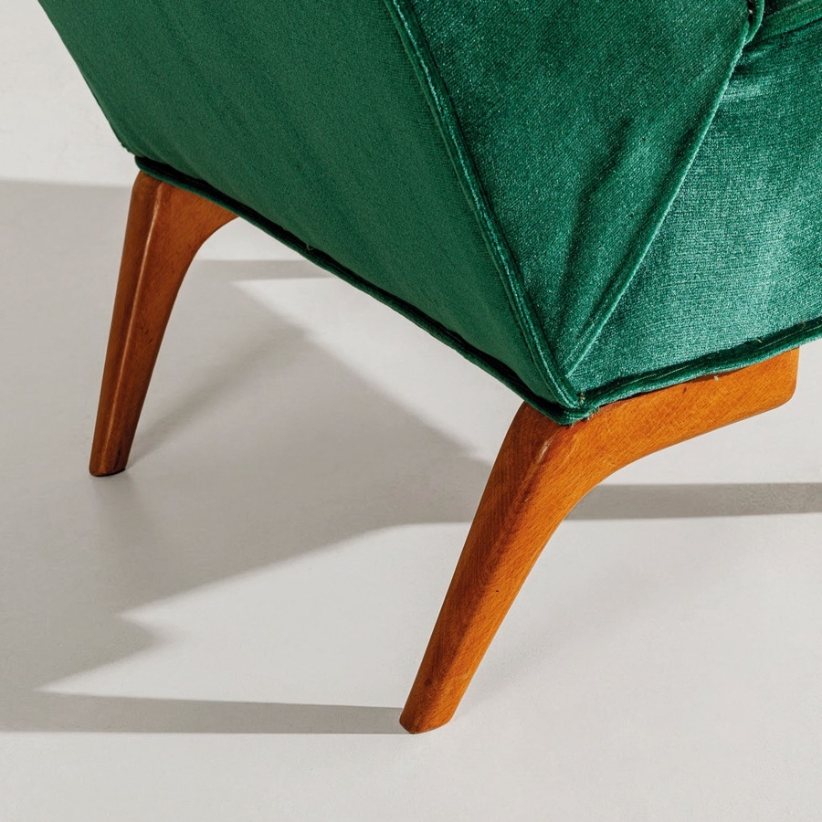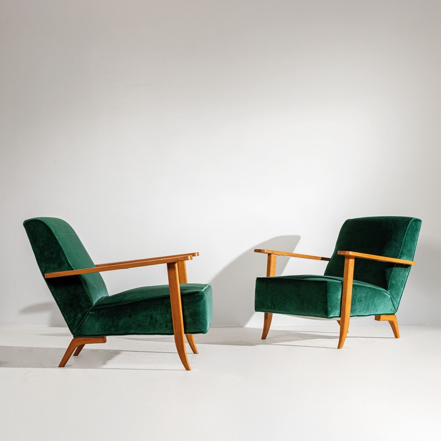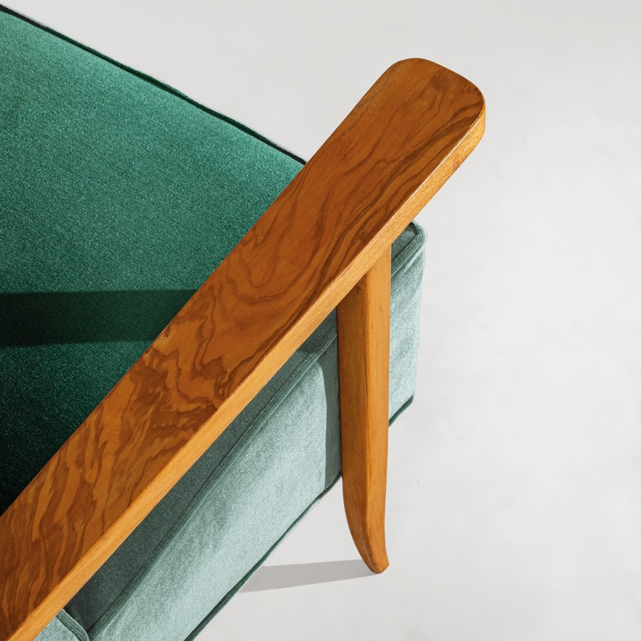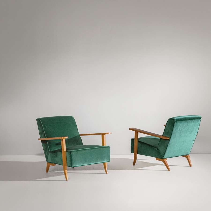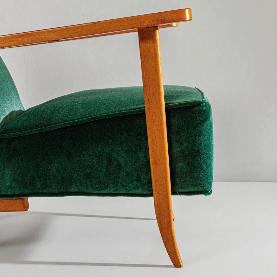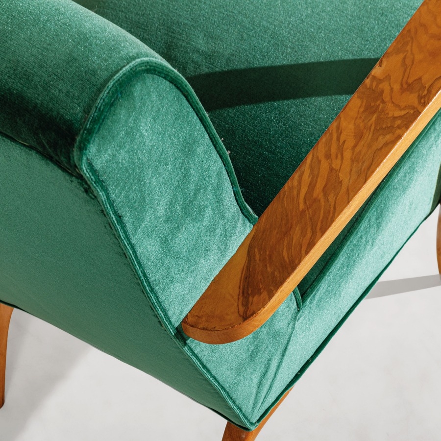 Coppia di poltrone. Legno di acero, radica, tessuto imbottito. produzione Casa & Giardino; Italia anni '40. Perizia Gio Ponti Archives.