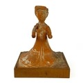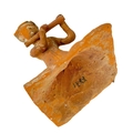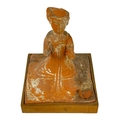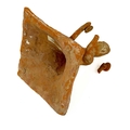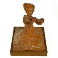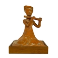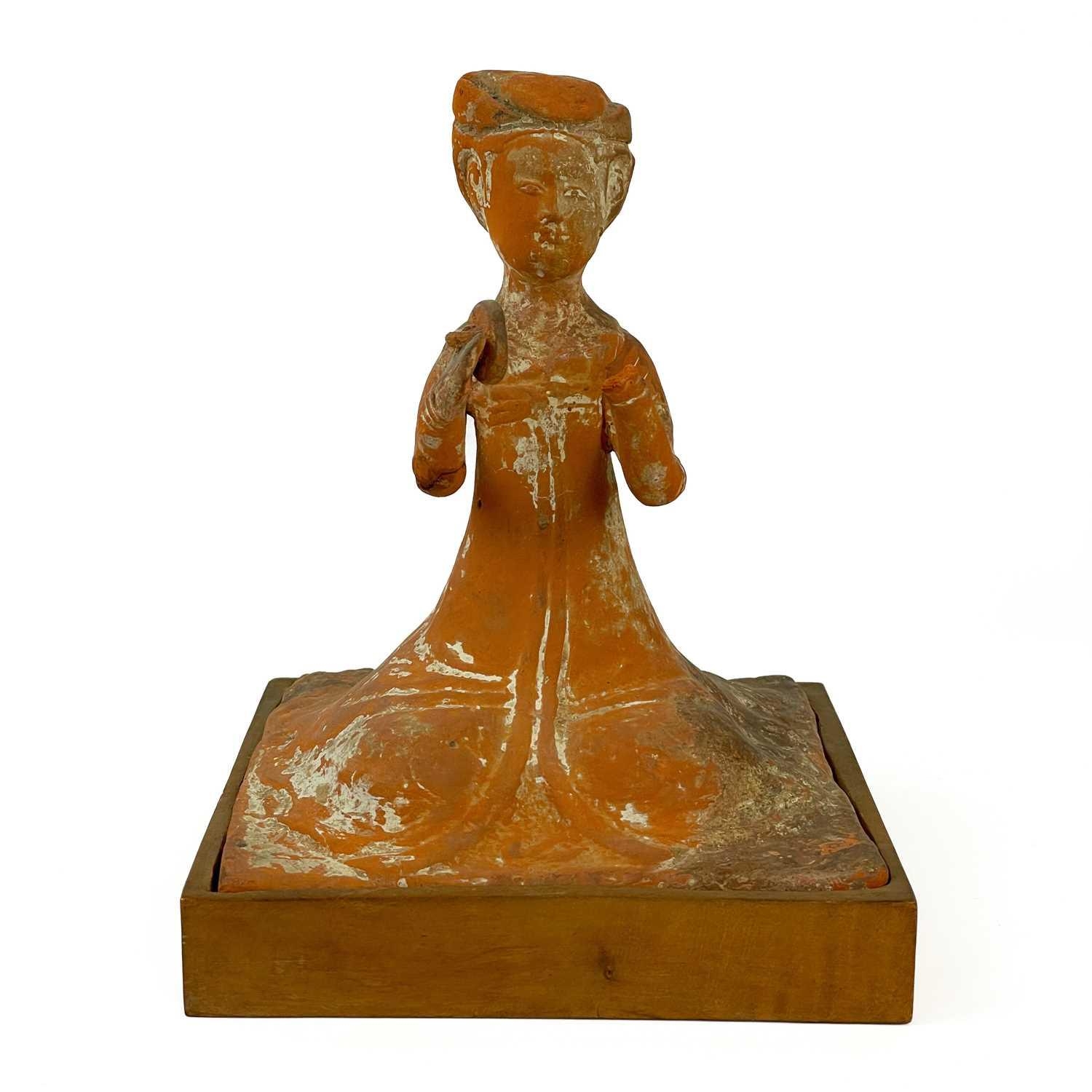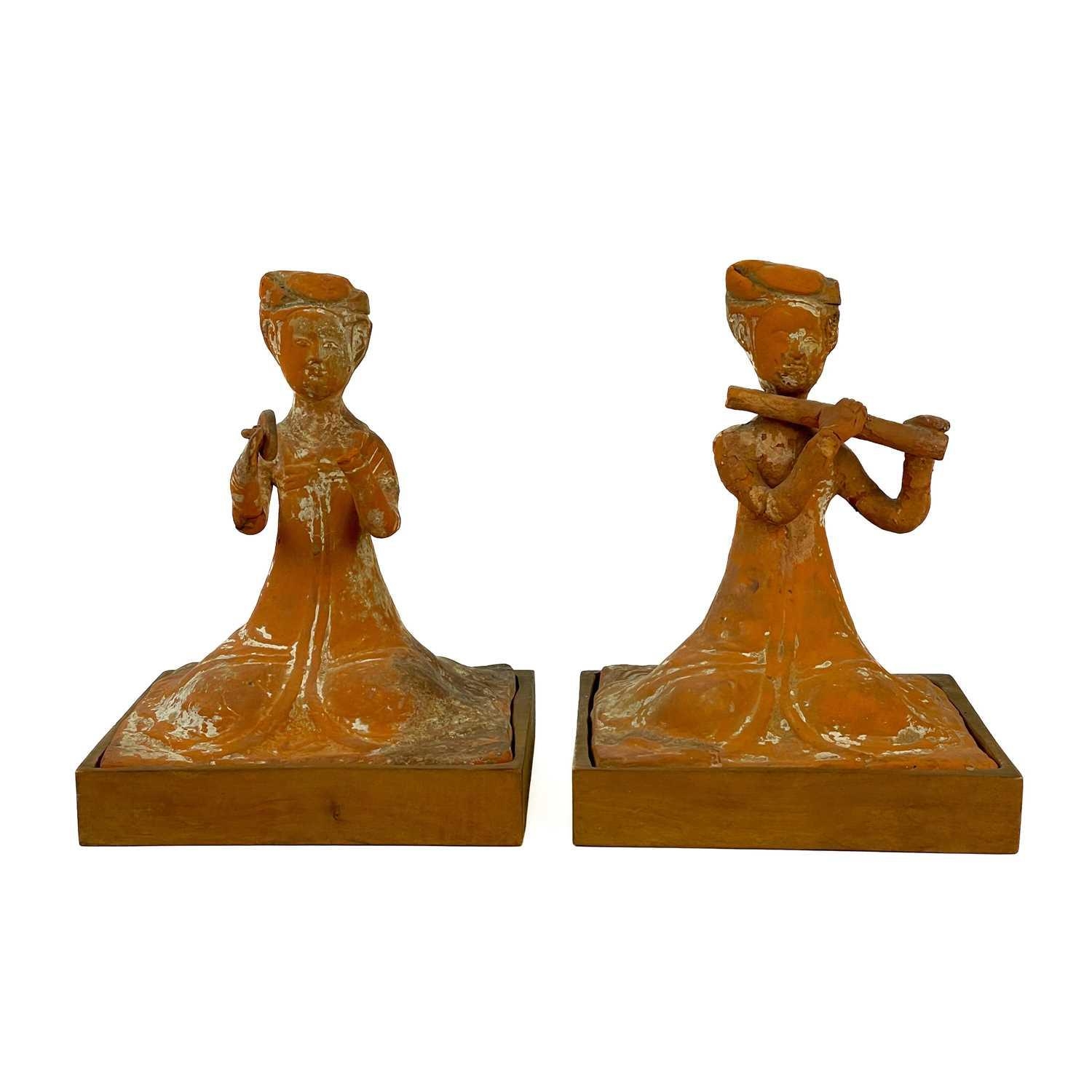 A pair of Chinese terracotta tomb musicians, Tang style. Each on square wooden stands, height of tile 18cm, width 13cm, depth 12cm.