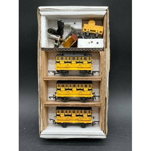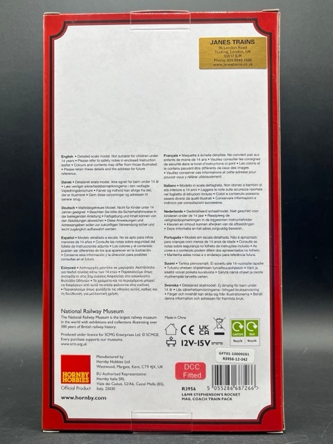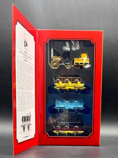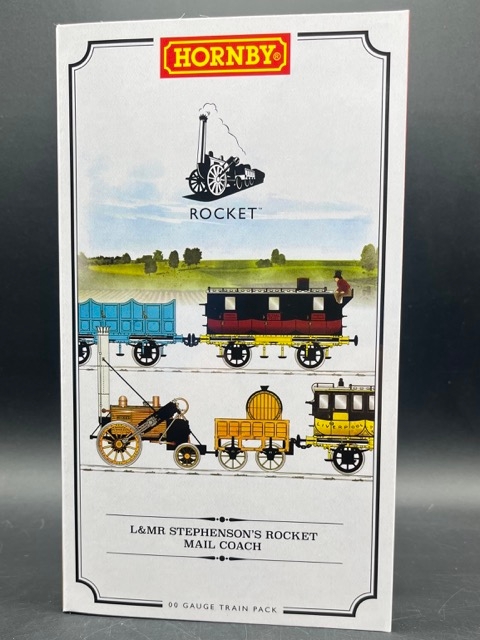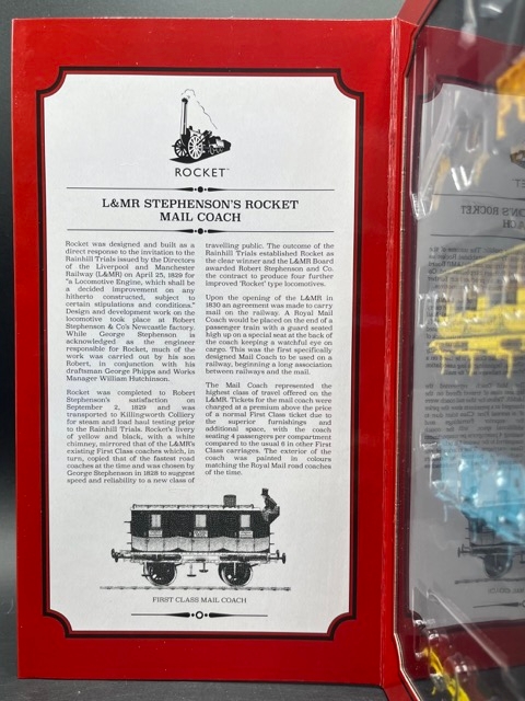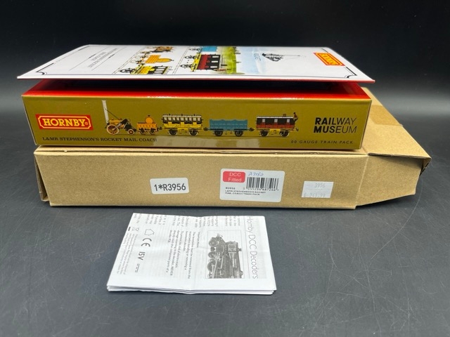 Hornby R3956 Stephenson's Rocket 0-2-2 'Royal Mail' train pack with three Liverpool and Manchester Railway 4 wheel coaches with Hornby R7150 DCC decoder fitted