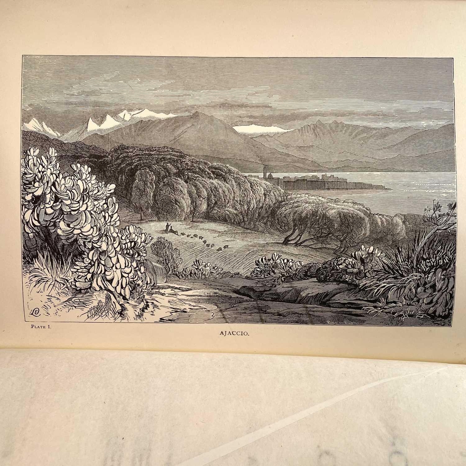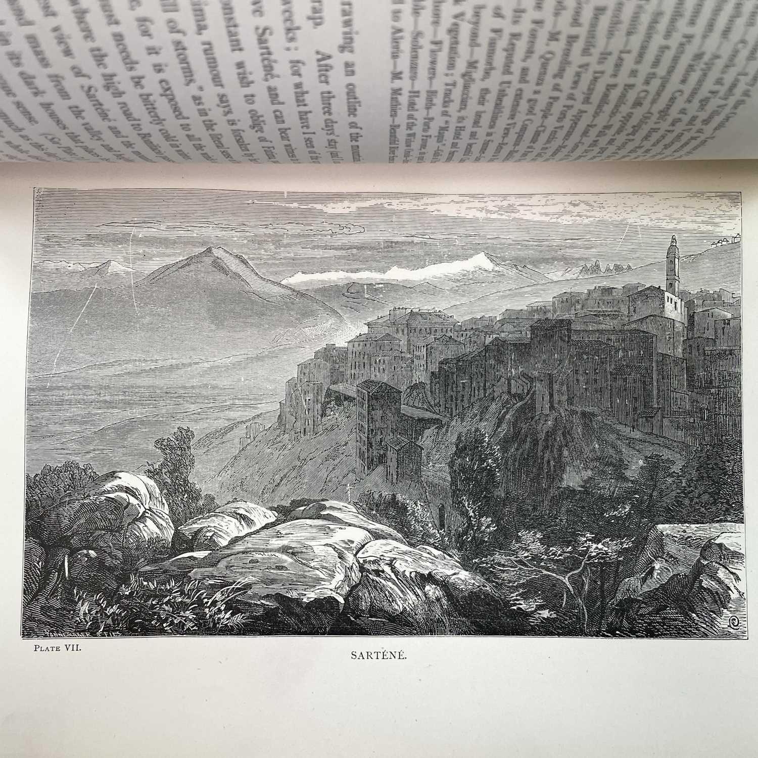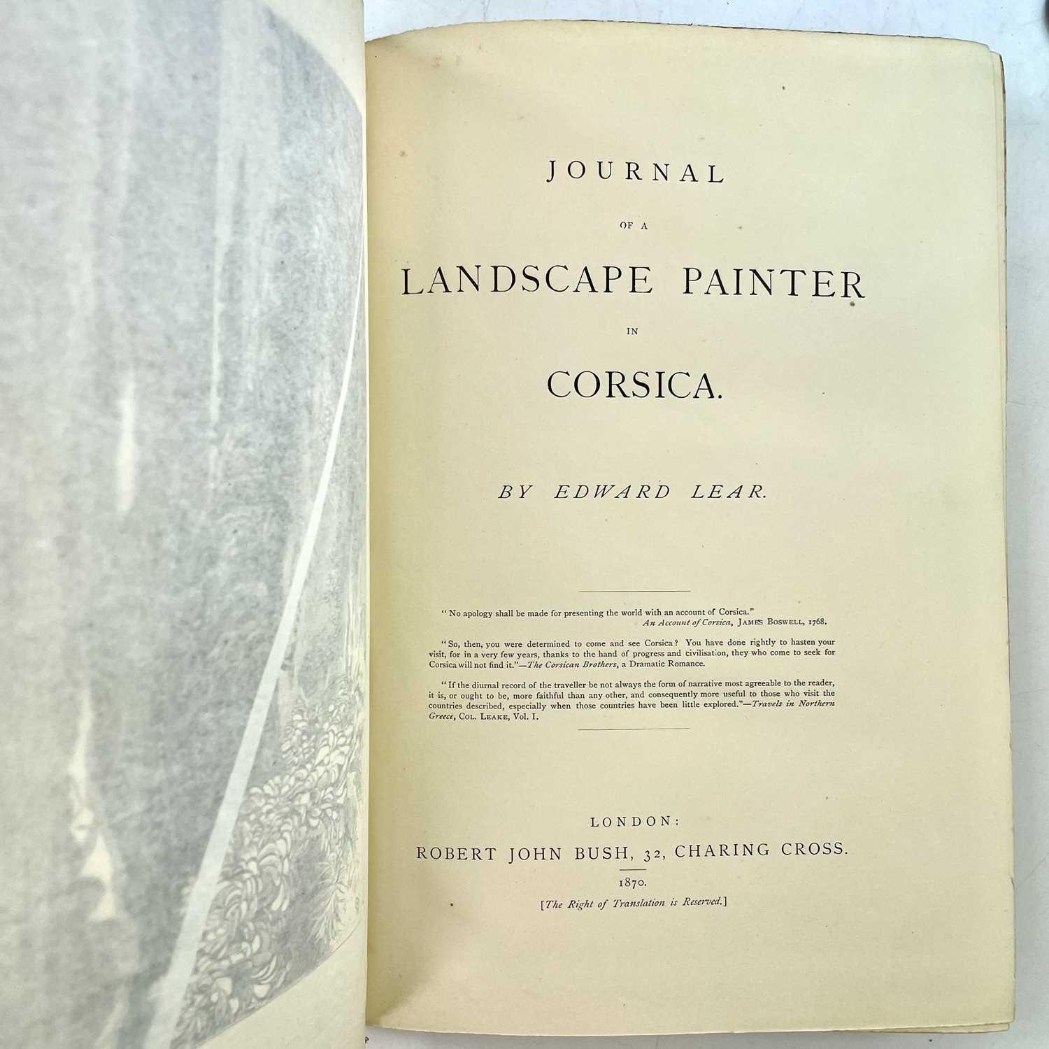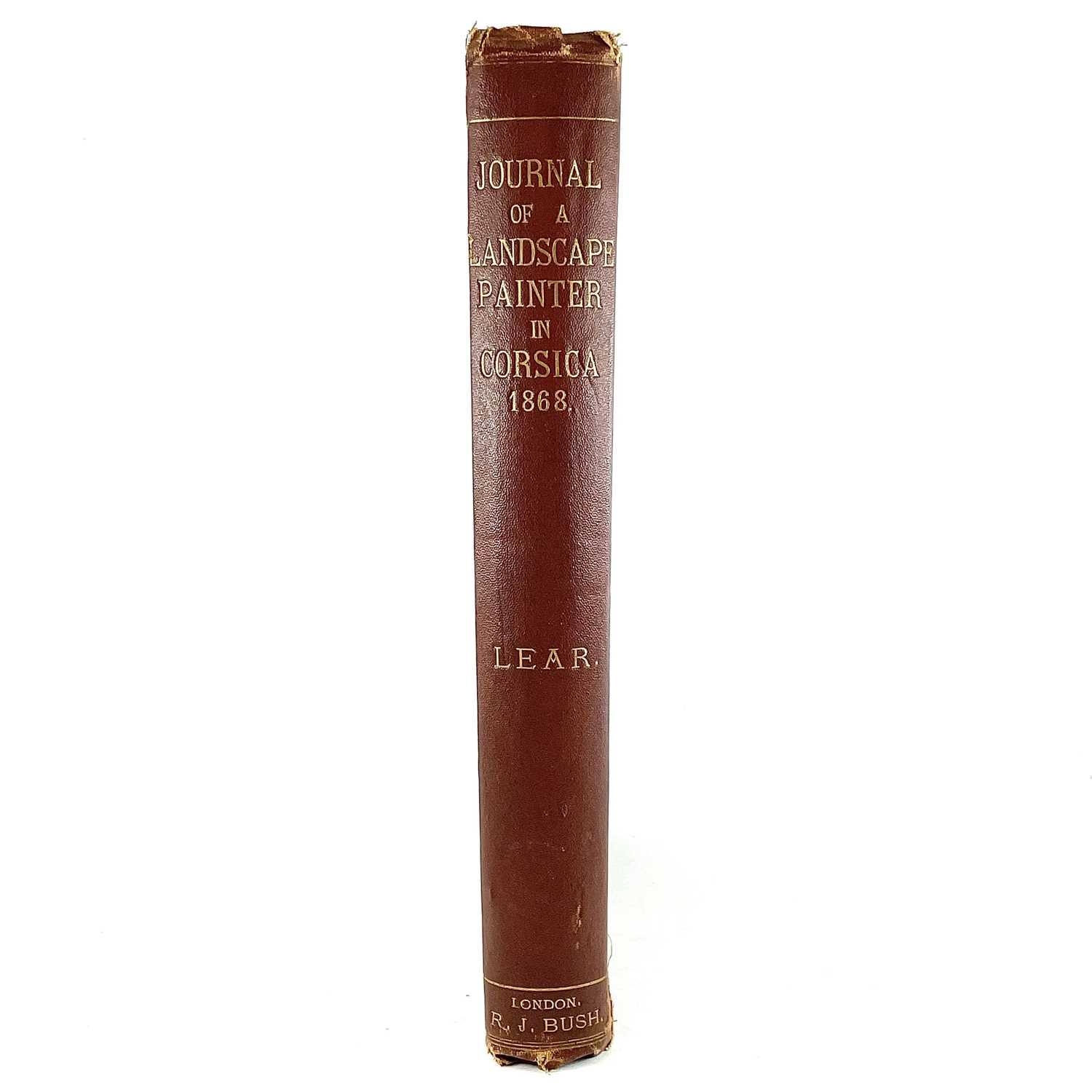 EDWARD LEAR. 'Journal of a Landscape Painter in Corsica,' first edition, original russet cloth, split to joint, rubbed and bumped, half title, frontispiece, wood-engraved plates, Robert John Bush, London, 1870.