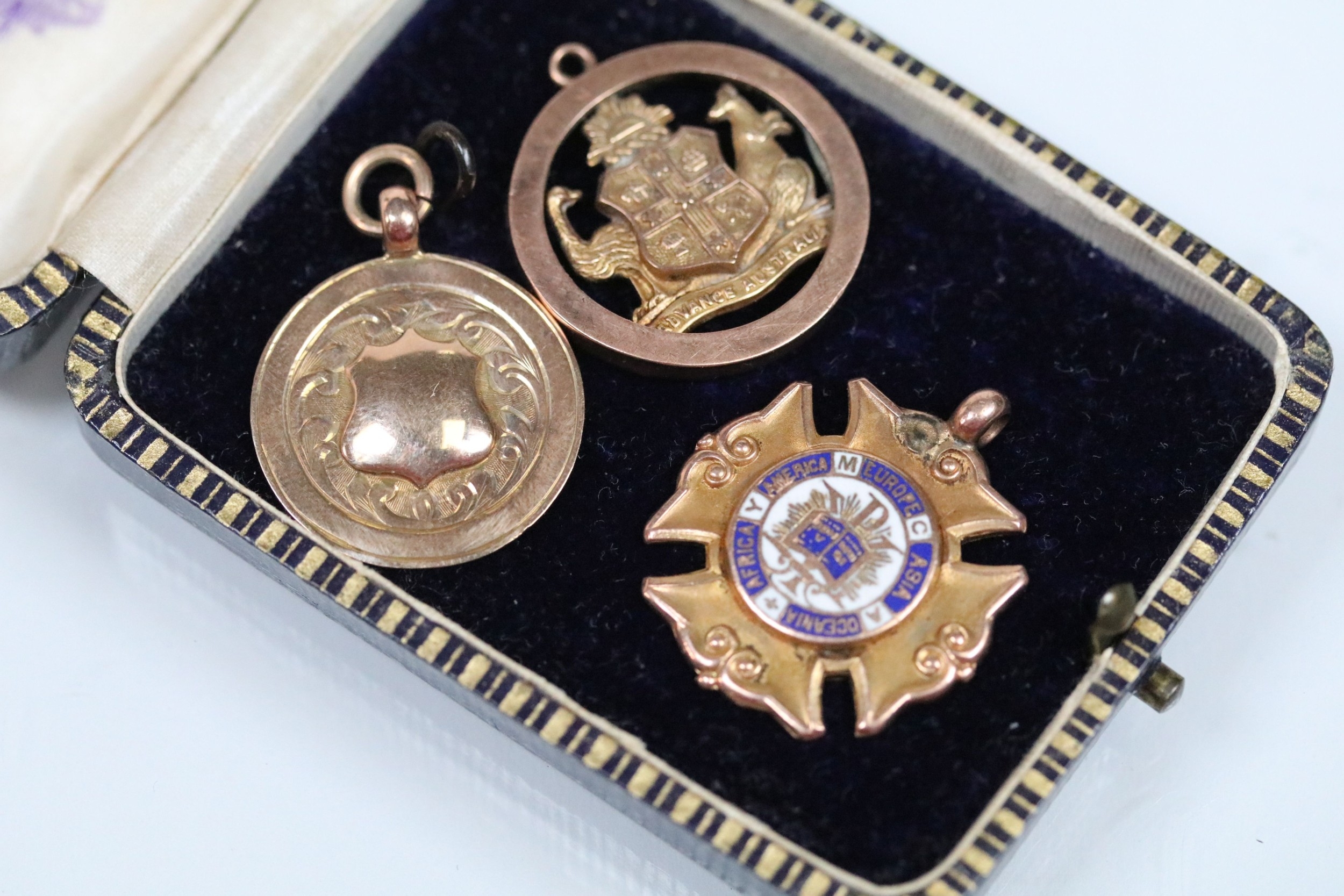 Group of 9ct gold medals to include a 1912 YMCA National Sports medal (hallmarked Birmingham 1911), a 1928 medal (Birmingham 1925), and an Advance Australia medal (tests as 9ct gold).