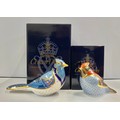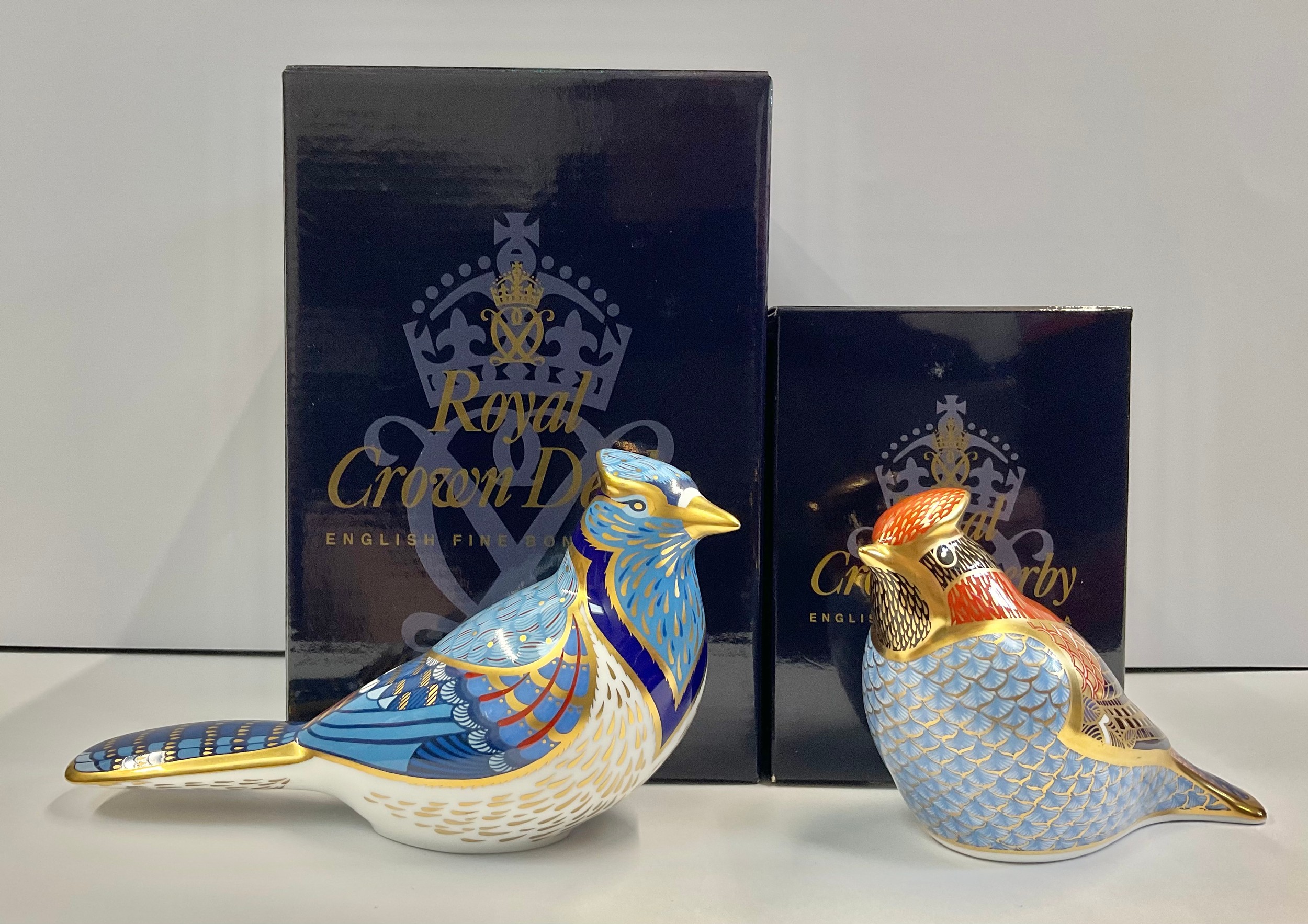 A Royal Crown Derby paperweight, Blue Jay, gold stopper, 16cm long, printed mark in red, boxed; another, Waxwing, gold stopper, 9cm, printed mark in red, boxed (2)