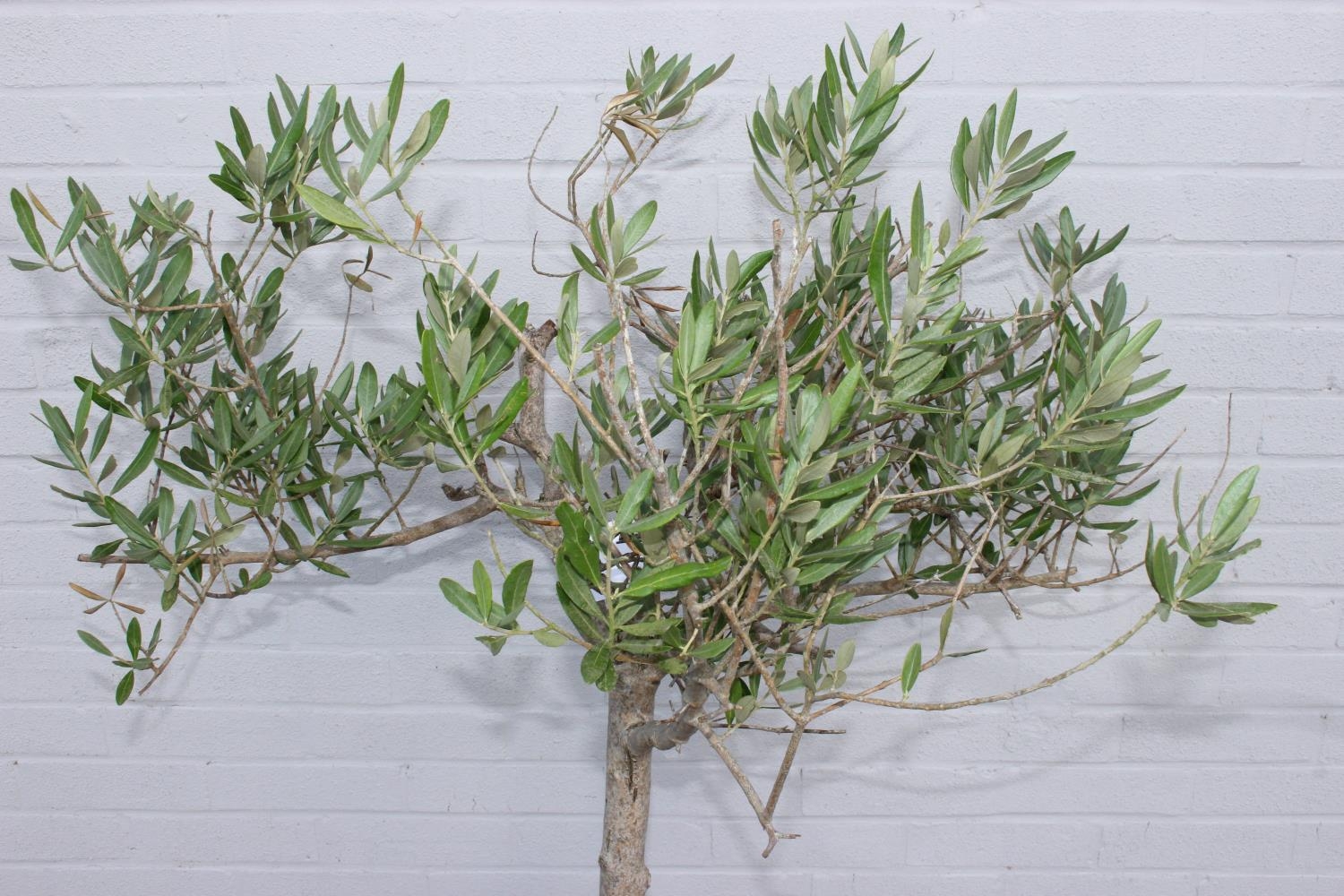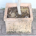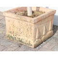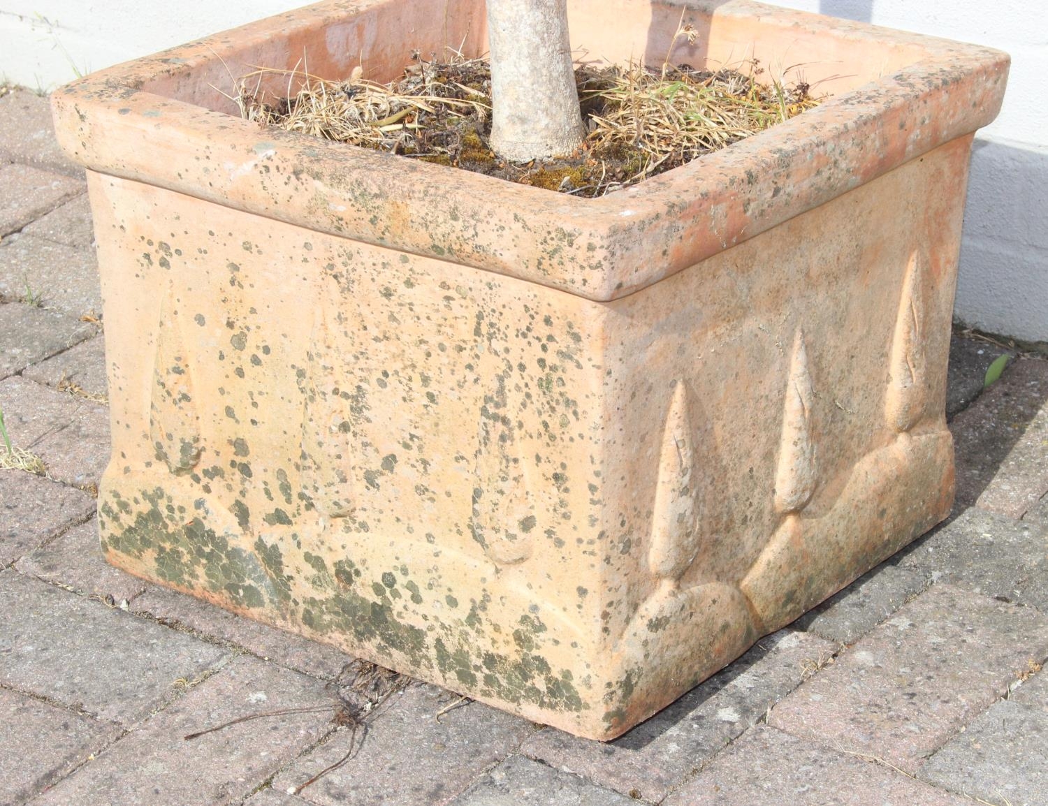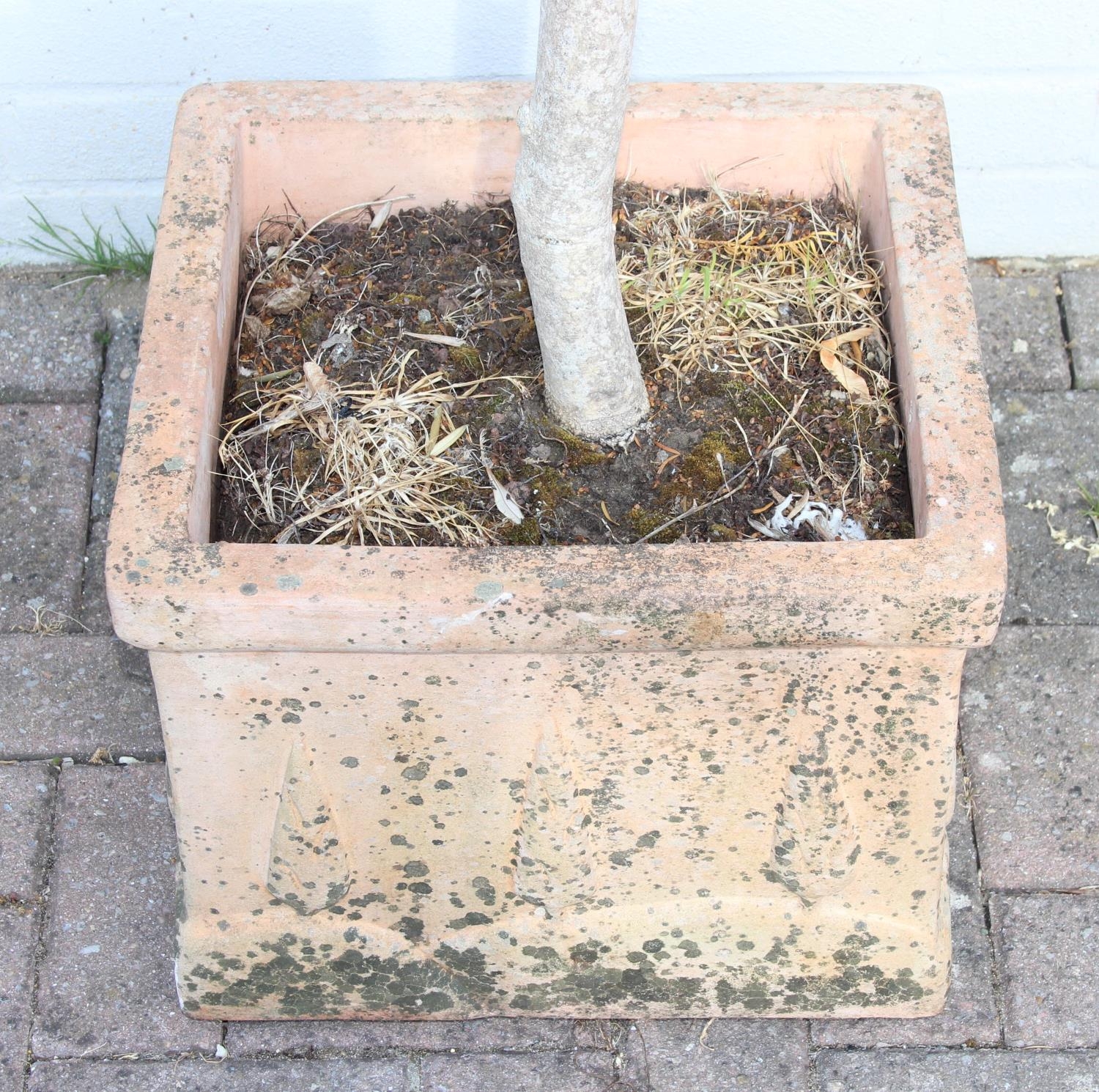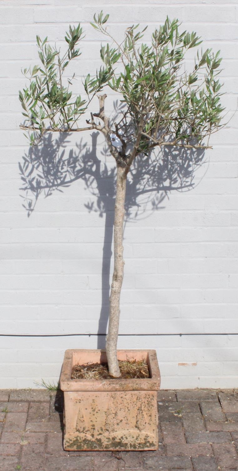 A vintage terracotta garden planter with olive tree, the pot 41cm x square x 32cm tall, the tree 180cm