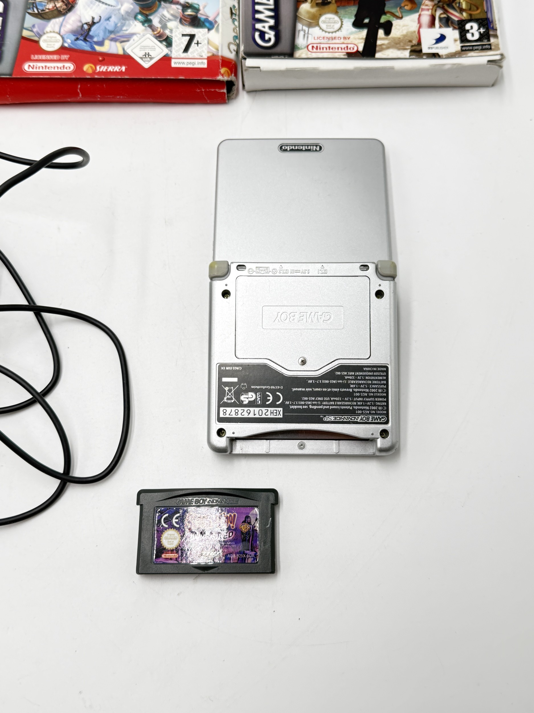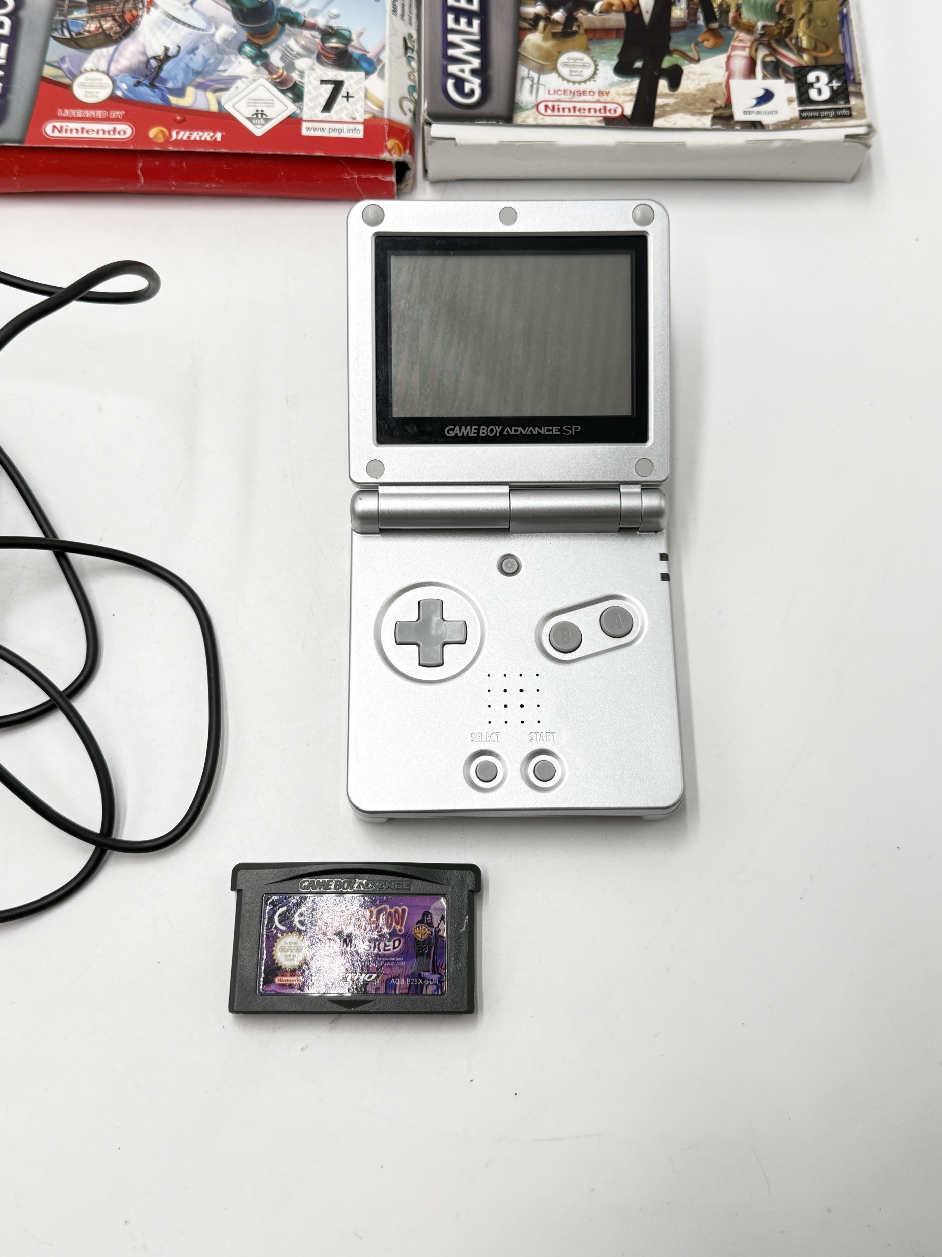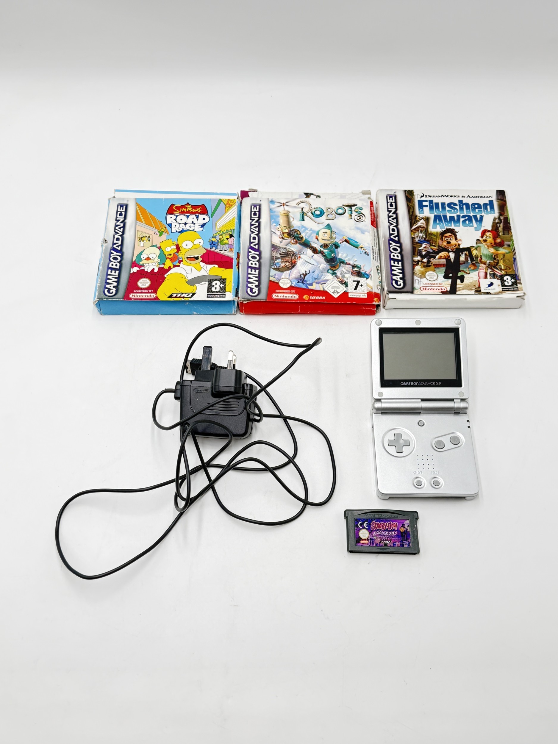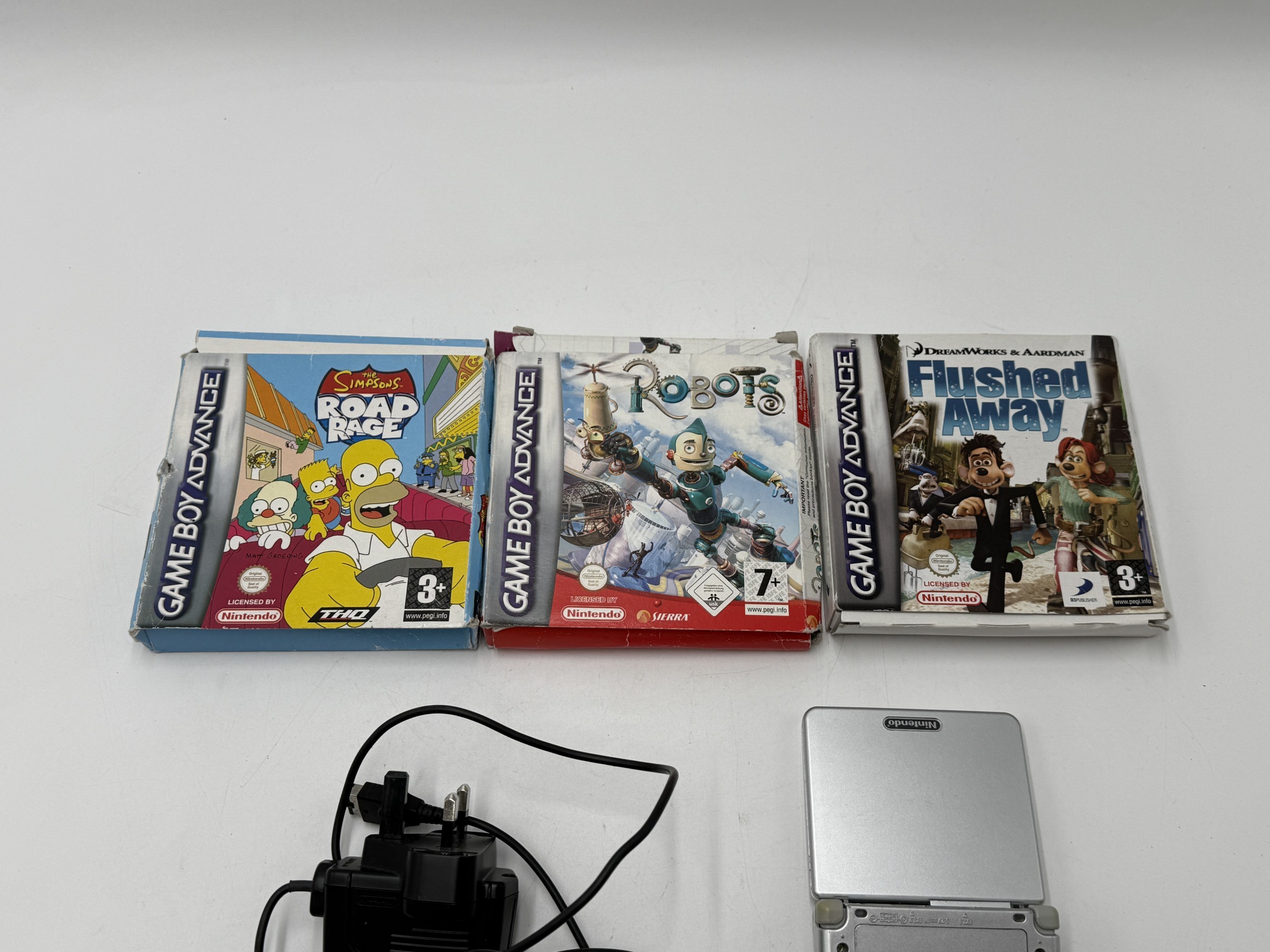 A Nintendo Game Boy Advance SP with four games to include The Simpsons Road Rage, Robots, Flushed Away etc.