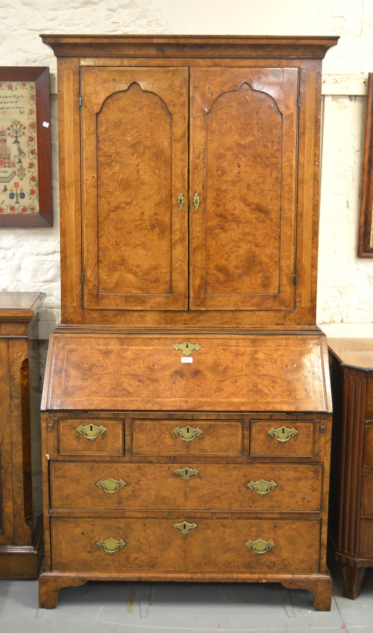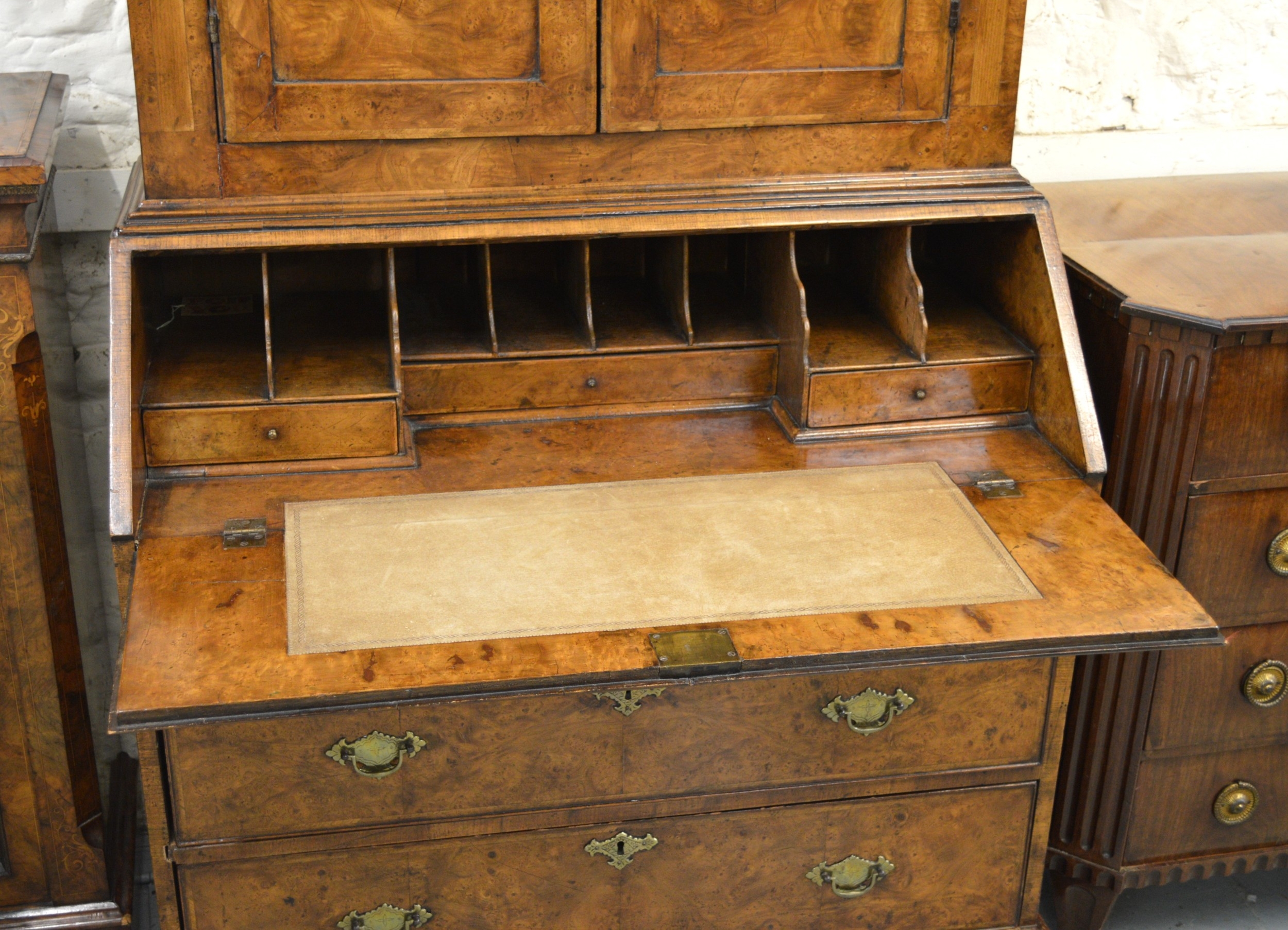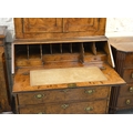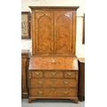 Antique burr elm bureau bookcase with moulded cornice above two panelled doors, the base with a fall front enclosing a fitted interior above drawers raised on bracket feet (18th Century and later), 98 x 52 x 196cm