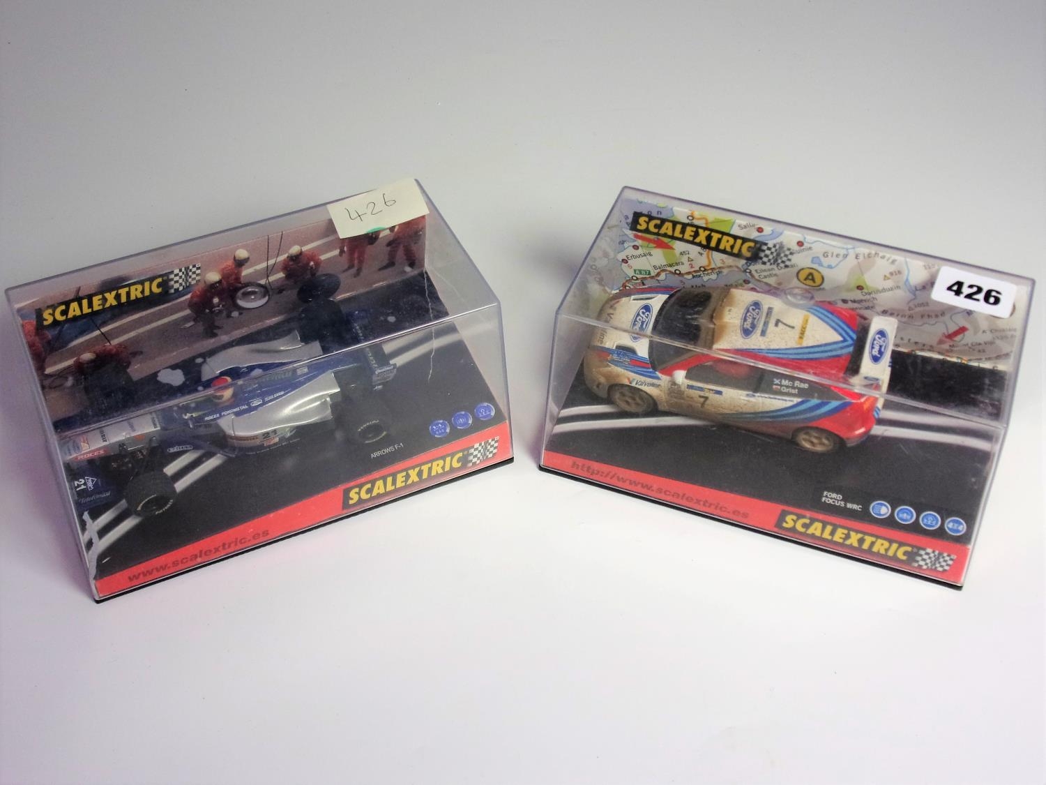 SCALEXTRIC BOXED WEATHERED FORD FOCUS COSTA BRAVA 2000 MODEL REF 6050 MCRAE AND GRIST TOGETHER WITH A SCALEXTRIC 6040 ARROWS F1 AUSTRALIA 99 RACING CAR