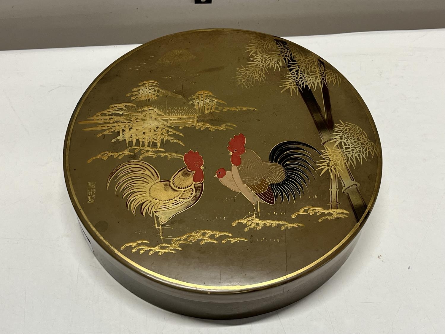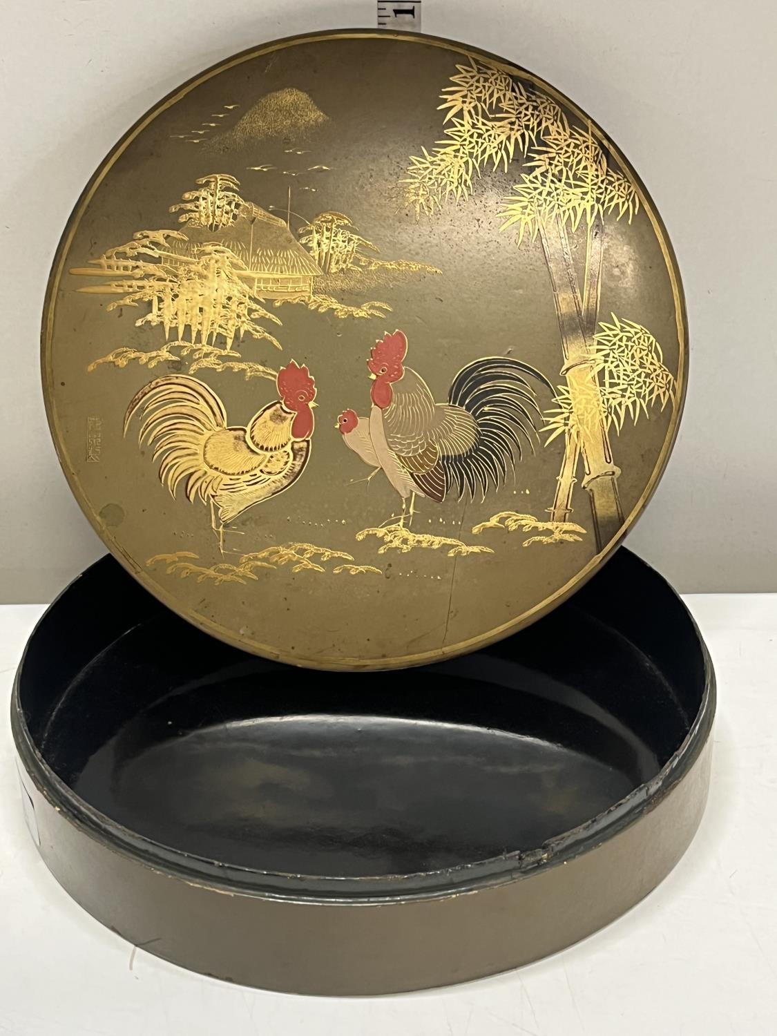 A large Japanese papier mache lacquered circular box circa 1900 d28cm