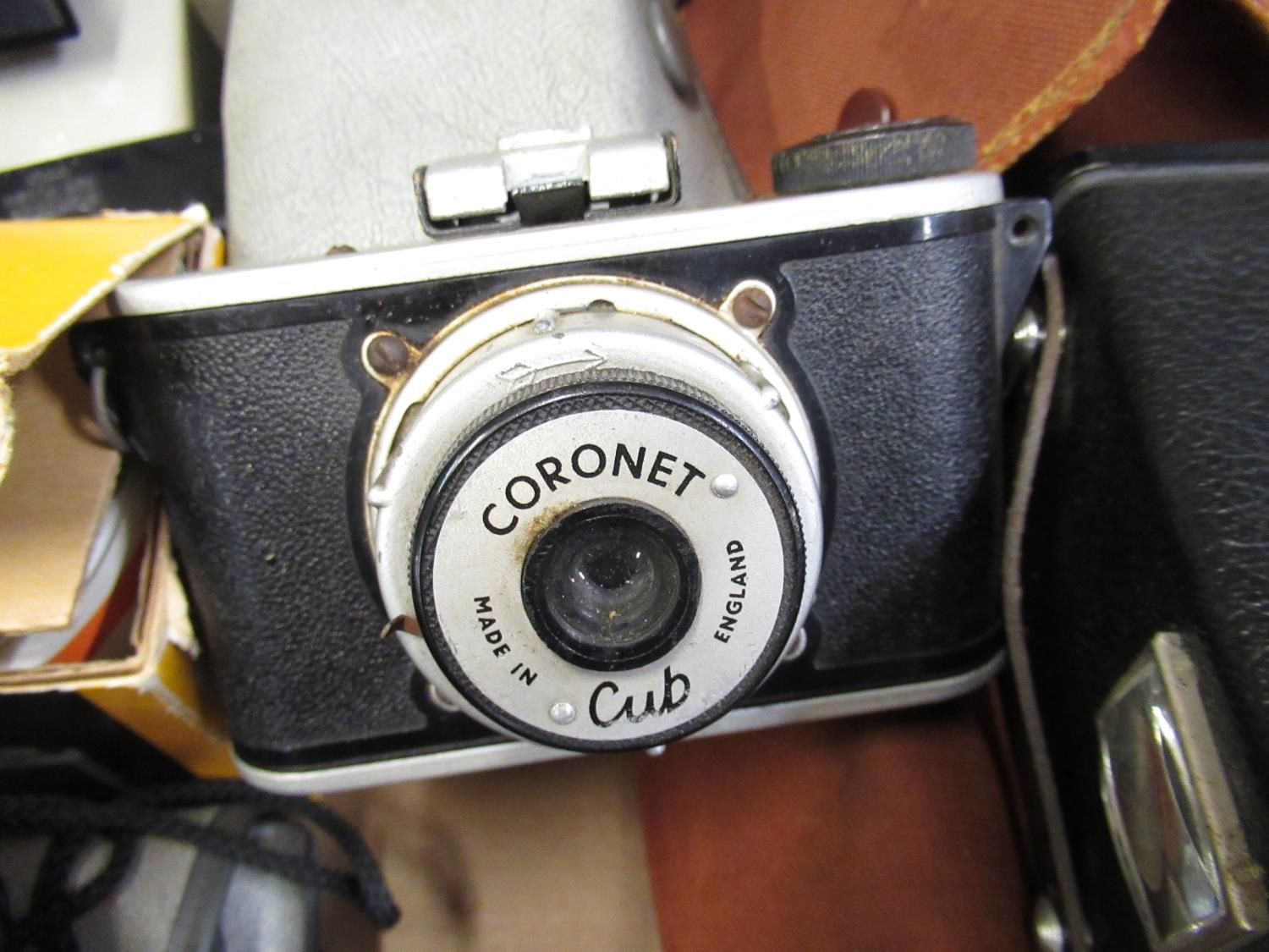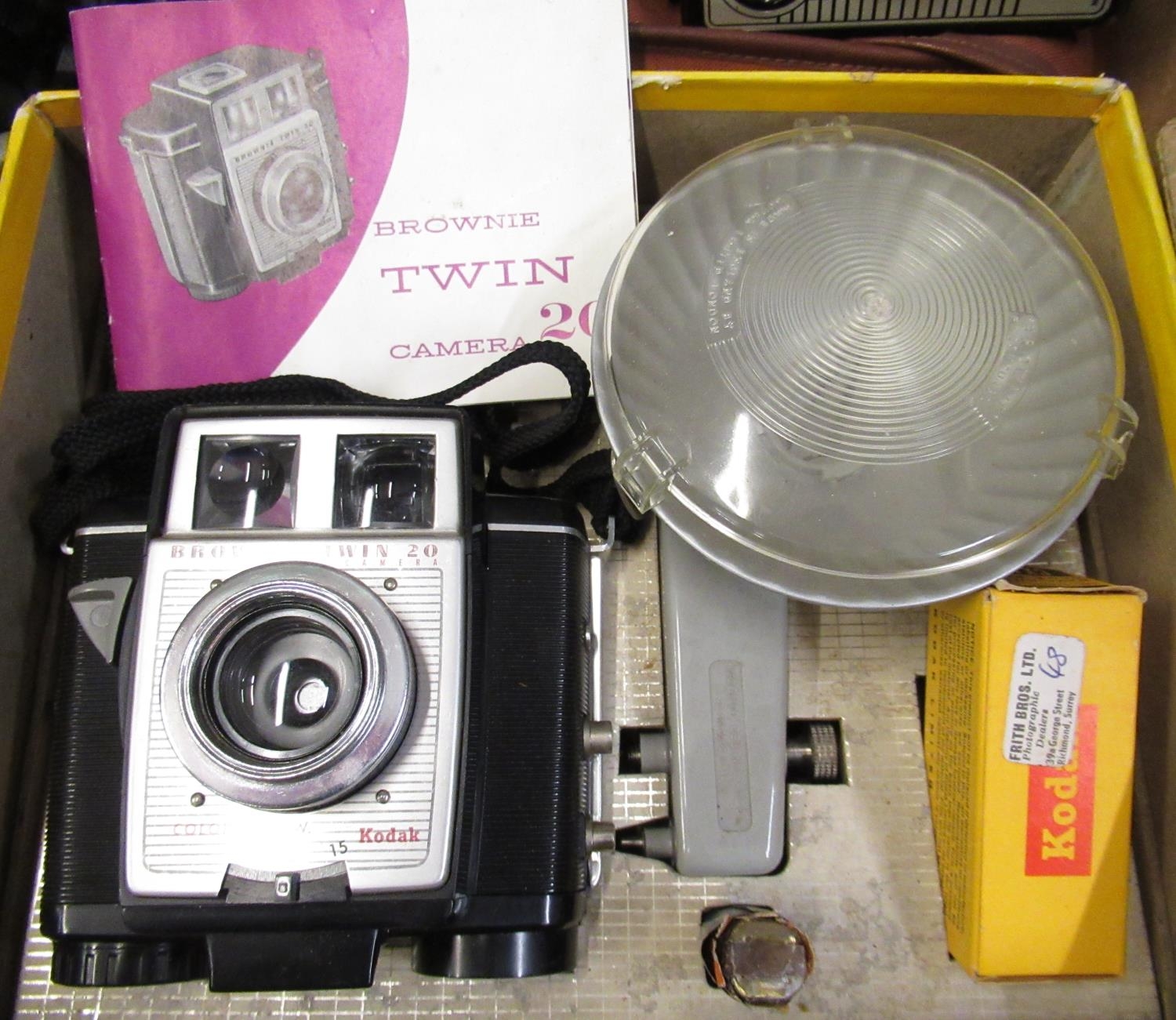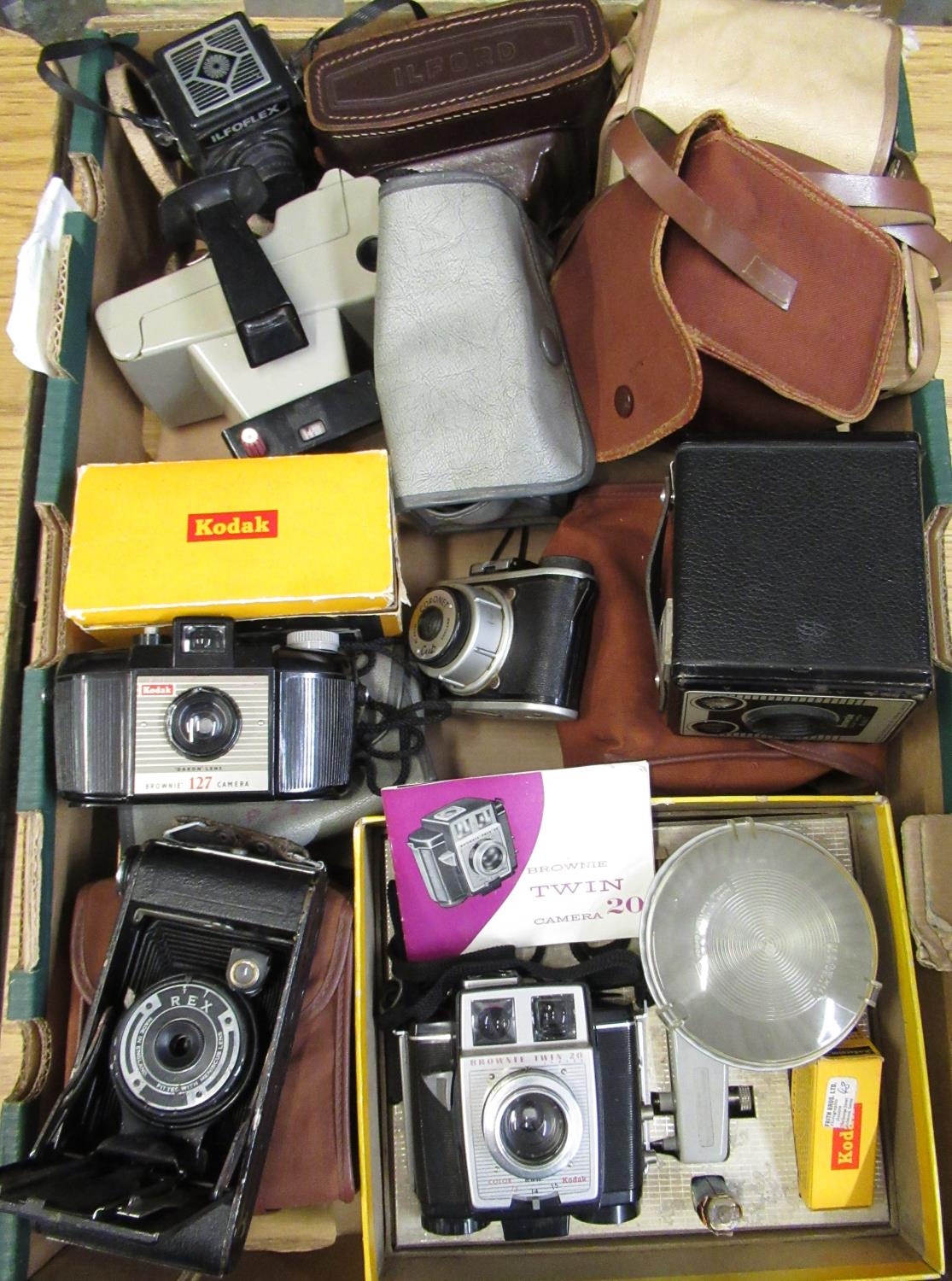 Nineteen Brownie Twin 20 camera, complete with original box, flash gun and instructions, Rex folding pocket camera, Brownie "127" camera, Coronet Cub camera, early Polaroid Swinger land camera and other cameras