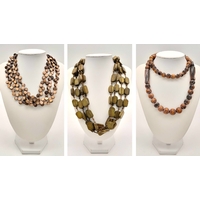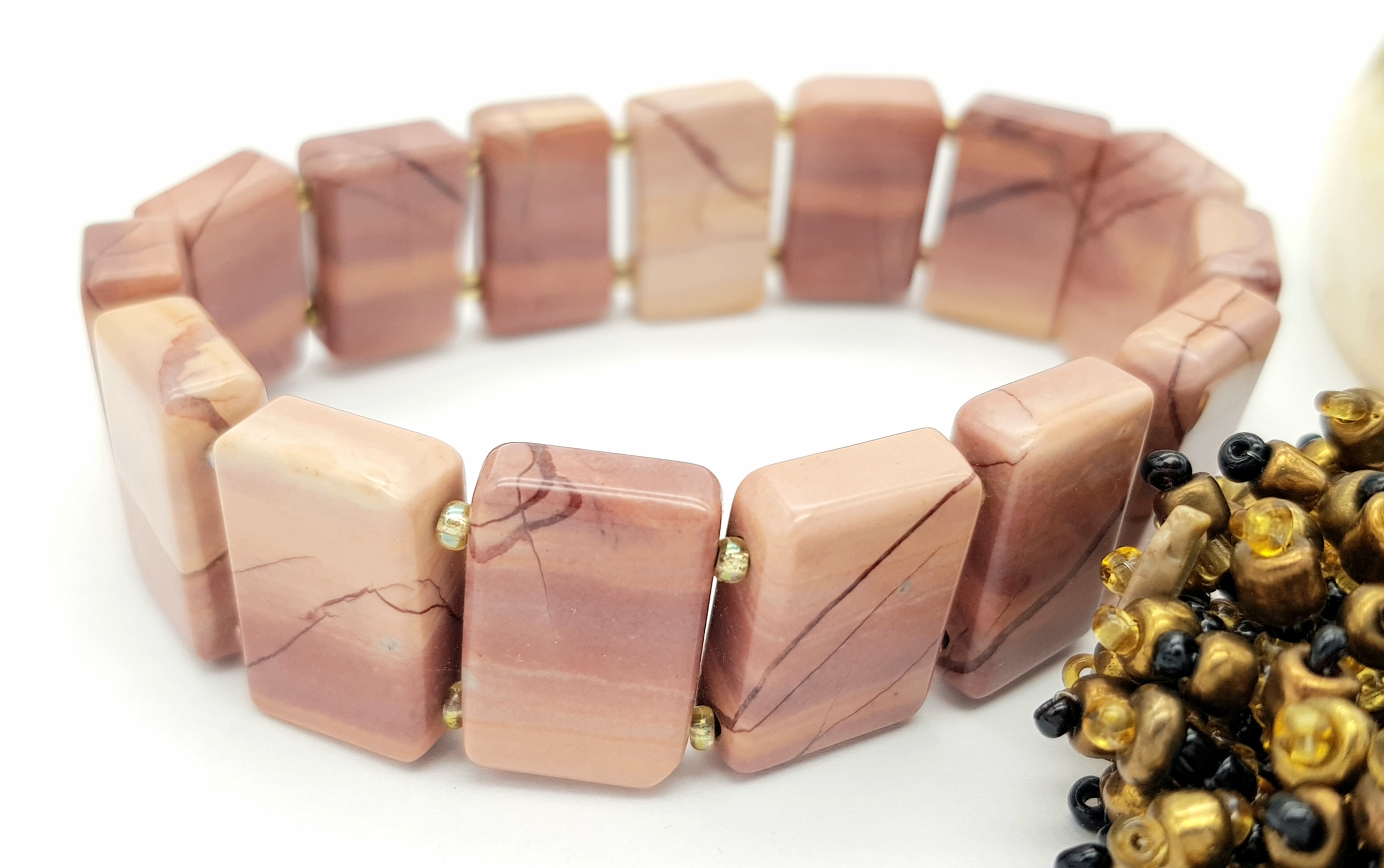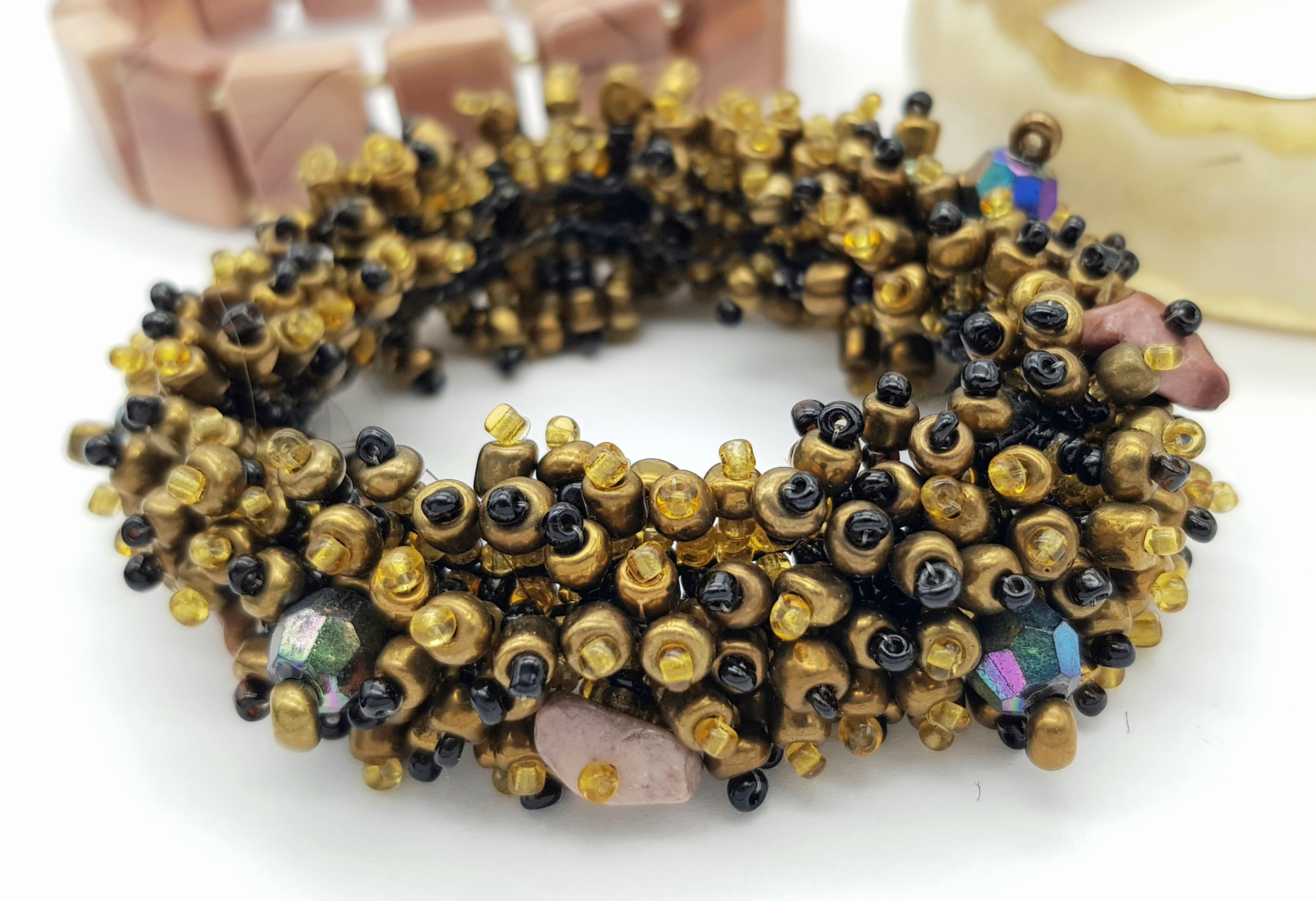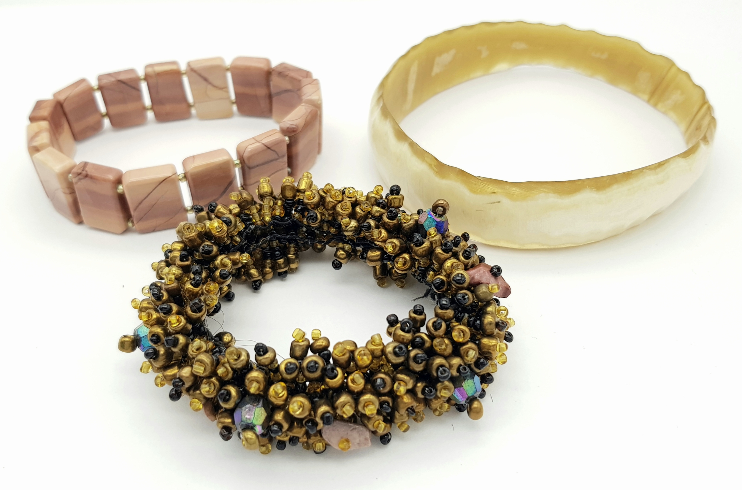 Including a horn-style bangle, a multi-strand beaded bracelet with gold and black beads, and a stretch bracelet set with rectangular pink-toned square panels. Please see photos or request a condition report.