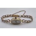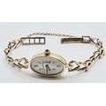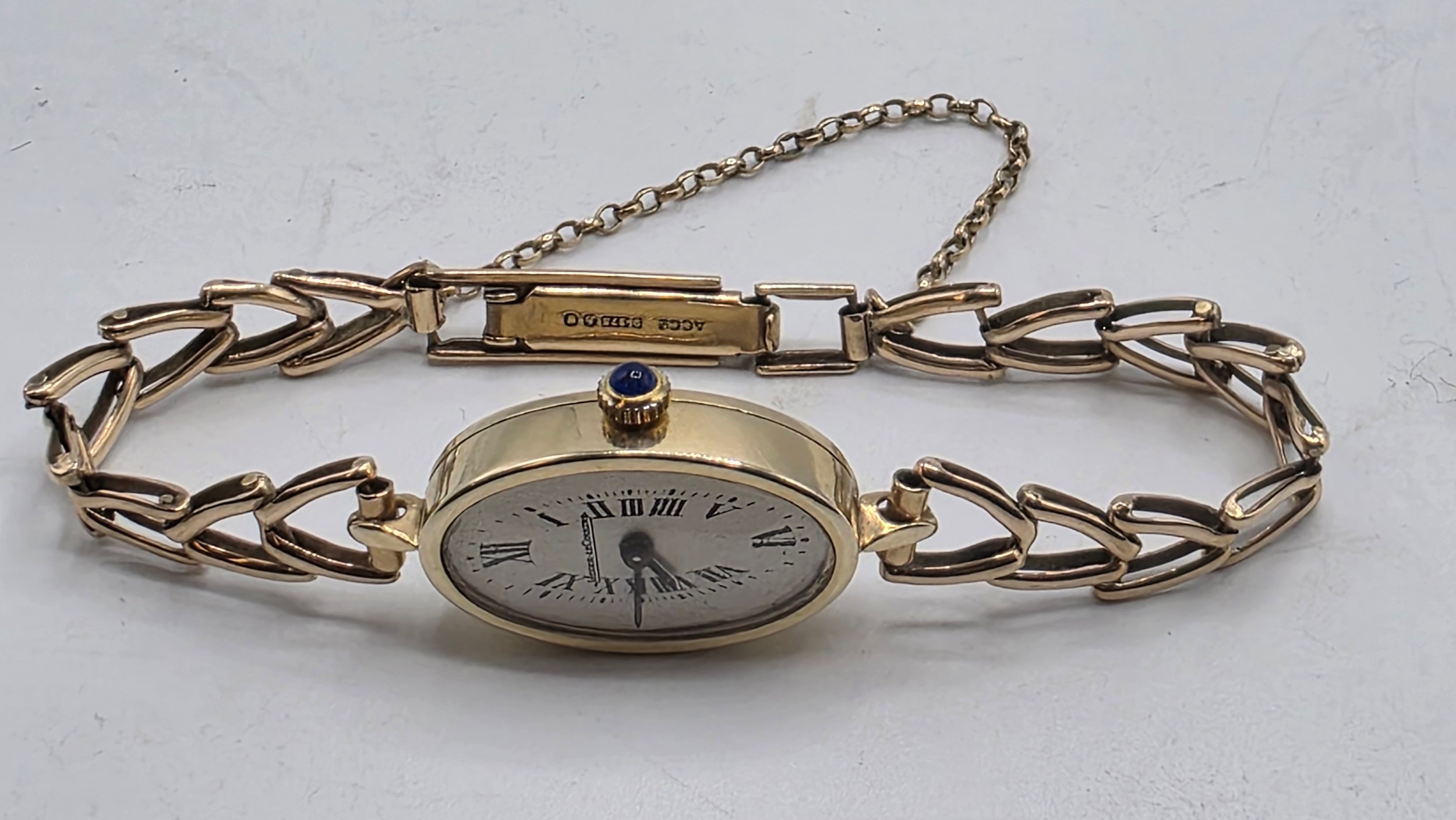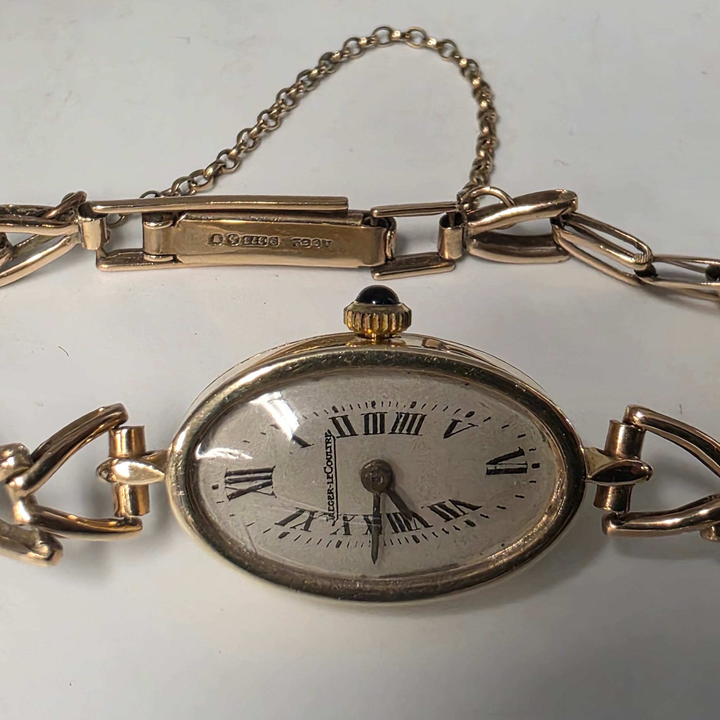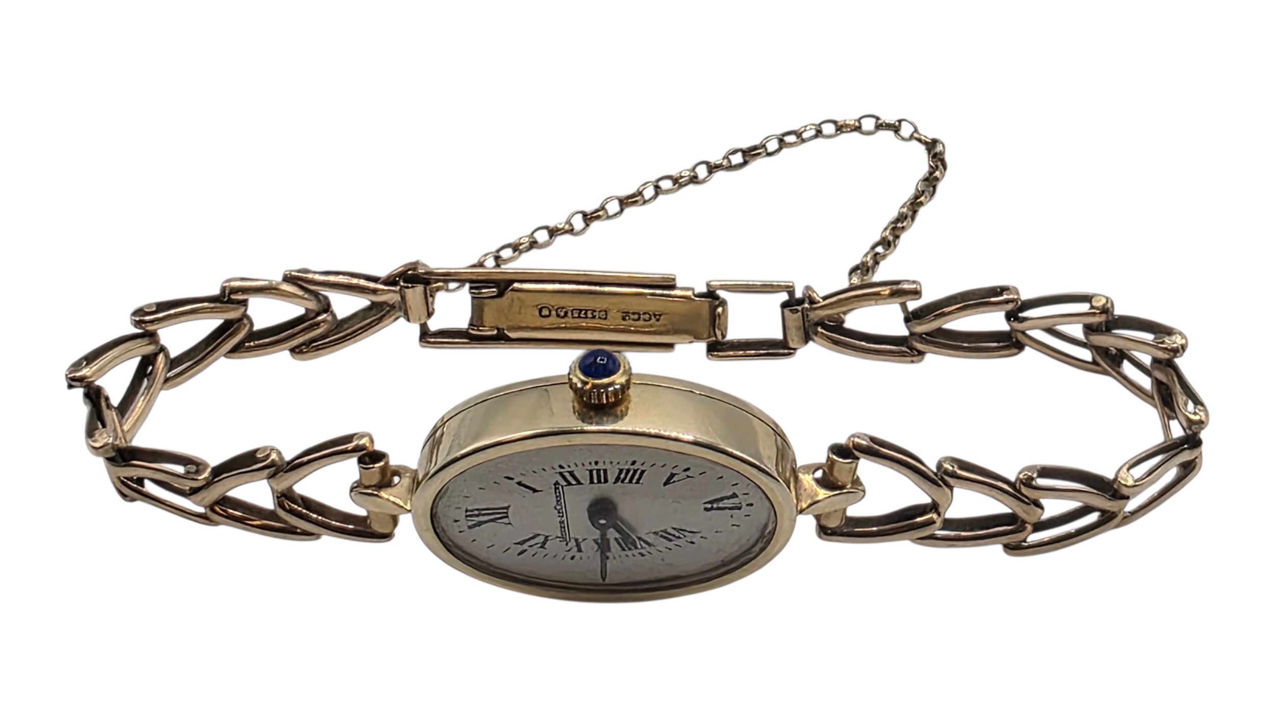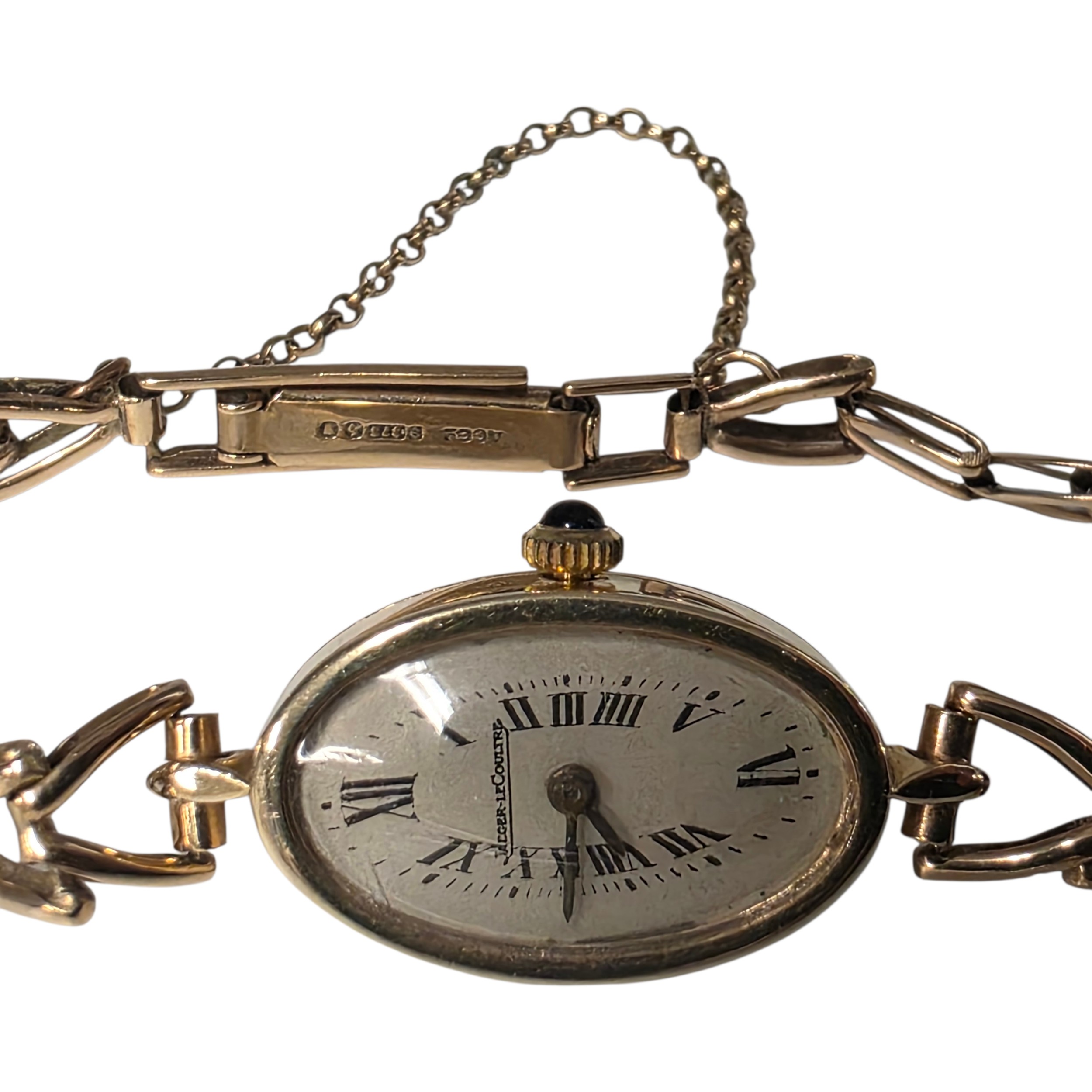 A Jaegar Le Coultre 14k gold ladies wristwatch on a 9ct gold bracelet strap. Oval 21mmx 15mm case with champagne dial and roman numeral markers and sapphire set crown. Possibly replacement movement. Gross weight 11.5g