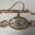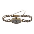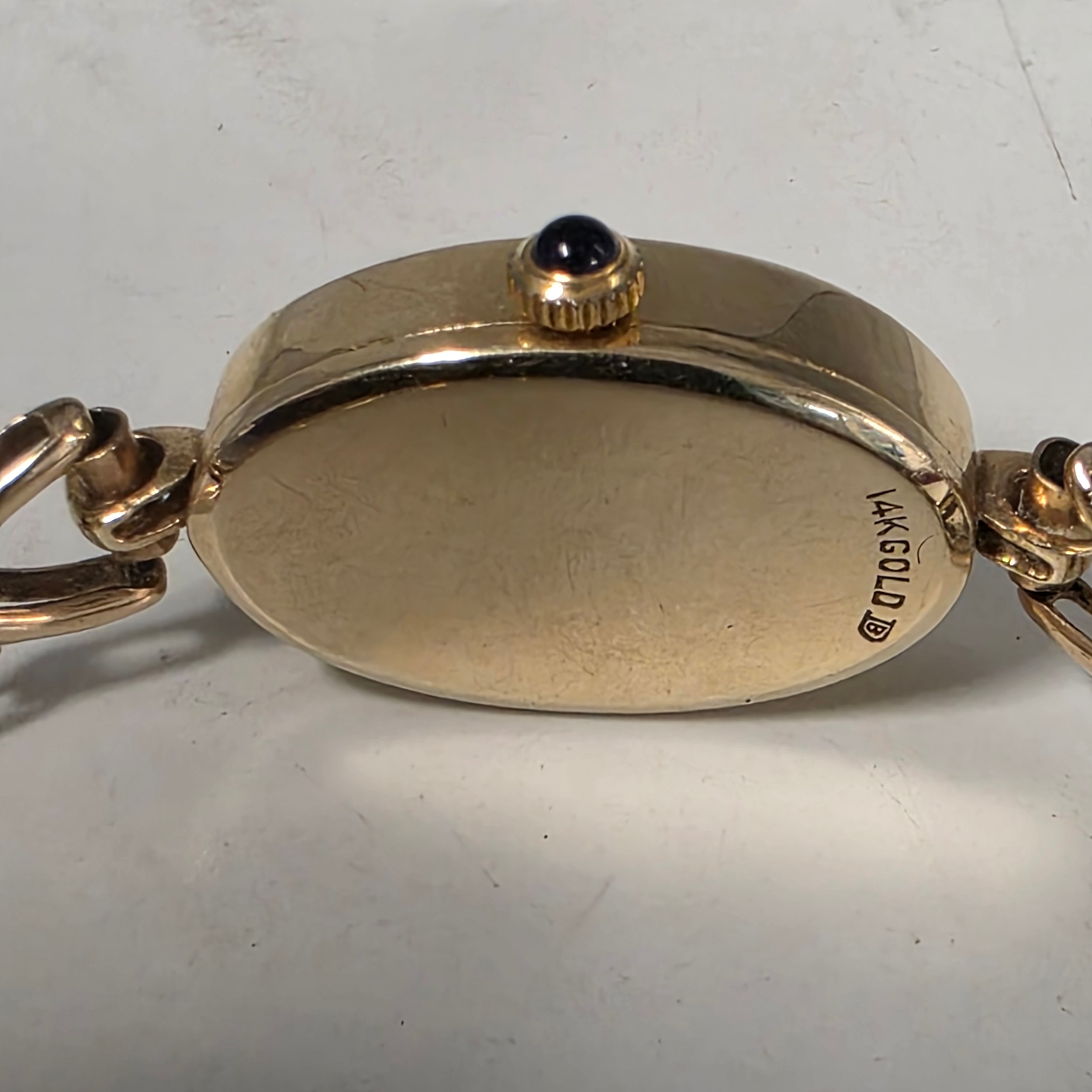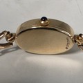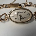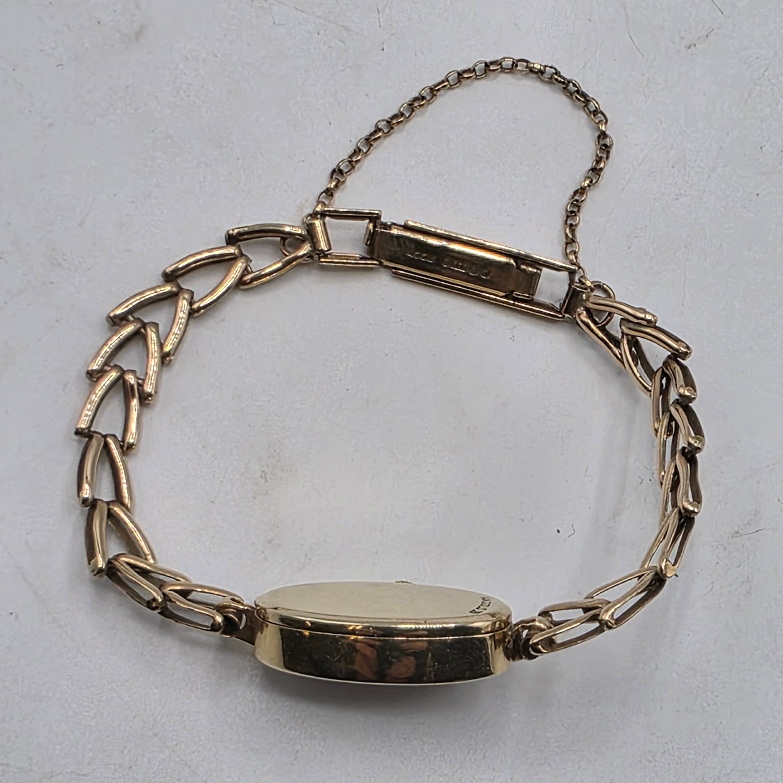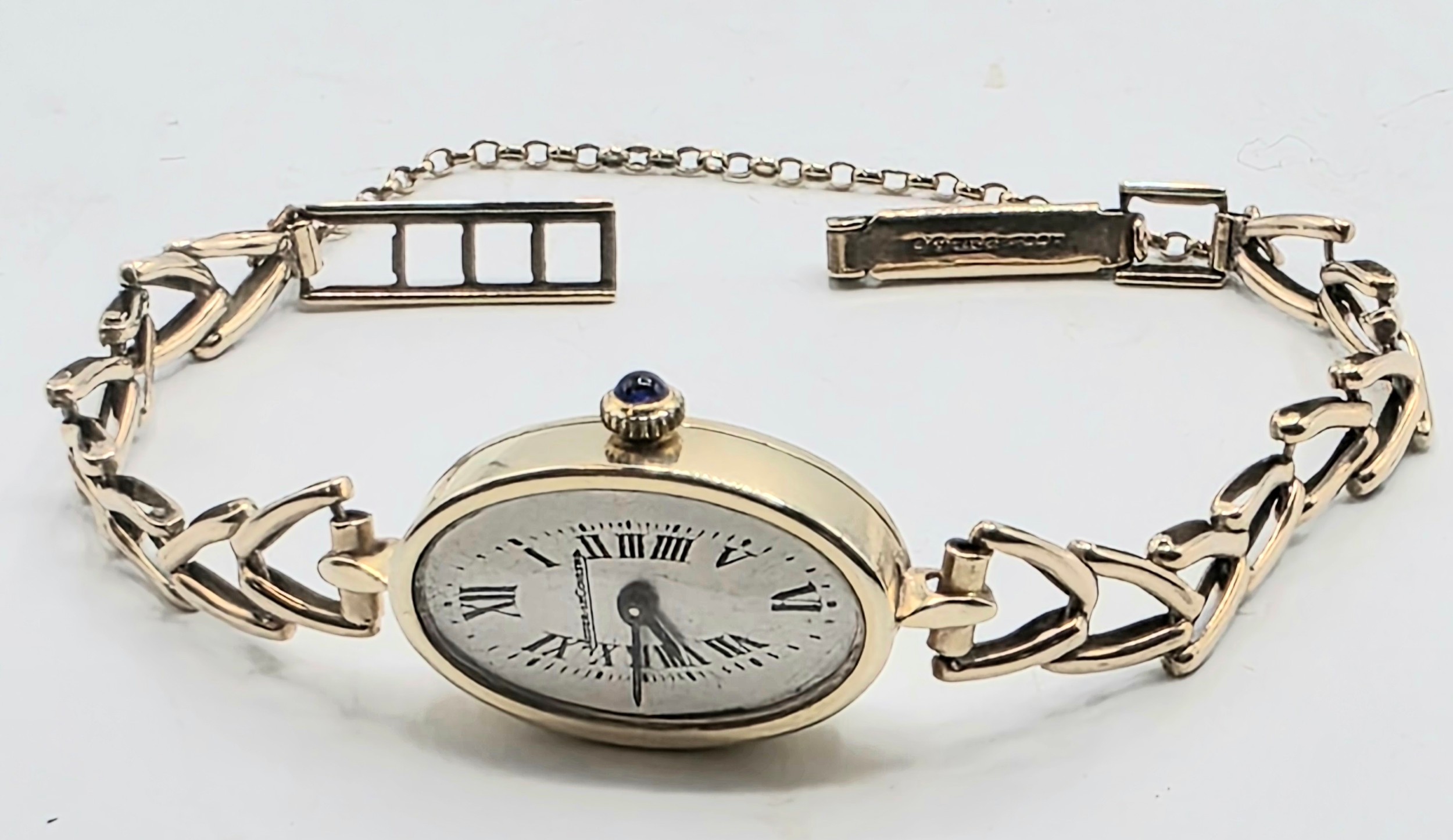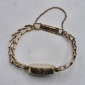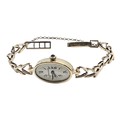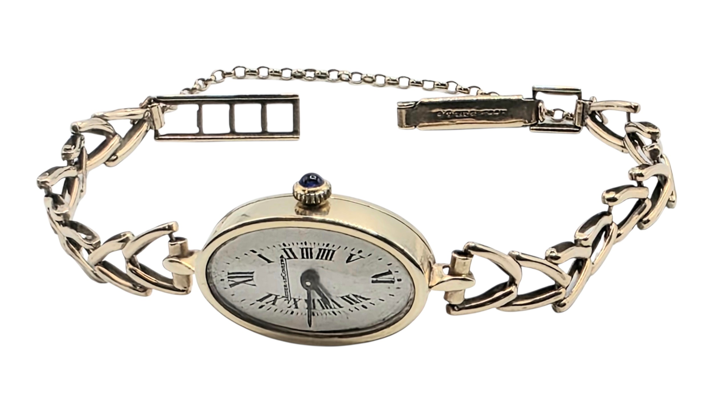 A Jaegar Le Coultre 14k gold ladies wristwatch on a 9ct gold bracelet strap. Oval 21mmx 15mm case with champagne dial and roman numeral markers and sapphire set crown. Possibly replacement movement. Gross weight 11.5g