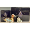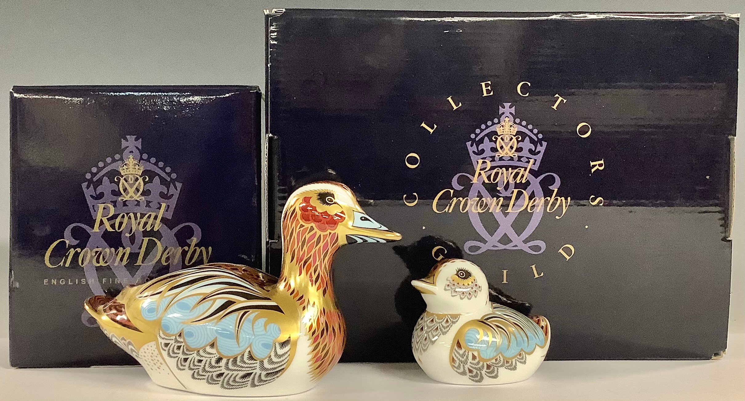A pair of Royal Crown Derby paperweights, Collectors Guild Duck, and Collectors Guild Duckling, both exclusive for the Royal Crown Derby Collectors Guild, gold stoppers, printed marks, boxed