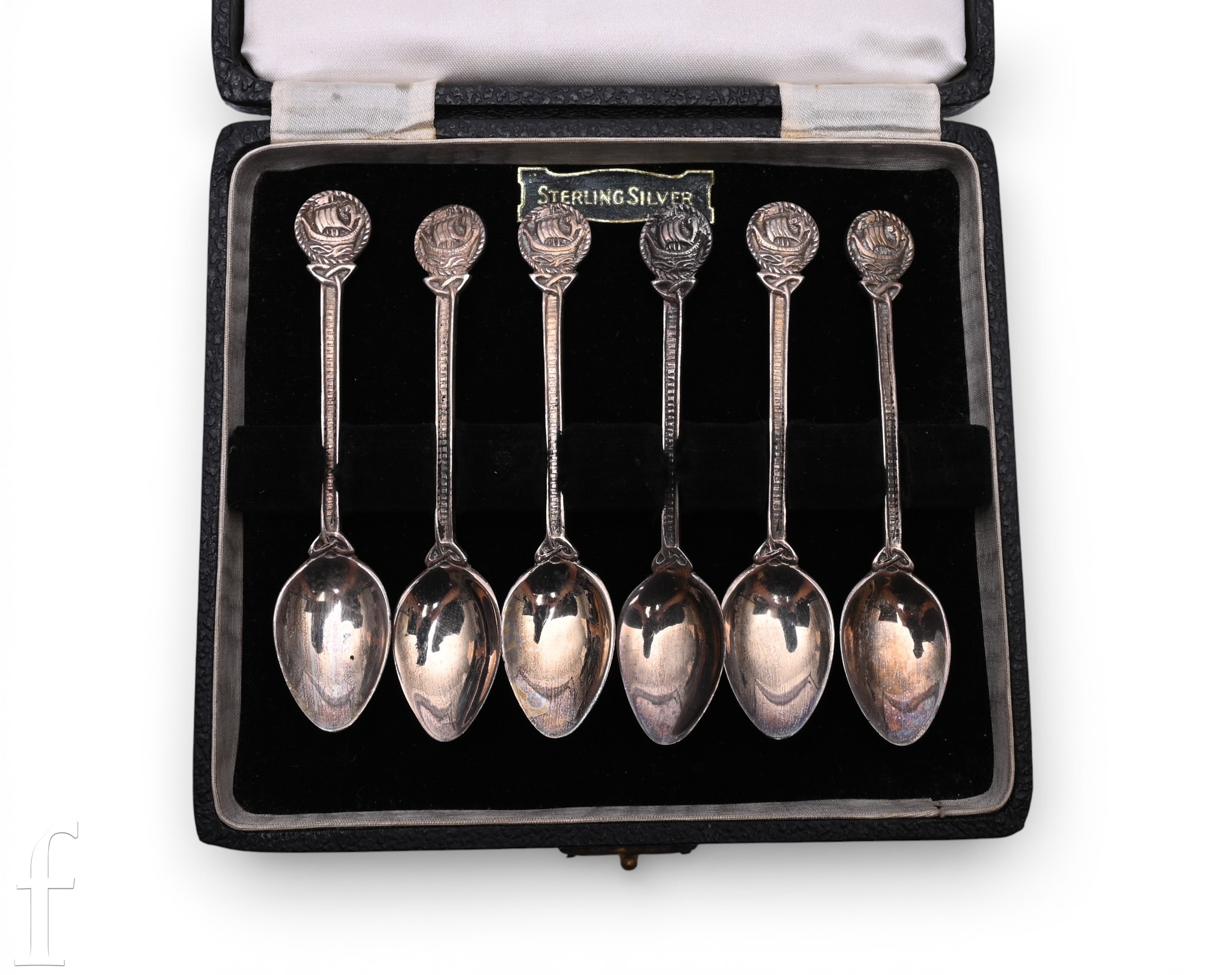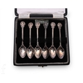 A cased set of six mid 20th Century silver teaspoons, with Viking longship terminals, Chester 1958, combined weight 2.21ozt.