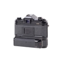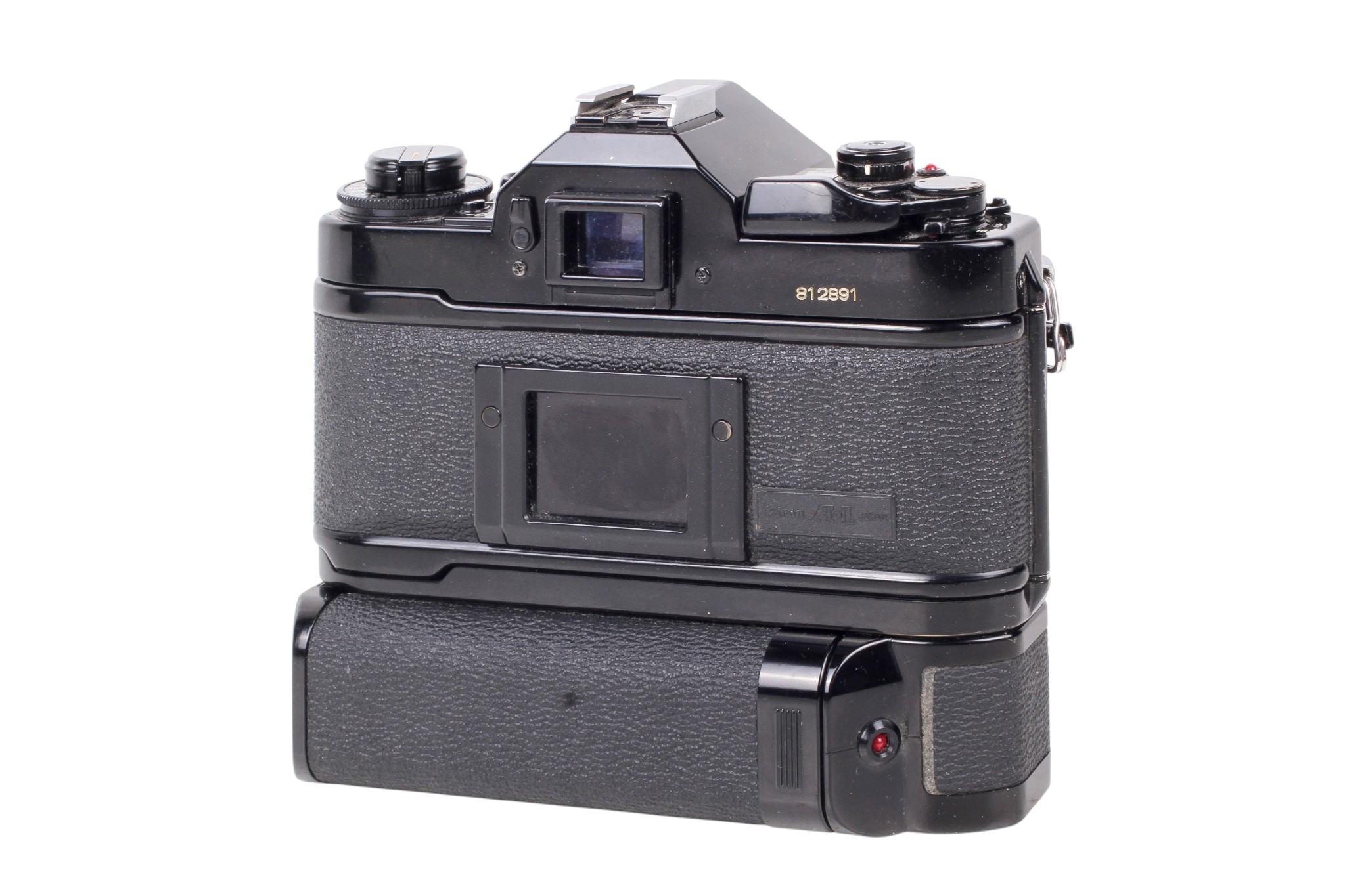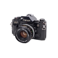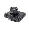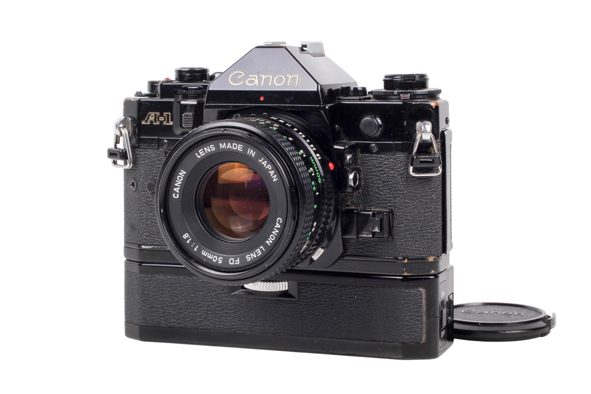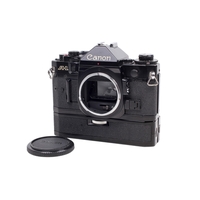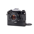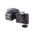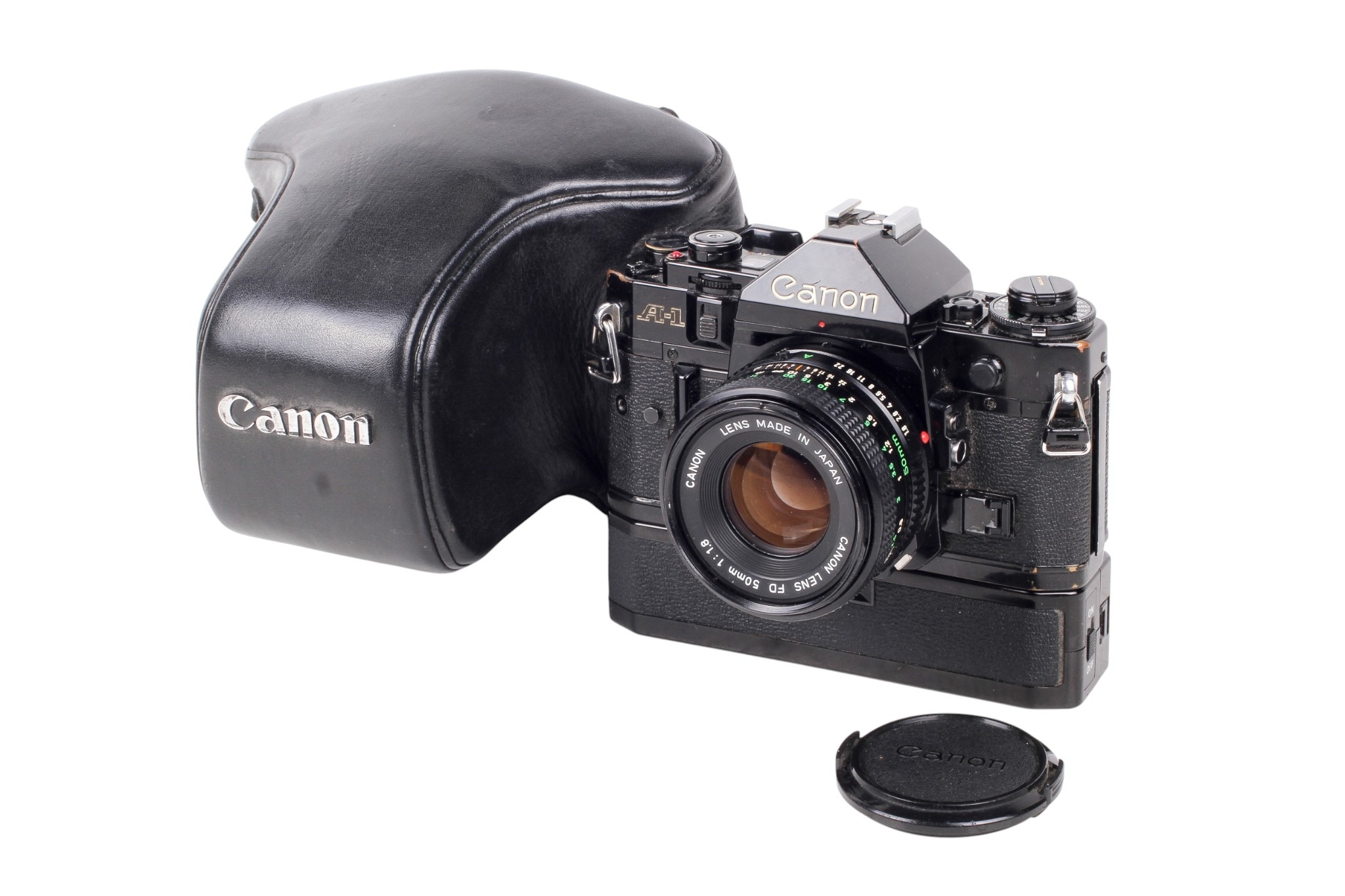 A Canon A-1 35mm SLR camera. Black. Serial number 812891. With a Canon FD 50mm f1.8 lens, optics VG. Together with caps, Canon Power Winder A, and ERC. Shutter and Power Winder working.