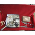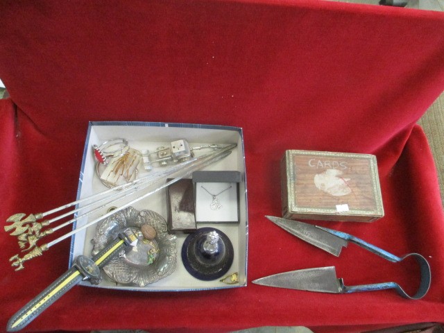 MIXED BOX, COSTUME JEWELLERY GILLETTE RAZOR IN BAKELITE BOX, CHILBLAIN REMEDY TIN, TOASTING SKEWERS, DIGGER TRUCK STYLE CLOCK ETC