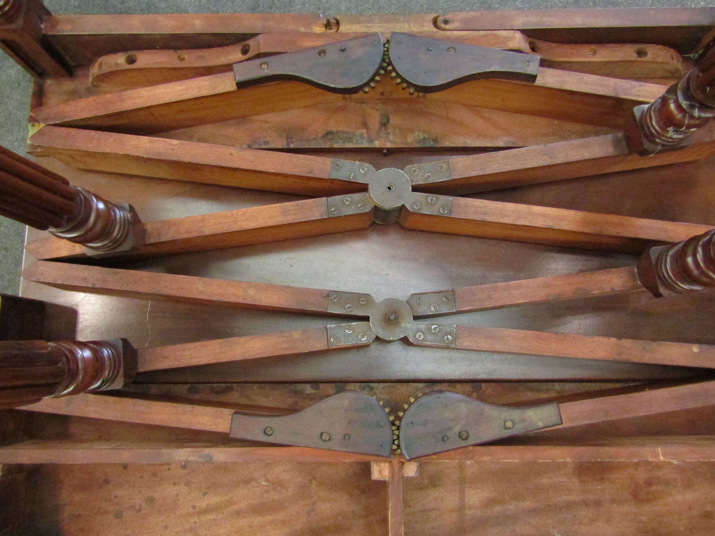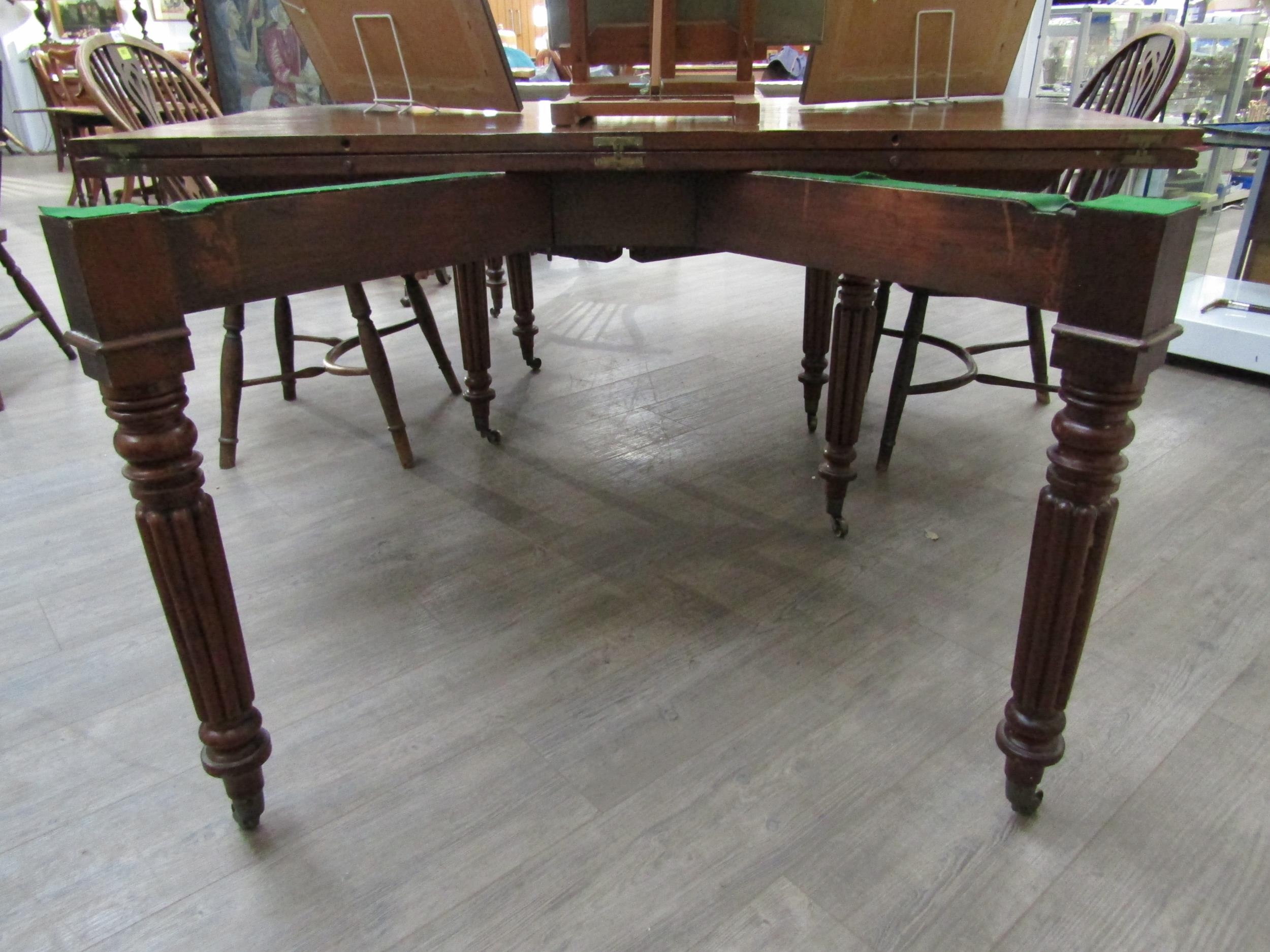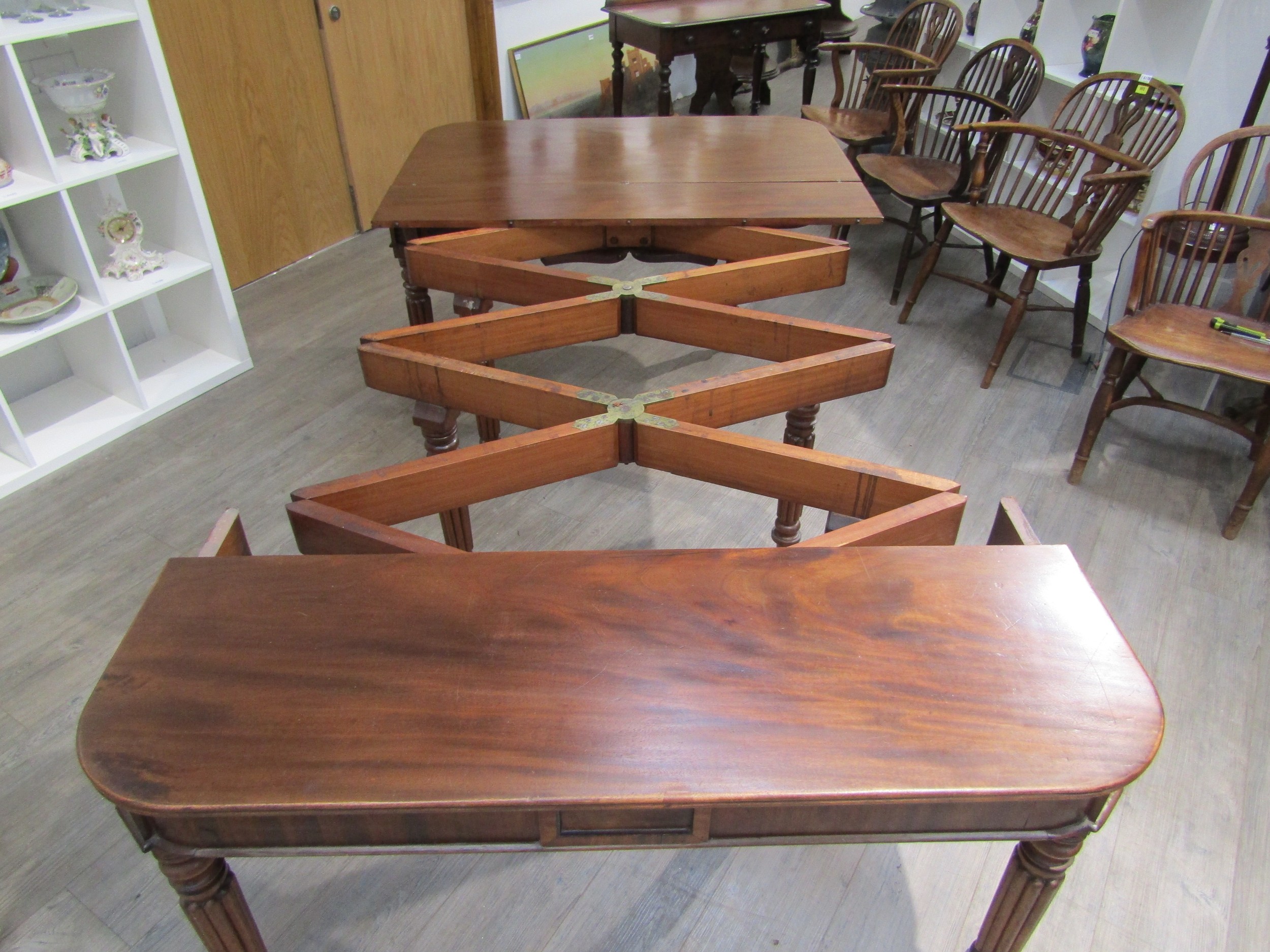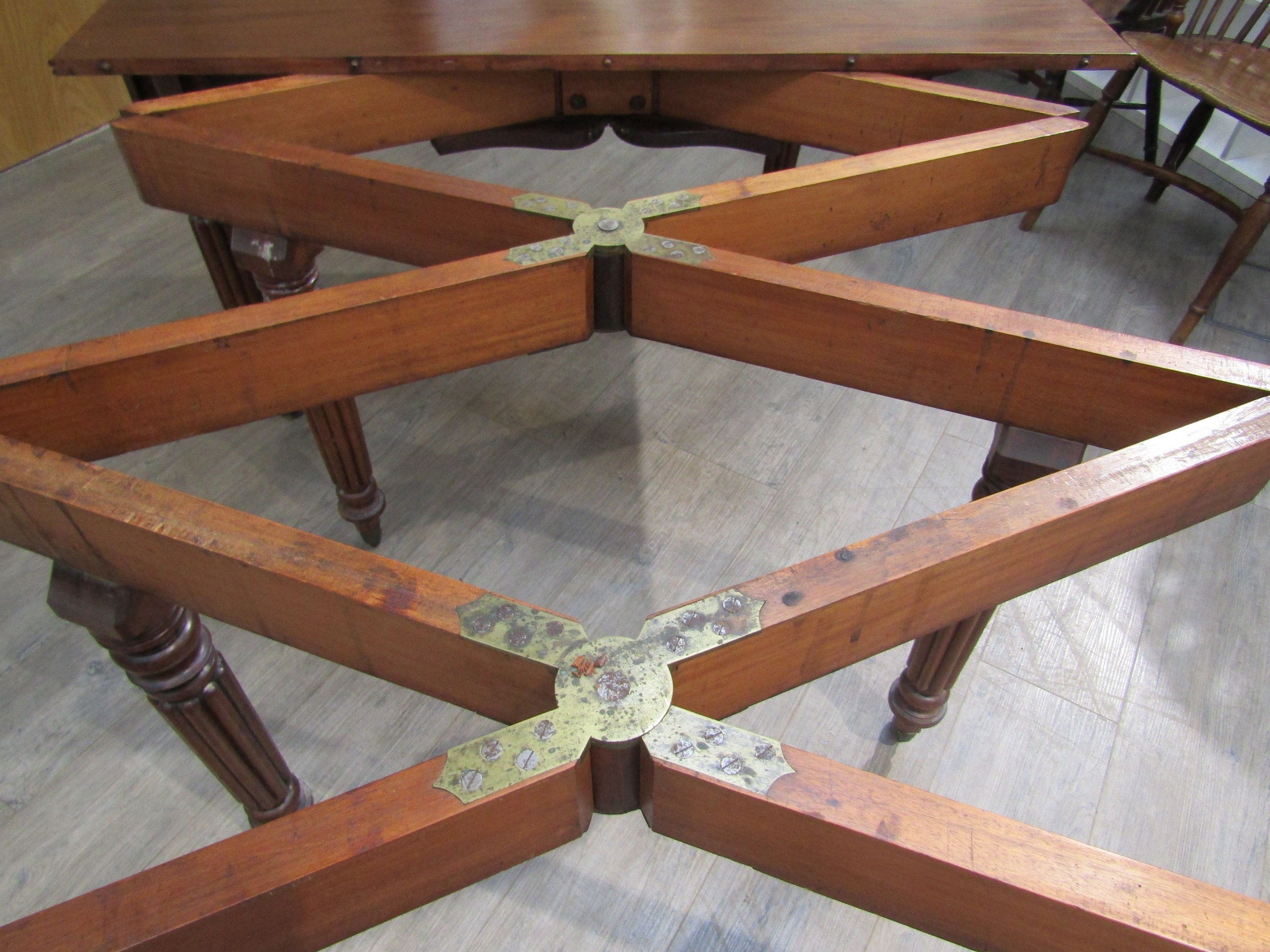 A Georgian mahogany concertina action extending dining table of rounded square form raised upon six melon-fluted legs, with two large and one small extra leaf, with brass fixing brackets (a/f) 259cm long extended