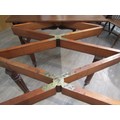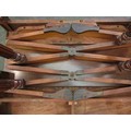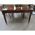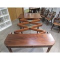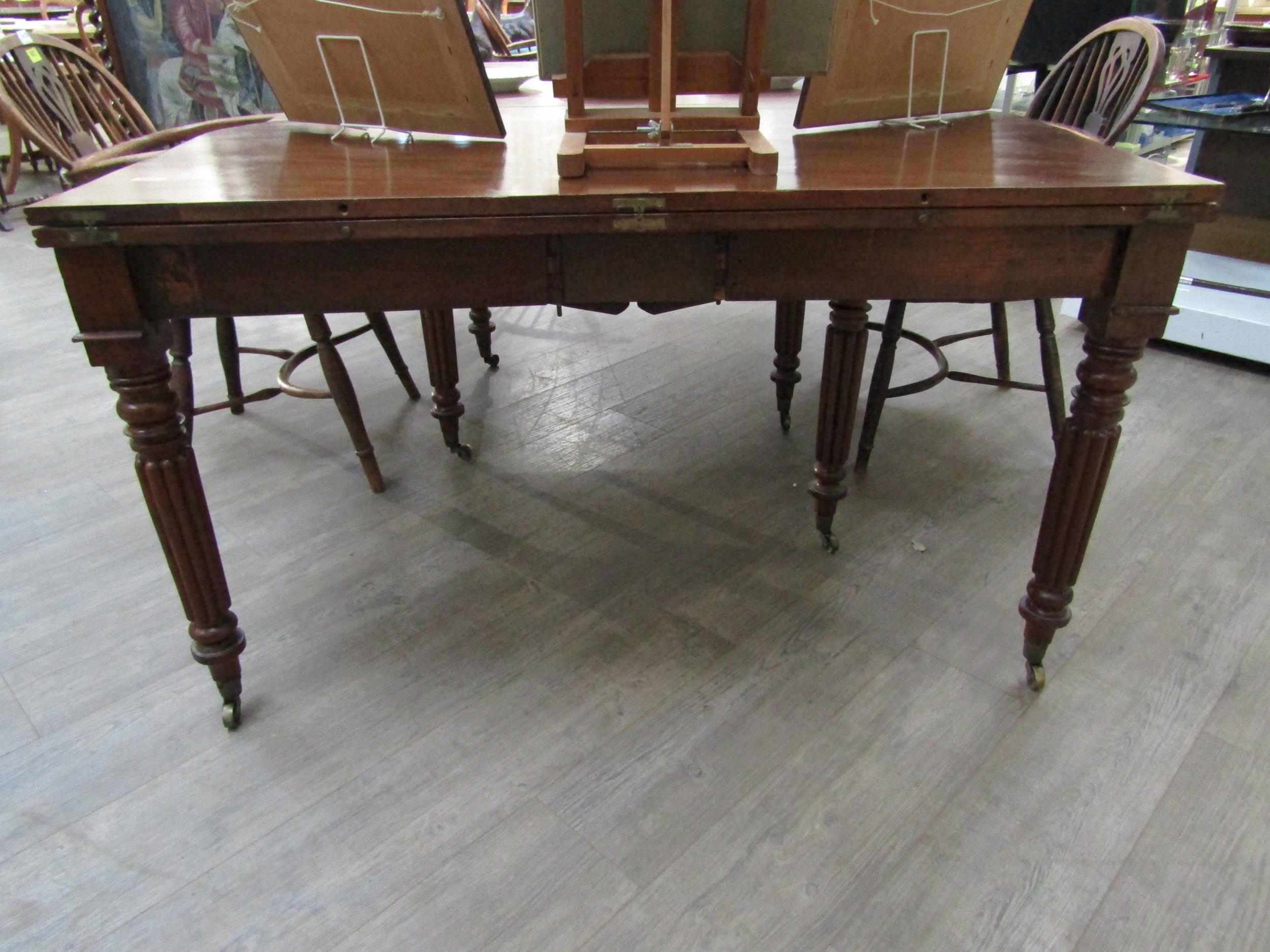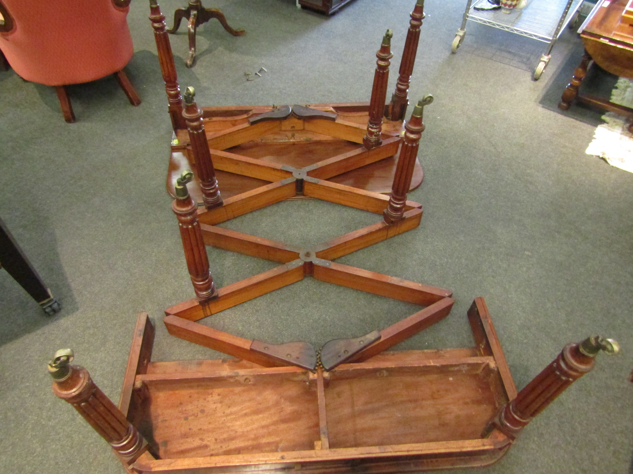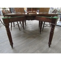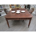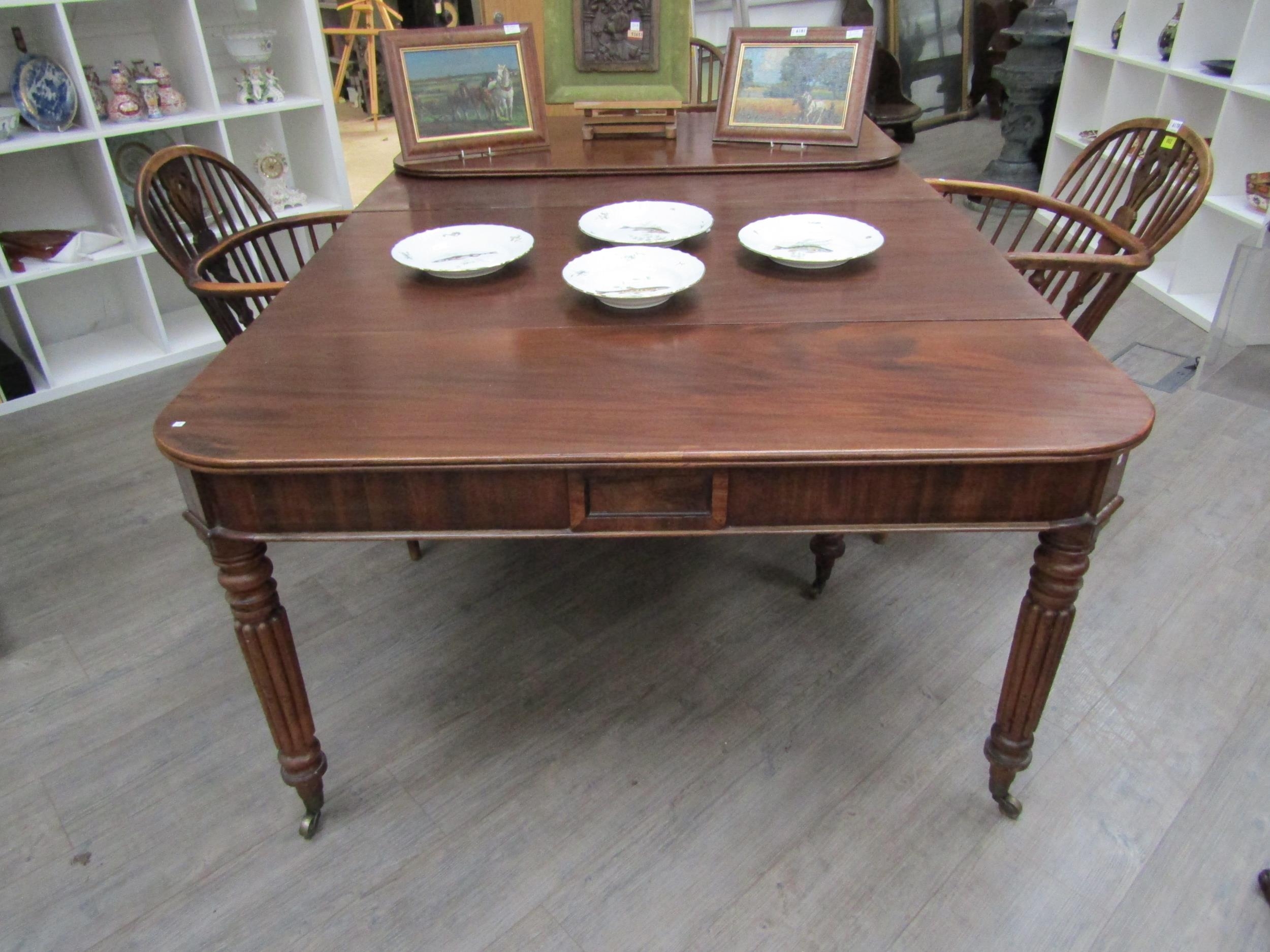 A Georgian mahogany concertina action extending dining table of rounded square form raised upon six melon-fluted legs, with two large and one small extra leaf, with brass fixing brackets (a/f) 259cm long extended