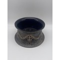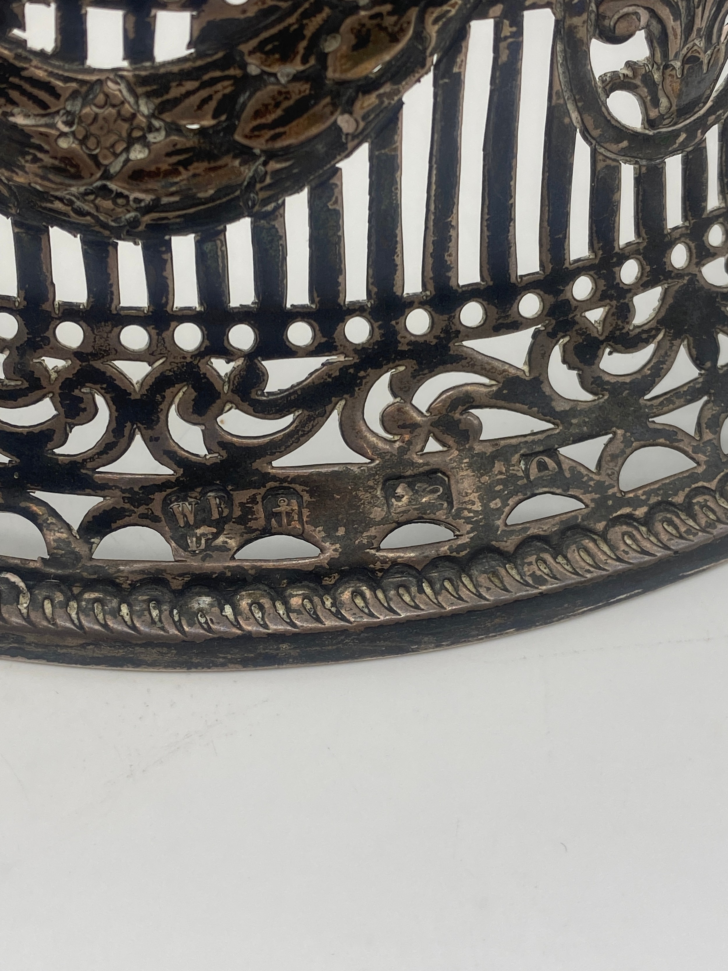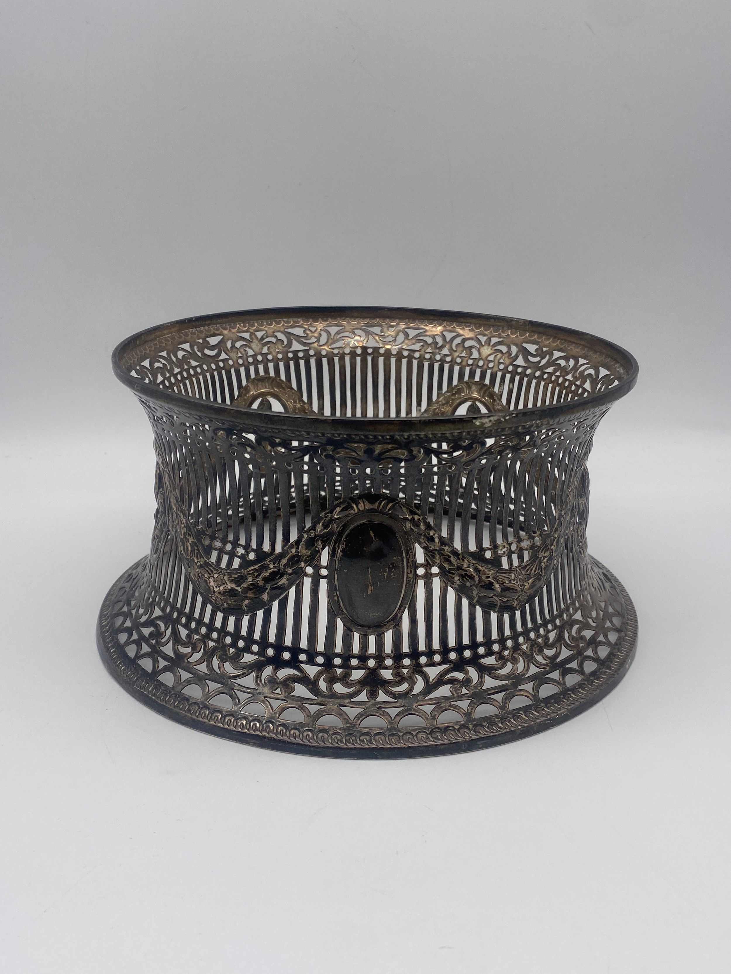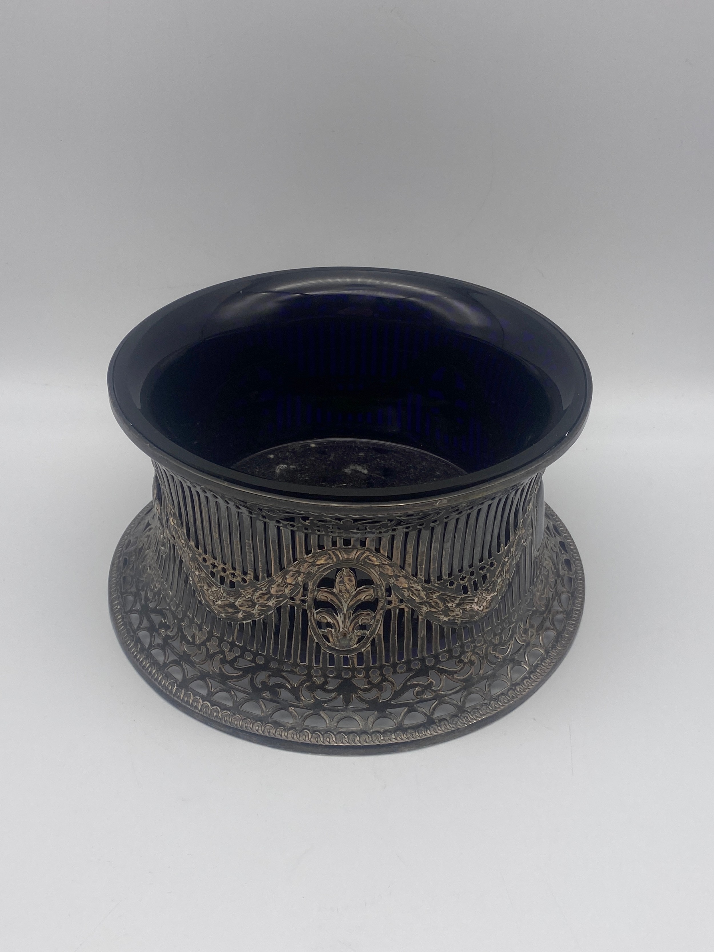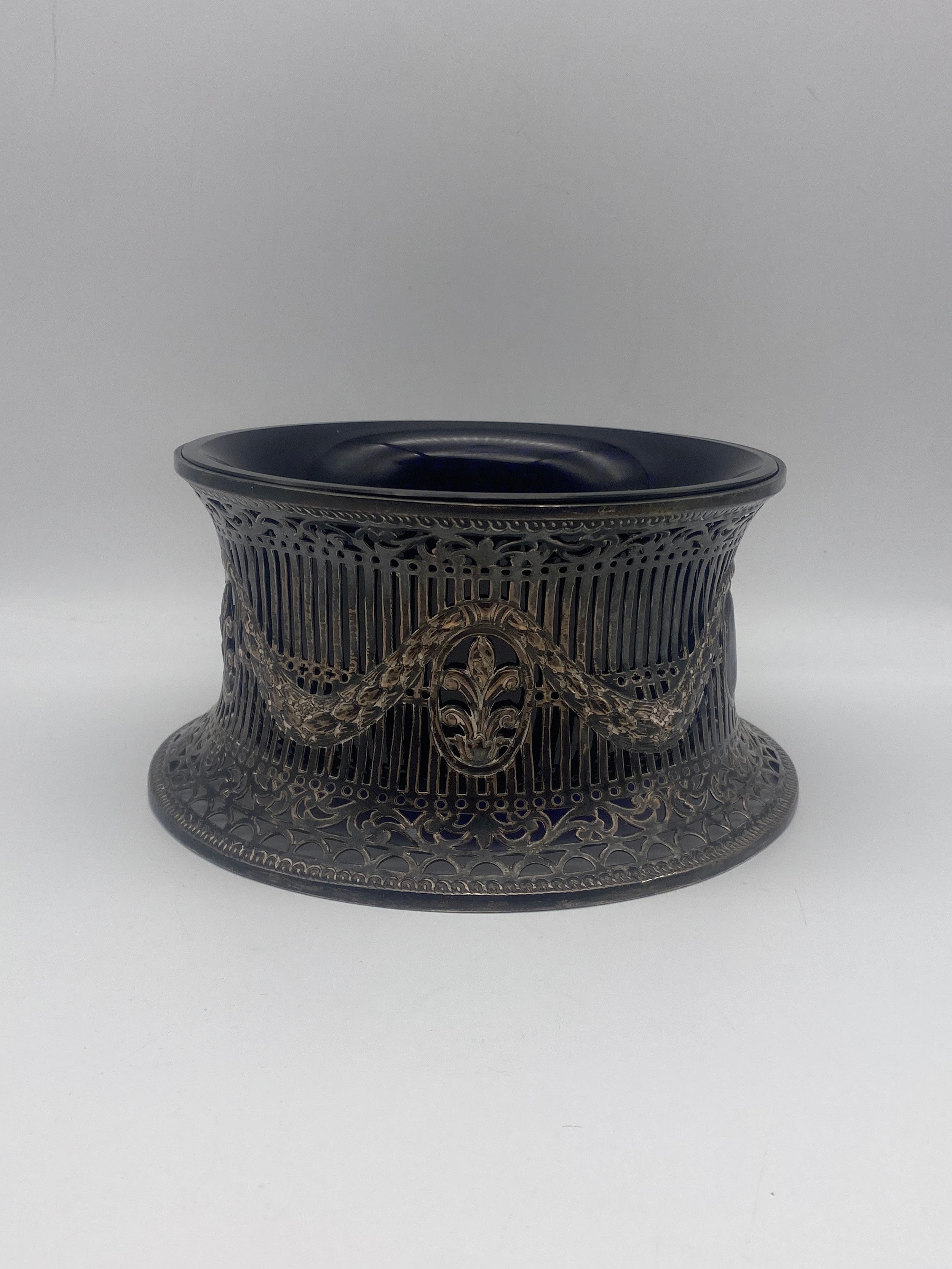 BIRMINGHAM SILVER NEOCLASSICAL FILIGREE TAPERED STAND WITH BLUE GLASS LINER (silver 9OZ approx.)
